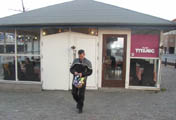 såg ud som en hyggelig pølsekiosk/cafe. Indenfor var der duge og blomster på borden.