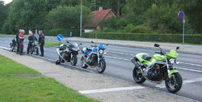 John (grøn Speed Triple 1998), Mogens (grøn Tiger 100ss 1965) og Kim (mørkeblå