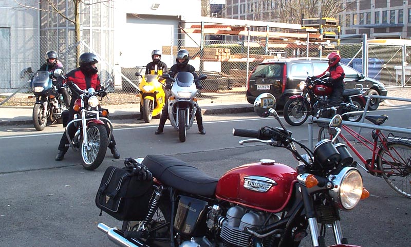 en skøn tur. Rikke og Nina på hver sin nye rødmetallic Bonneville, Lis på en gul