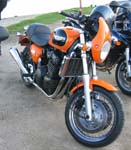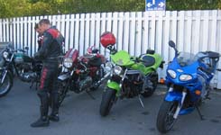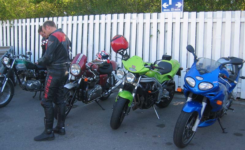 sin sølvfarvede Daytona fra 2000, John på sin grønne Speed Triple fra 1998,