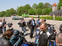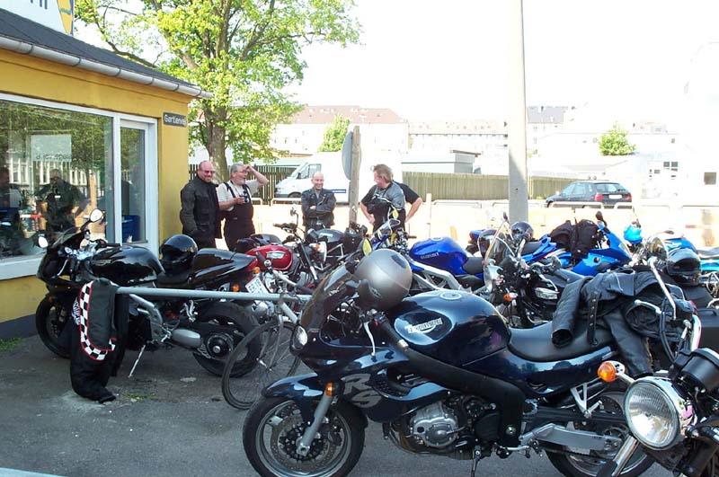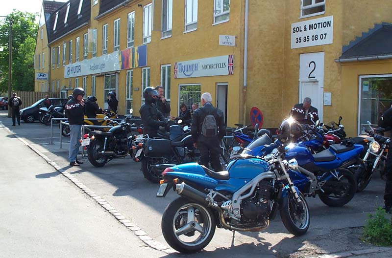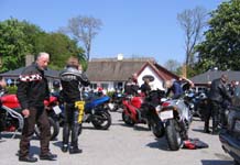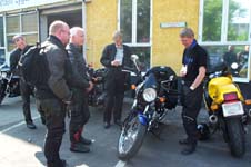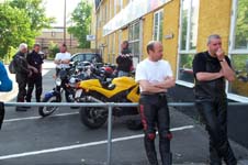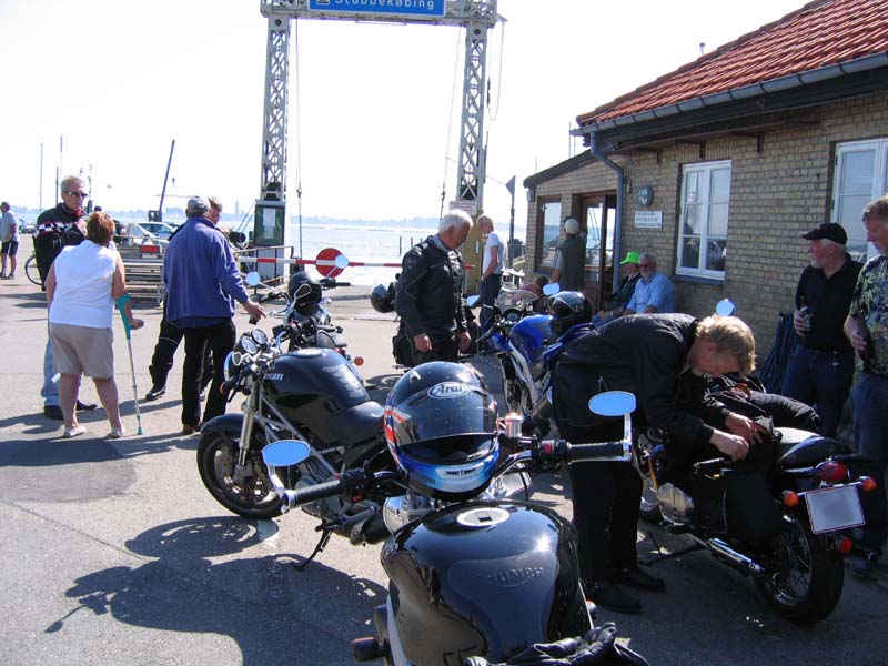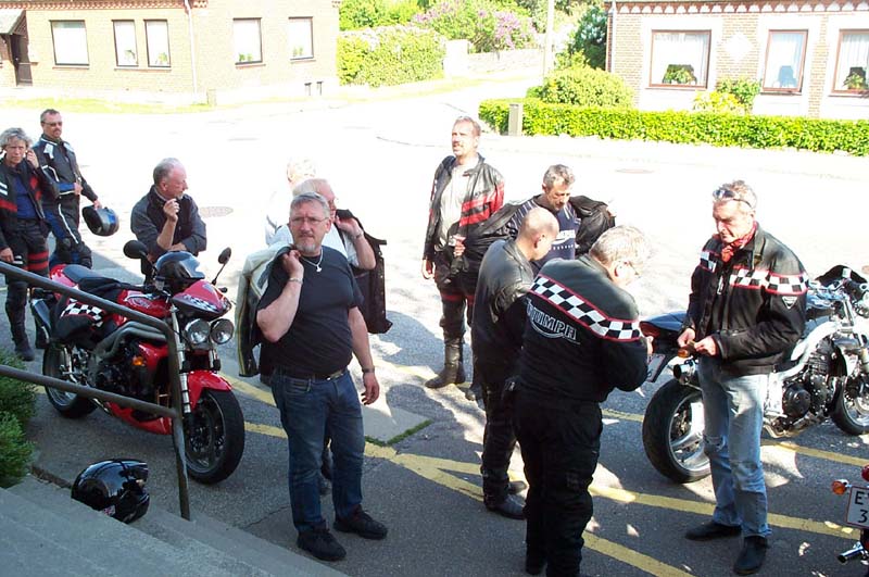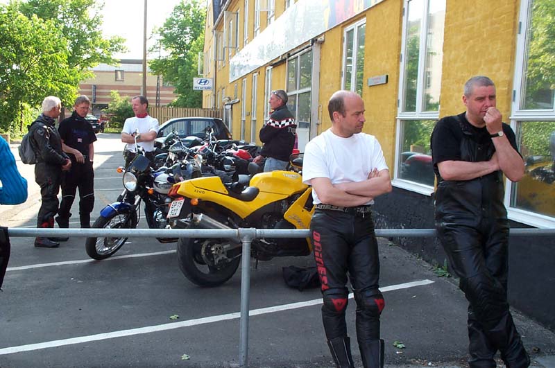 Vi skulle checke deltagerne før afgang. Der var Ib på en sort Daytona 955 fra 2003