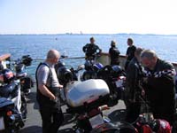 på færgen. Der er mange gående der venter på færgen, og vores cykler bliver synet
