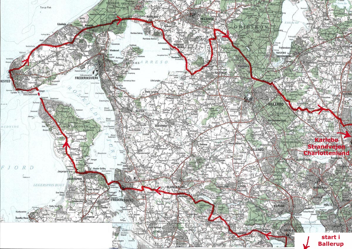 vi drejer af nordpå før Arresø og op til Ramløse. Herfra sydpå ved søens østside på