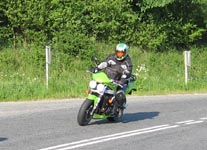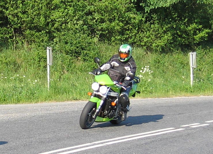 sin søn Tobias med sig bag på cyklen. Så kommer Jan på den grønne Speed Triple 2004,