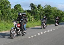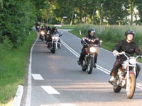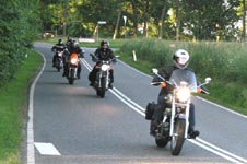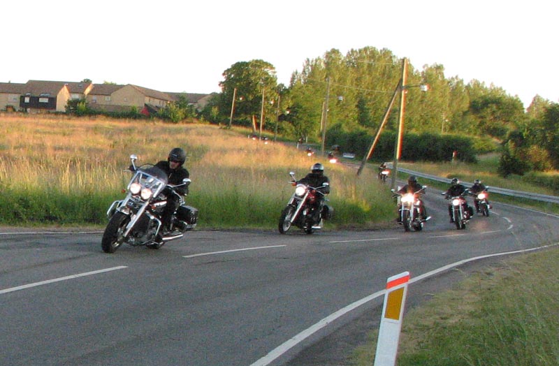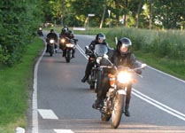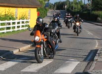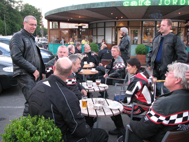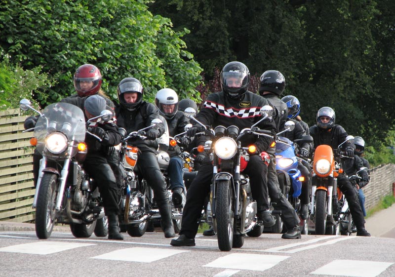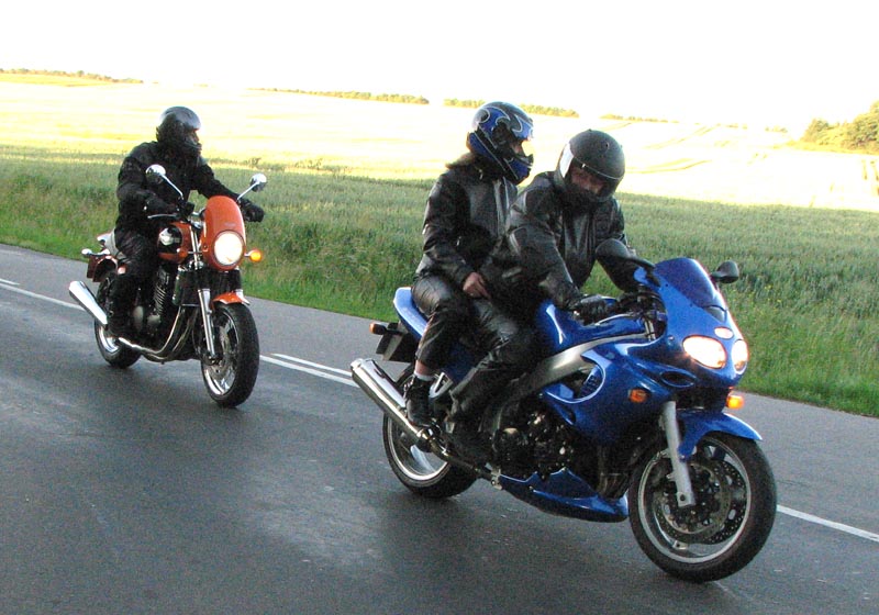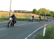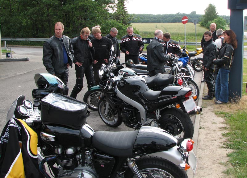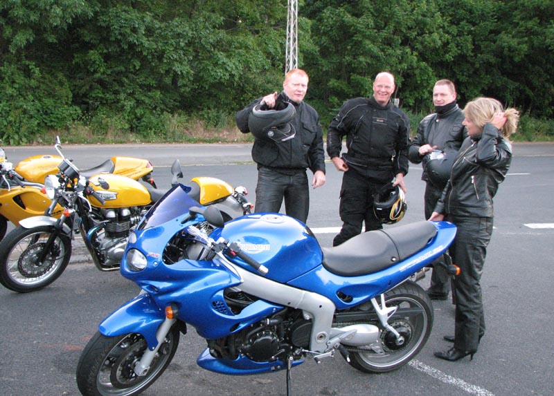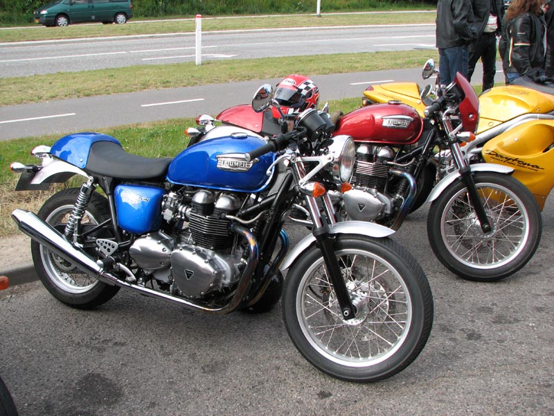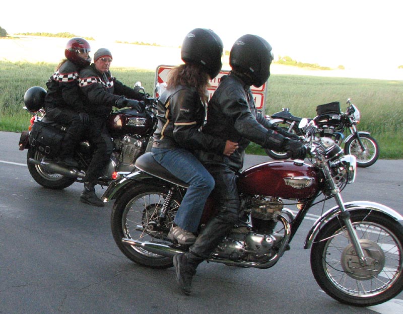 Bonneville -04, Henriks bror Peter på en gul Thruxton -05, og Peter + Eva på en blå