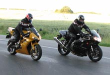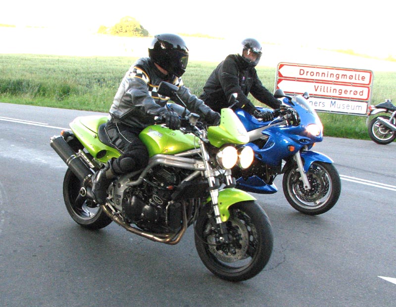 Thruxton -05, John på en grøn Speed Triple -98, og Steffen på en blå Sprint ST -04.