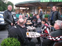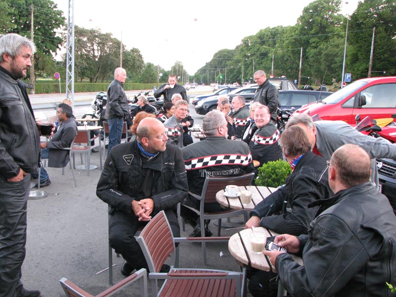 kigger på vores cykler. Det er også en syn med 33 Triumph motorcykler på parkeringen.