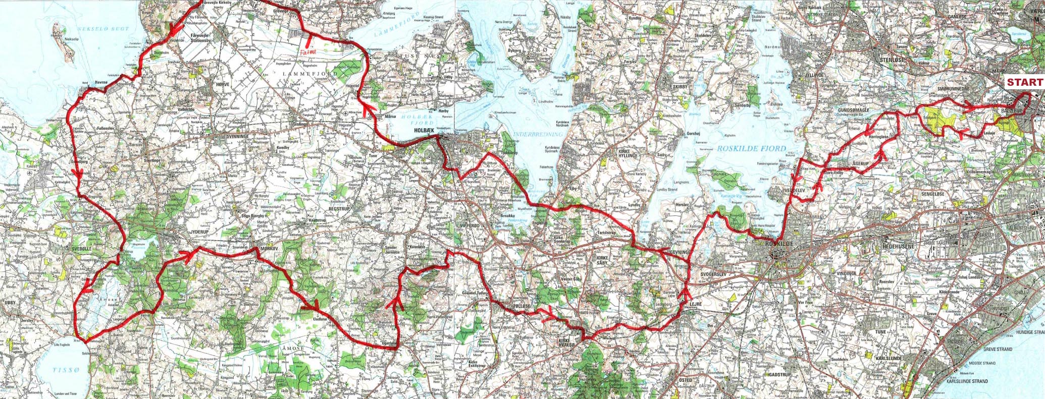 Første etape går via småveje til Roskilde og videre til Munkholmbroen. På vejen efter