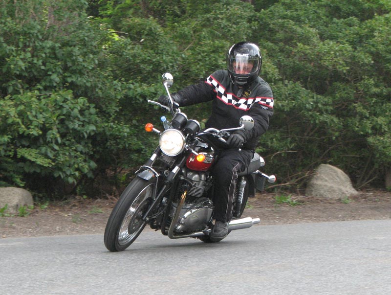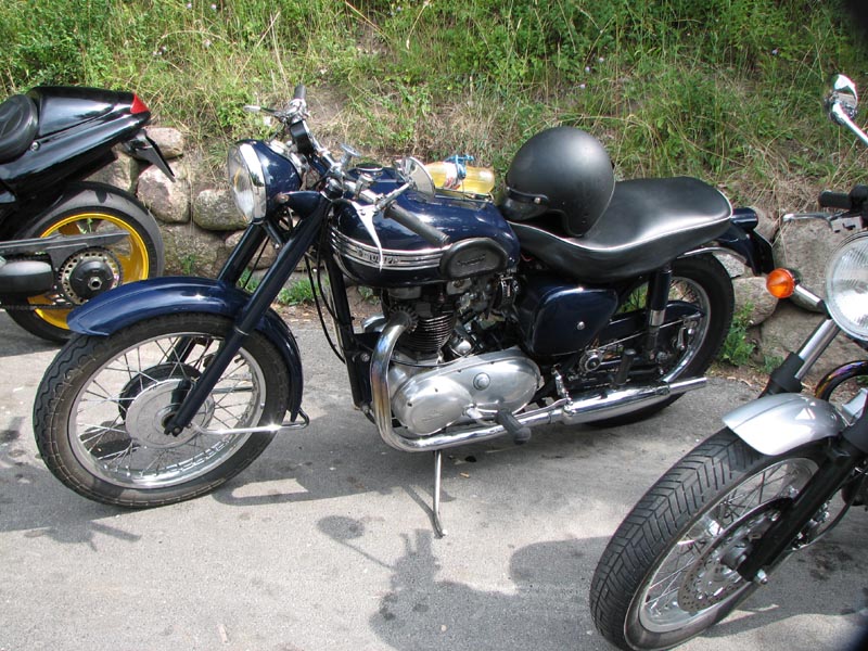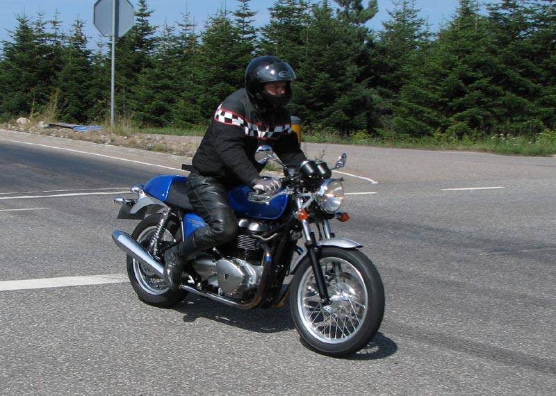 sort-røde Bonneville 2004, Finn med sin blå Bonneville T100 fra 2004 (hans kone Lene
