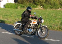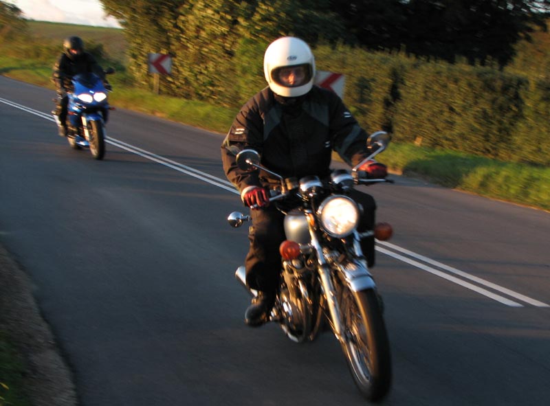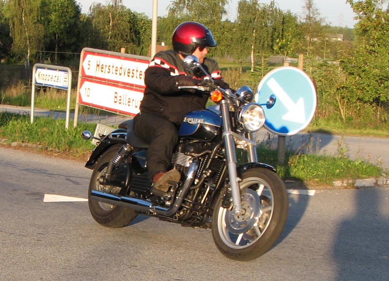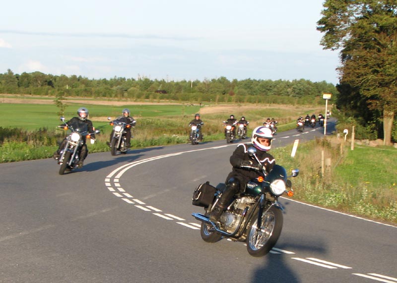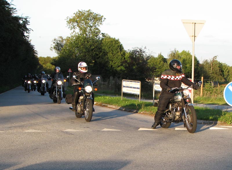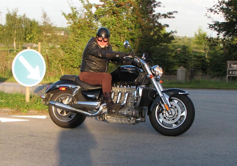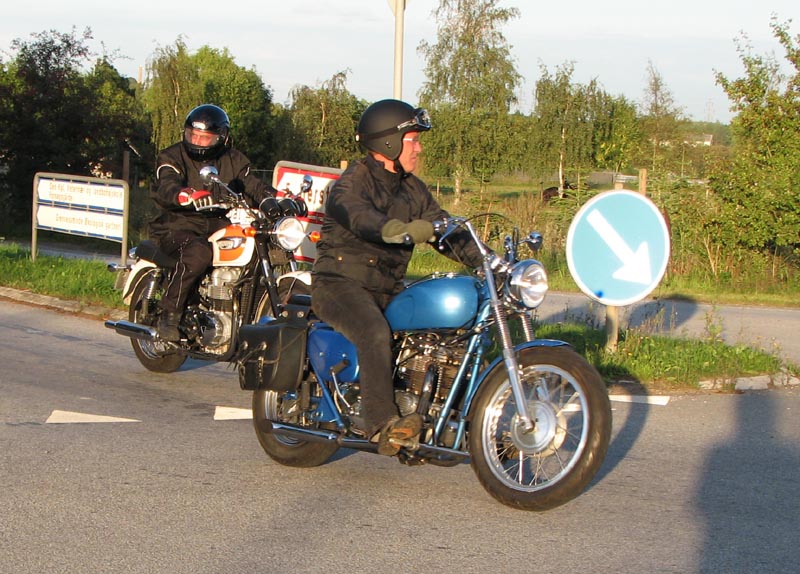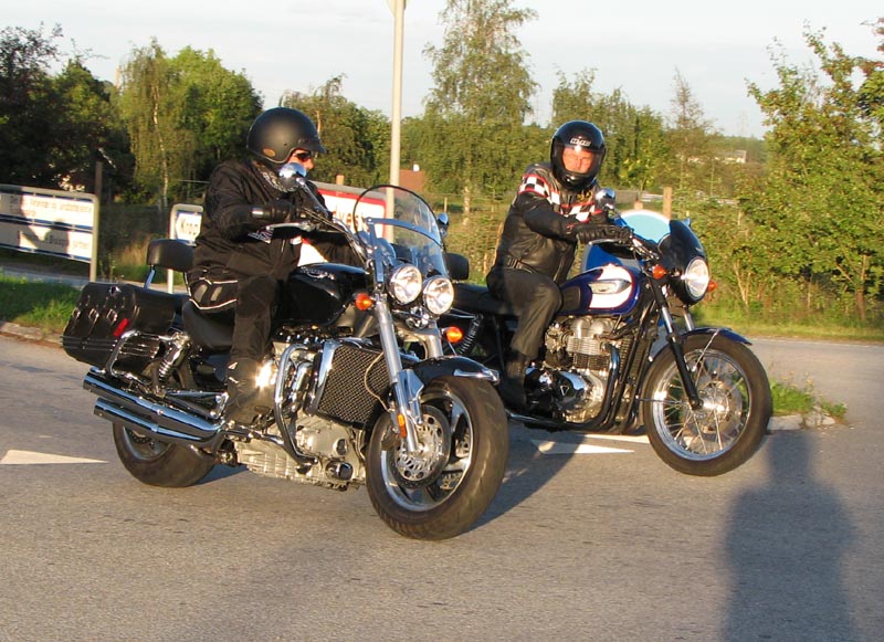 mørkerøde Bonneville -68, Carsten på en sølv Rocket III -05 og Hans-Jørgen på en gul