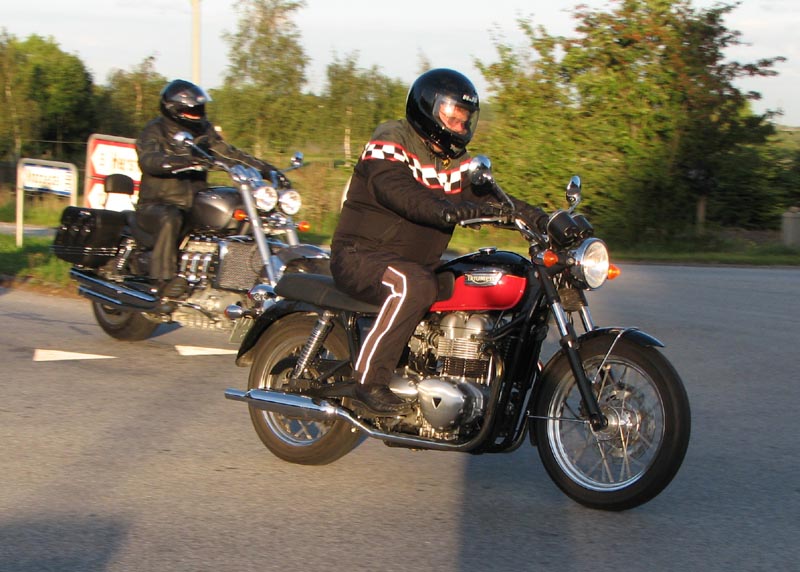 Så har vi Niels på en hvid/orange Bonneville T100 -06 og Jørgen på en sort Speedmaster -05,