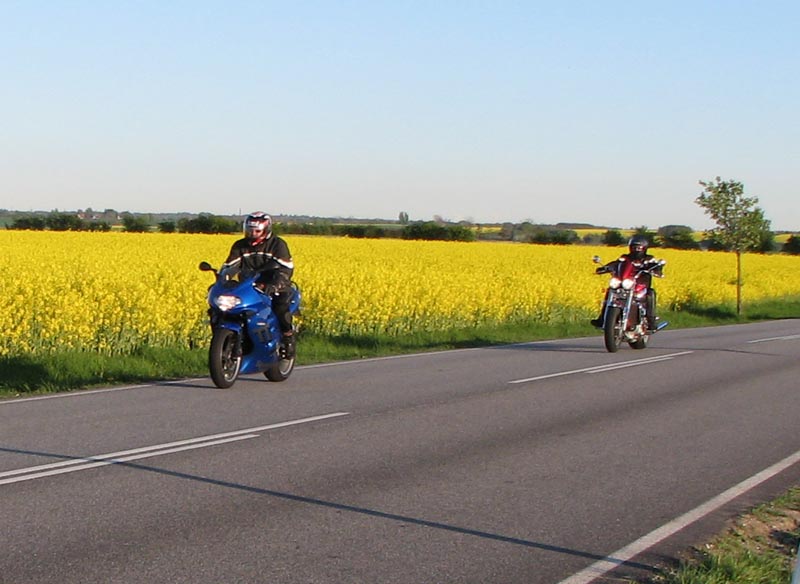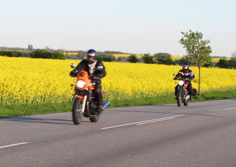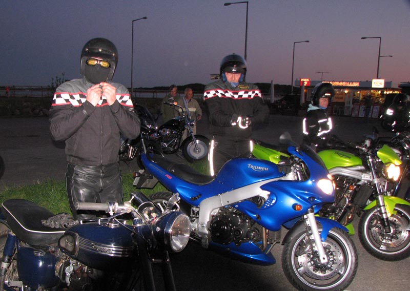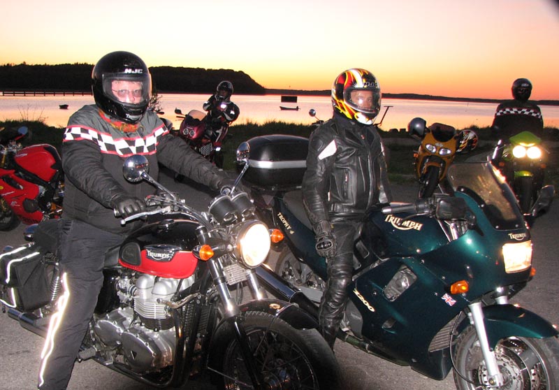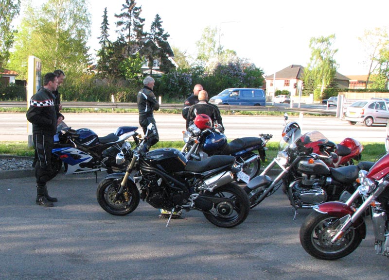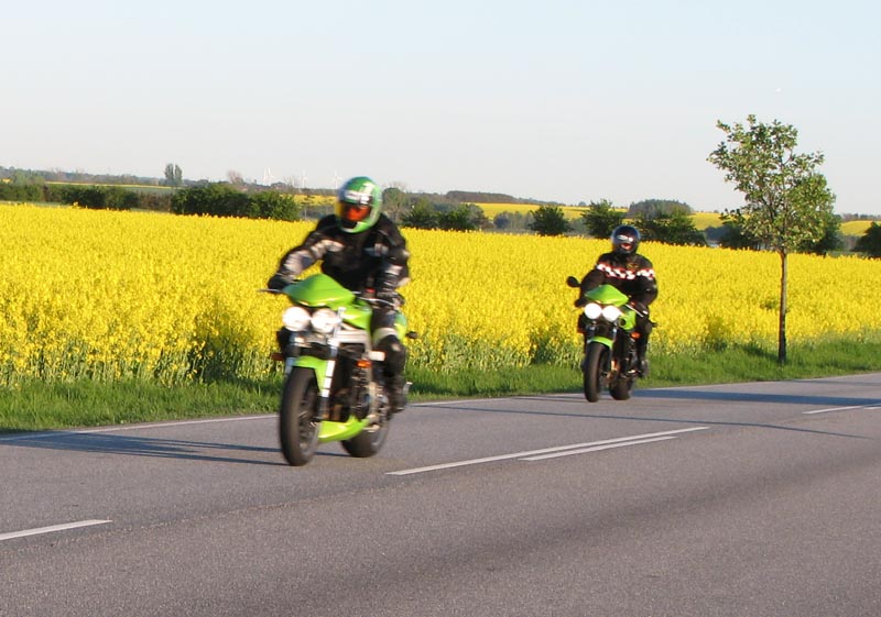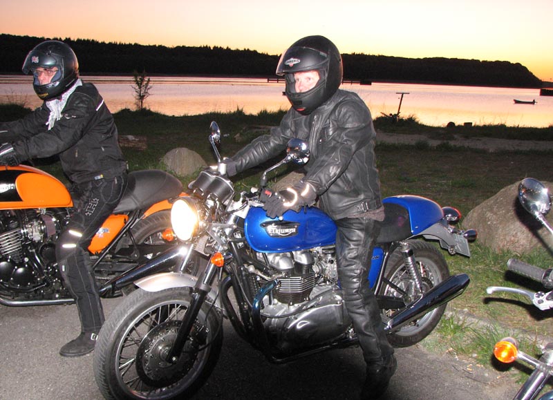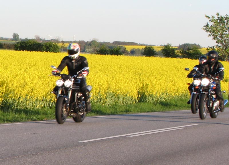 Bonneville T100 -04, Bo på en blå Sprint RS -04, Jan på en grøn Speed Triple -04,