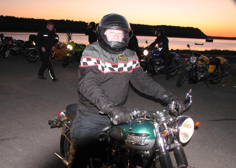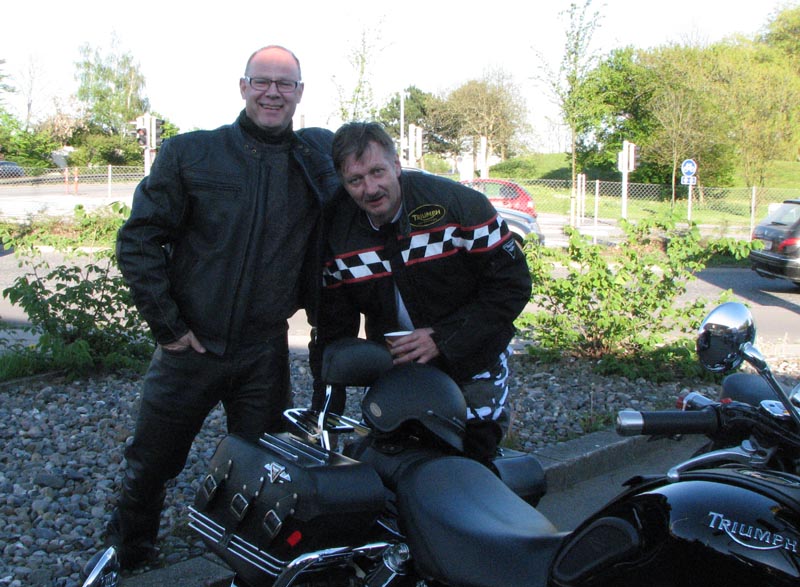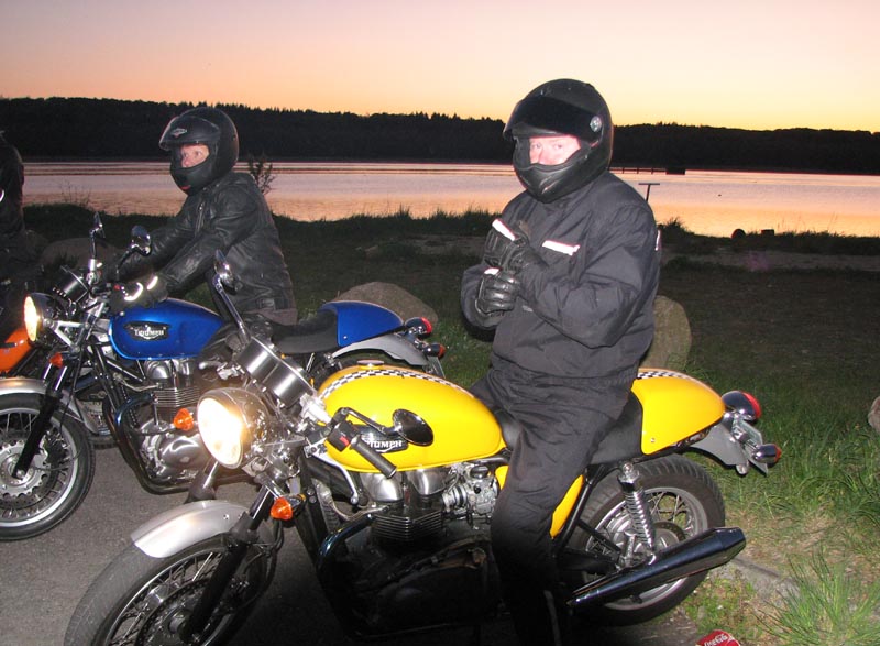Thruxton -06, Hans på en speciallakeret sort/rød Bonneville -05, Poul på sin grønne