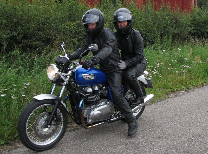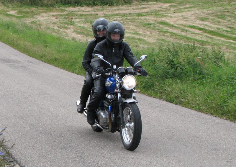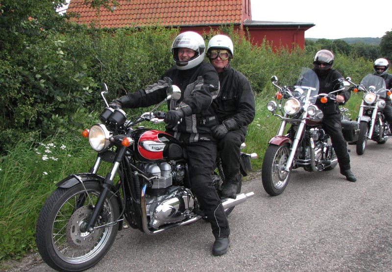 Finn & Lene på en blå Bonneville T100 -04, samt brødrene Poul & Niels på deres nye