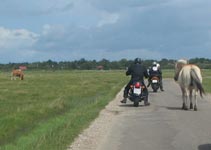 Havnsø. Ved Vesterlyng går vejen gennem en kæmpestor hestemark, med frit gående heste.