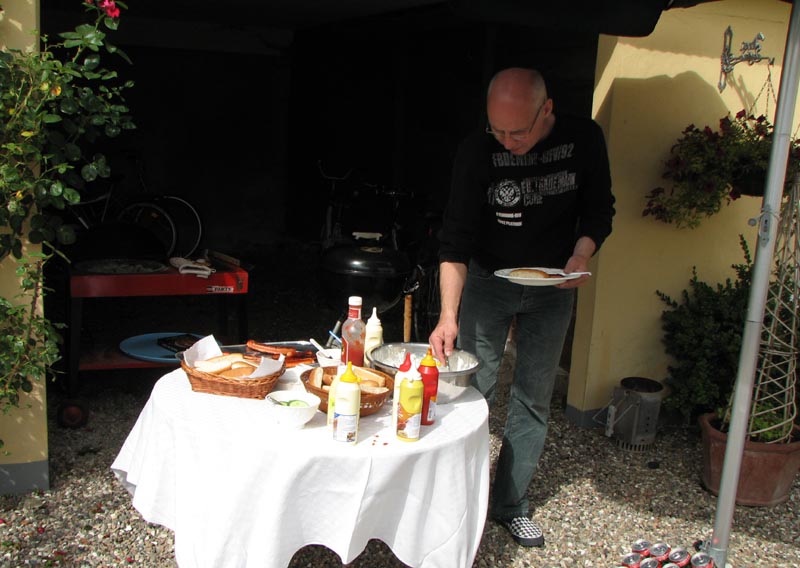kone og så kunne vi se at grillen var klar og der var bord og stole udenfor. John
