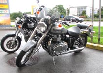 øjne på min nye Triumph model. Samtidig peger de ud på regnen og spørger, hvordan det