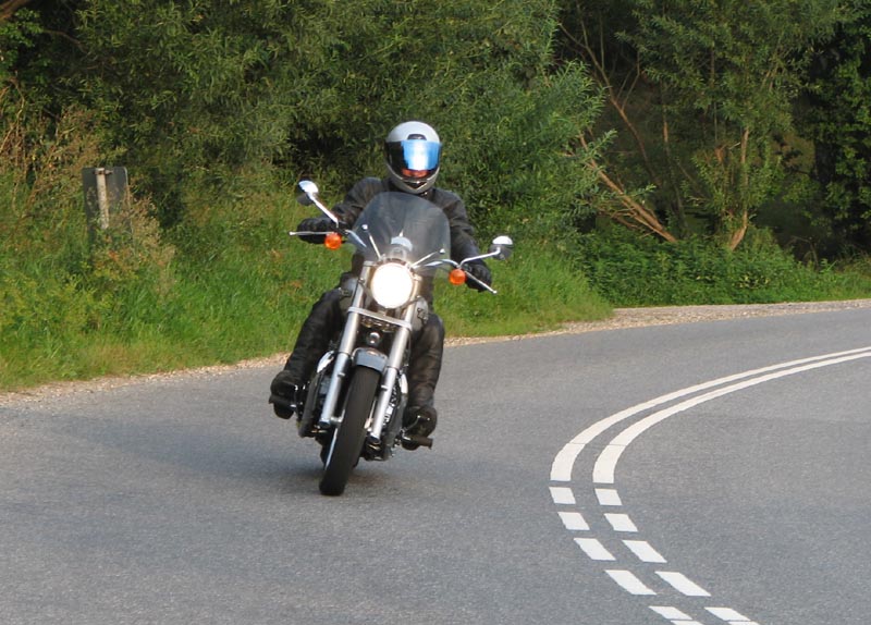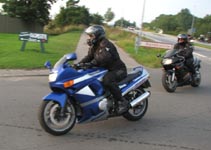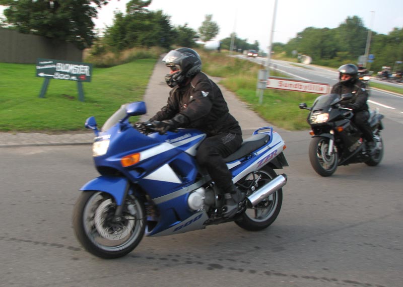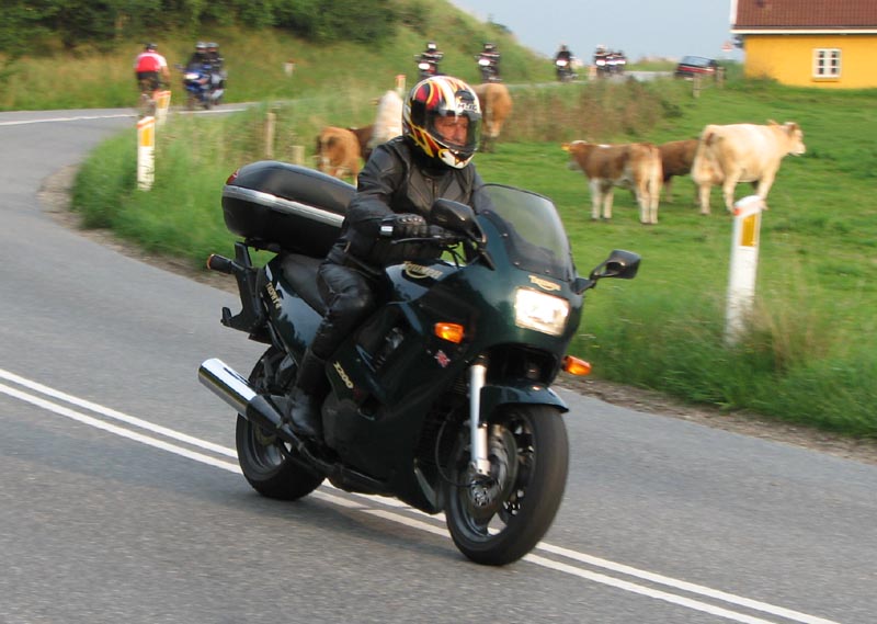 Poul på en grøn Trophy 1200 -95, Peter på en blå Sprint RS -04, Peter på en gul Thruxton -05,