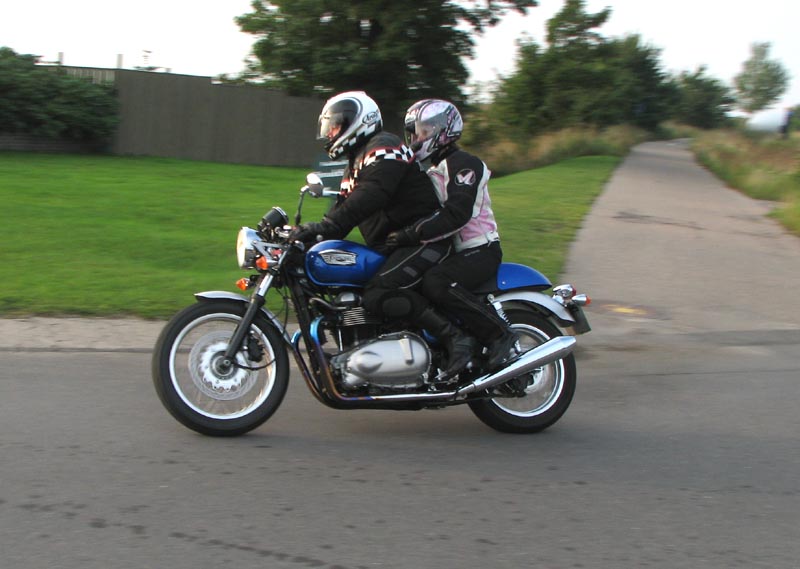 vindskærm, Henrik og Gitte på en sort Bonneville -04, Tonny på en rød Speedmaster -07,