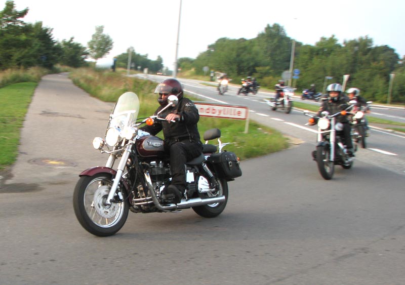 Poul på en rød Rocket III -05, Jesper på en sort Bonneville -04, Steen på en blå