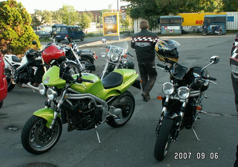 en grå/sølv America, Finn på en grøn/sølv America -06, Jan på en grøn Speed Triple -04,