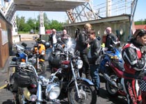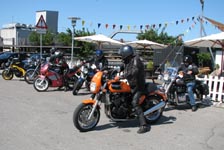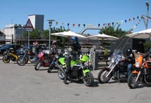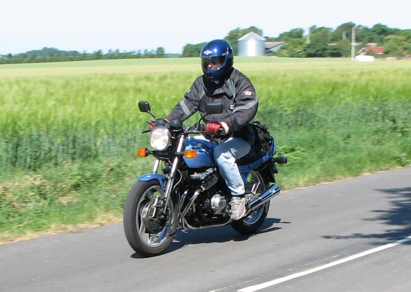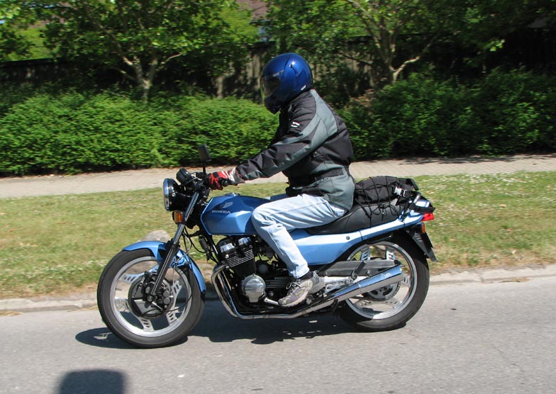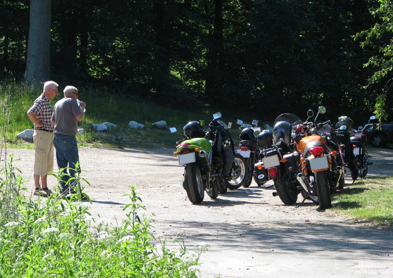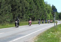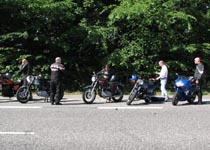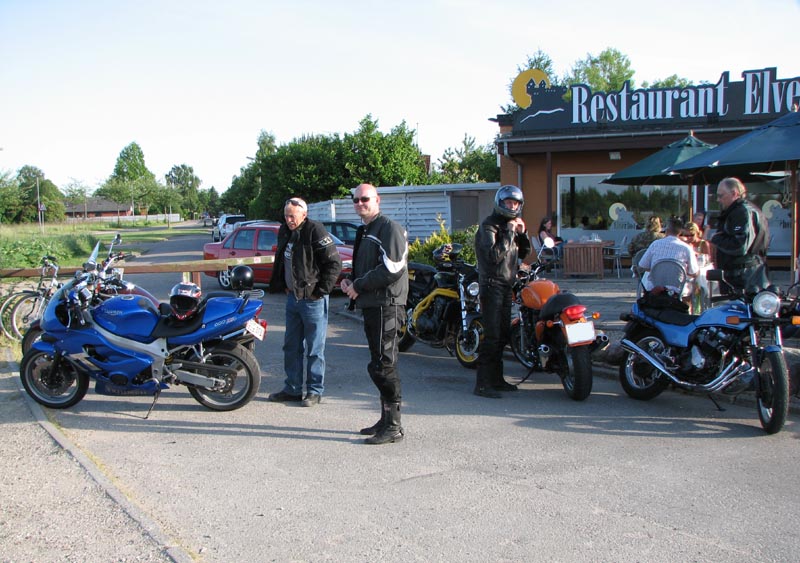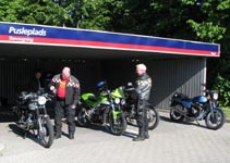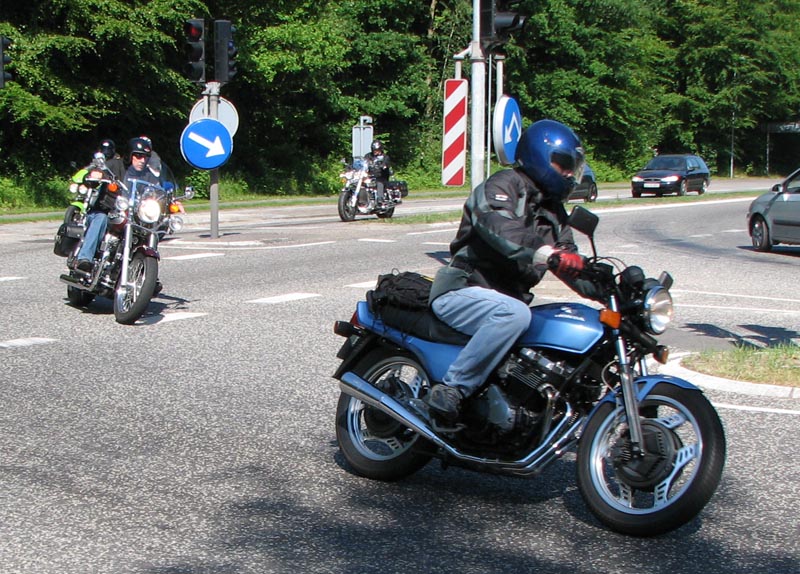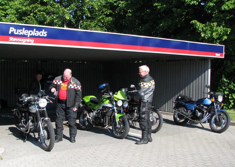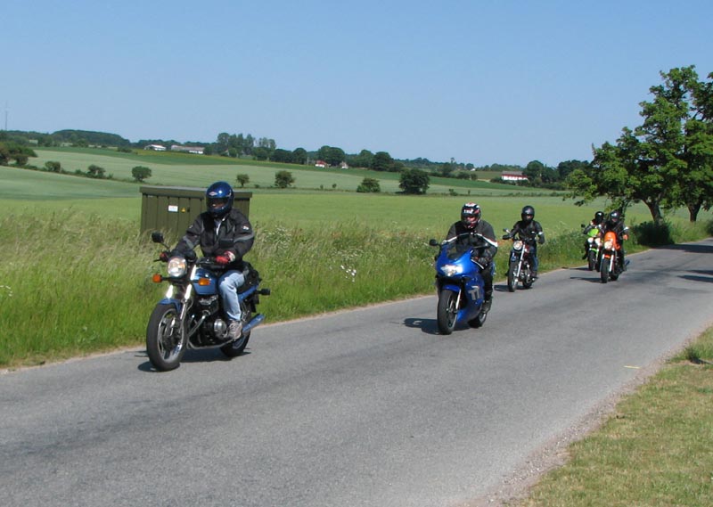 lyseblå CBX550 -84, Jan på den blå TT600 -02, Fatma på den lyserøde GS500E, Peter på