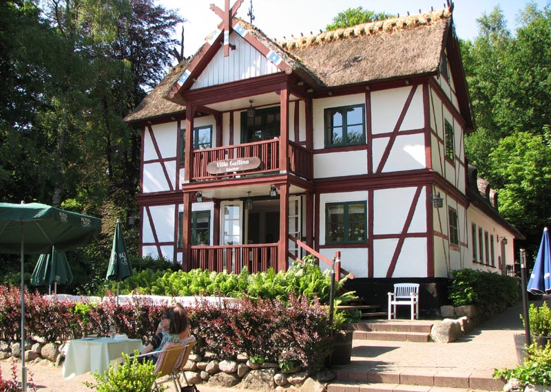 rasteplads med gammelt hus (Villa Galina), restaurant, iskiosk og dejlig sø udsigt.