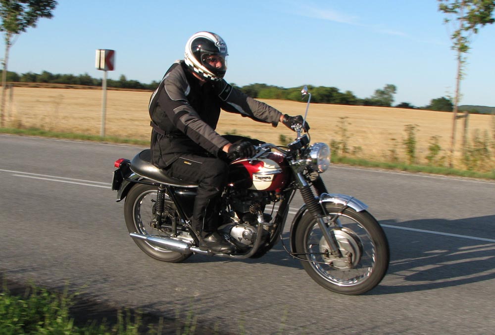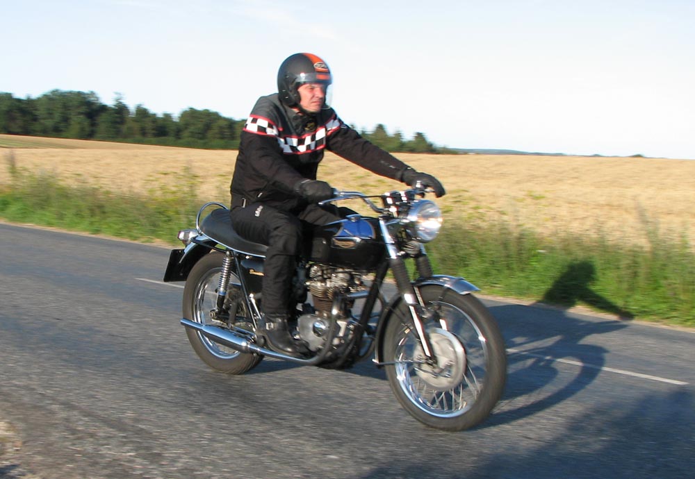 Preben på en sølv/blå Bonneville -69, og Klaus på en rød/hvid Bonneville -70.