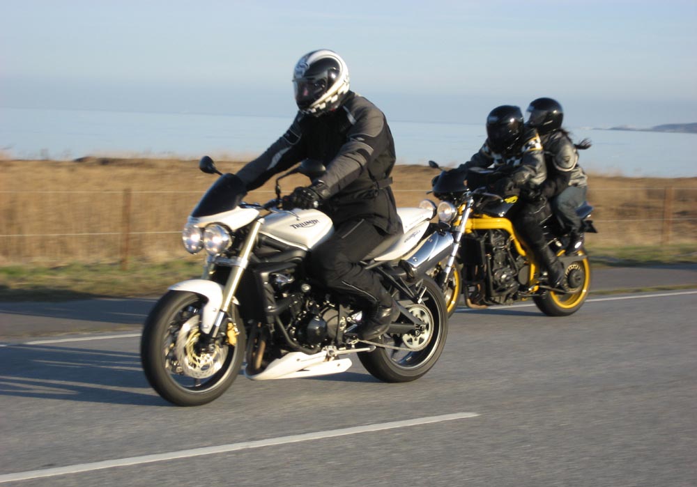 forhøjet i bagdæmperen. Så tager jeg alene Johns grønne Speed Triple med den smarte potte.
