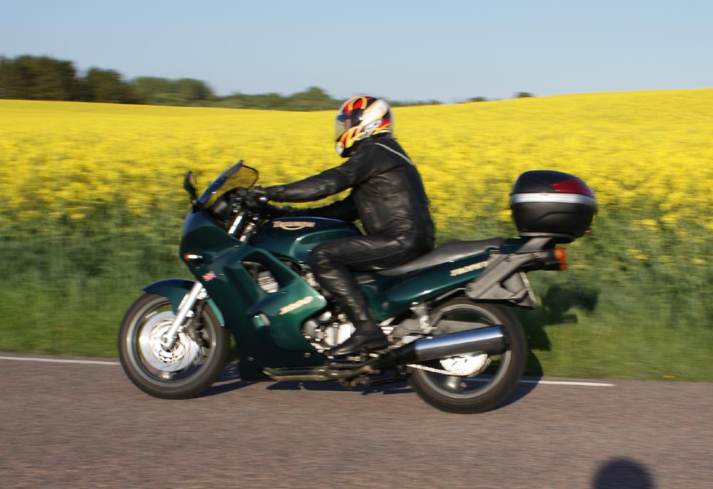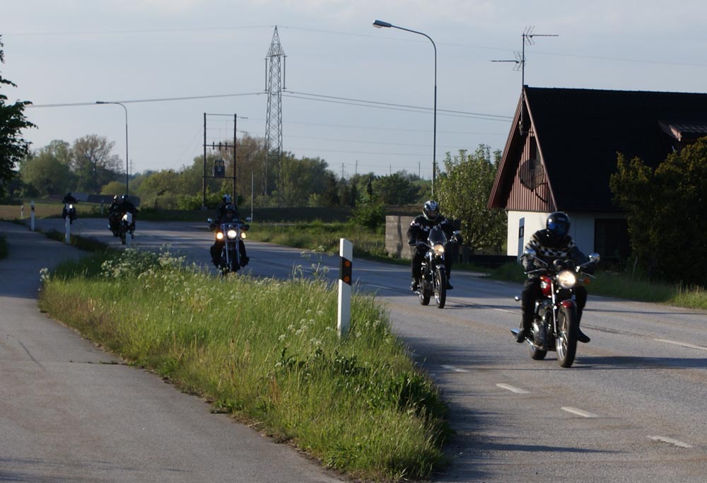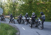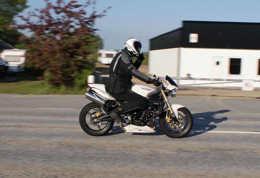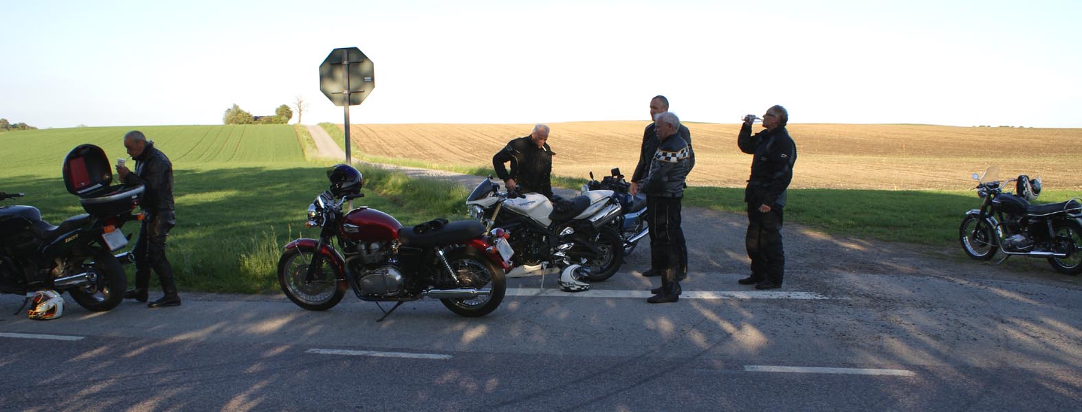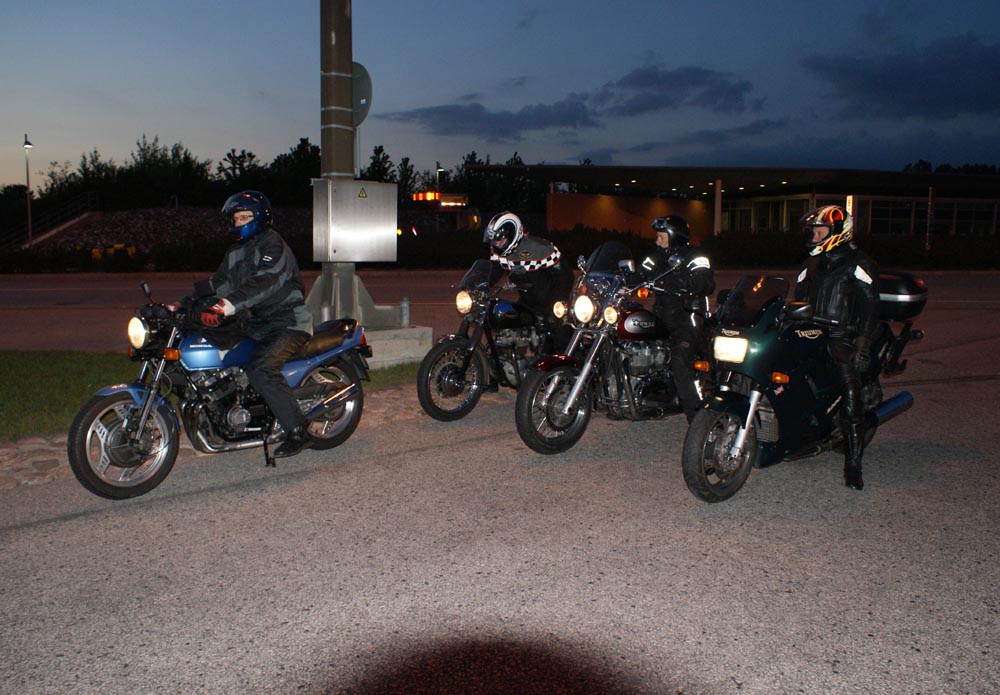 Bonneville -04, Poul på en grøn Trophy 1200 -95, Klaus på en Street Triple 675 -08, Bo på en hvid