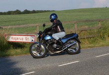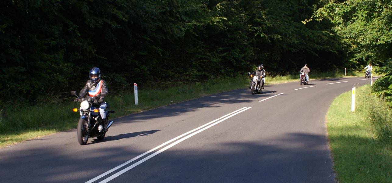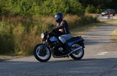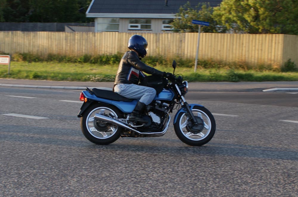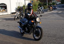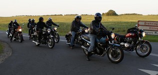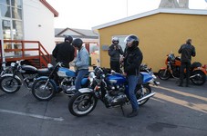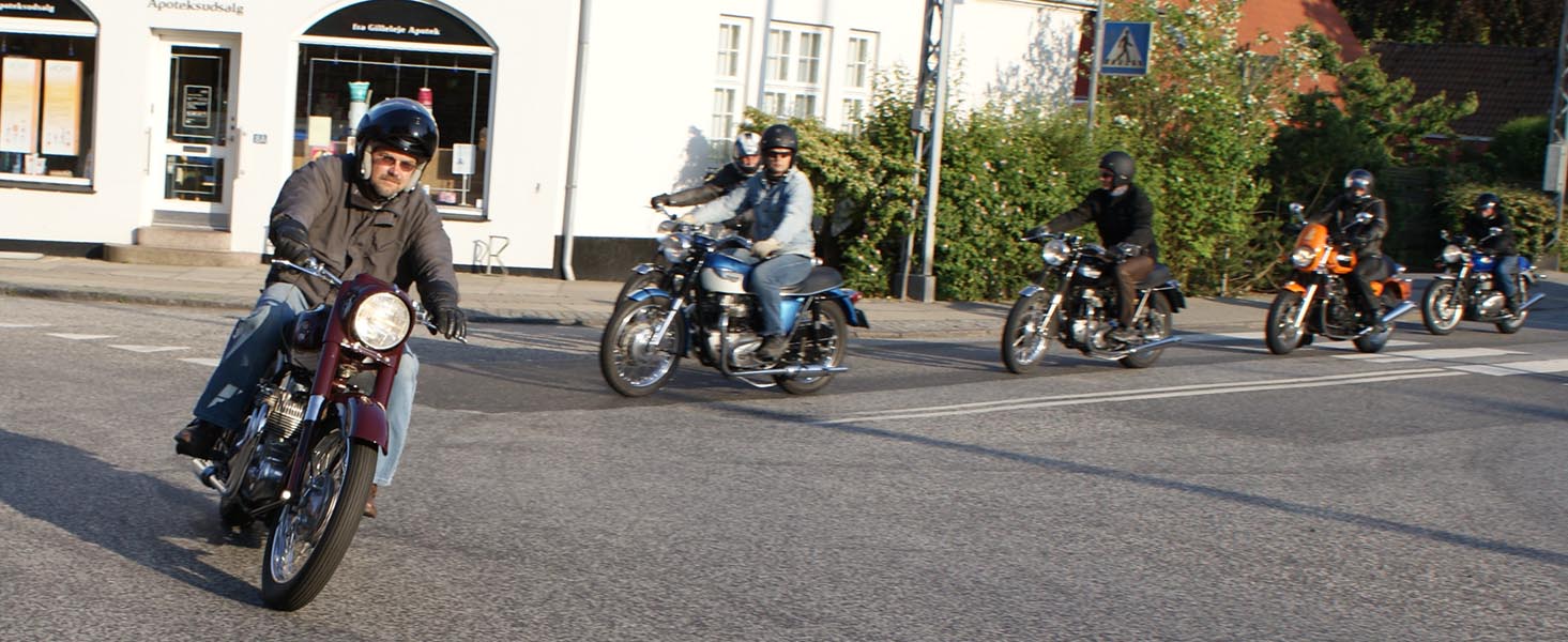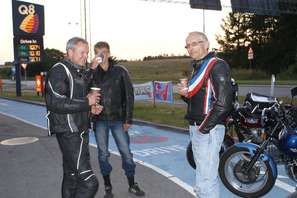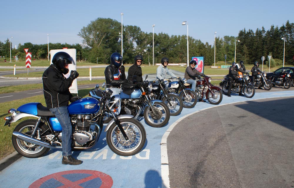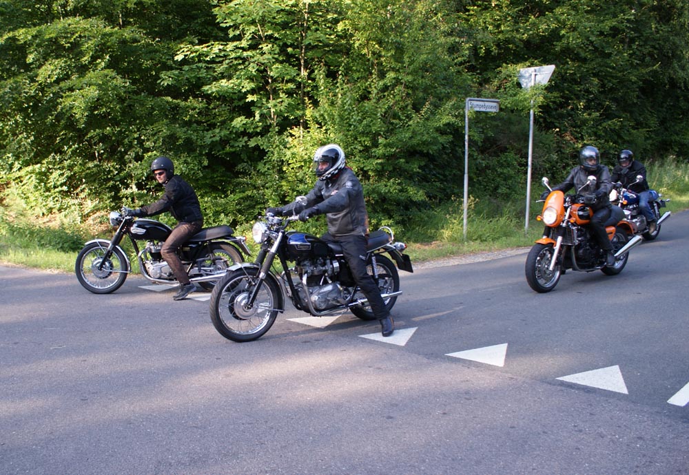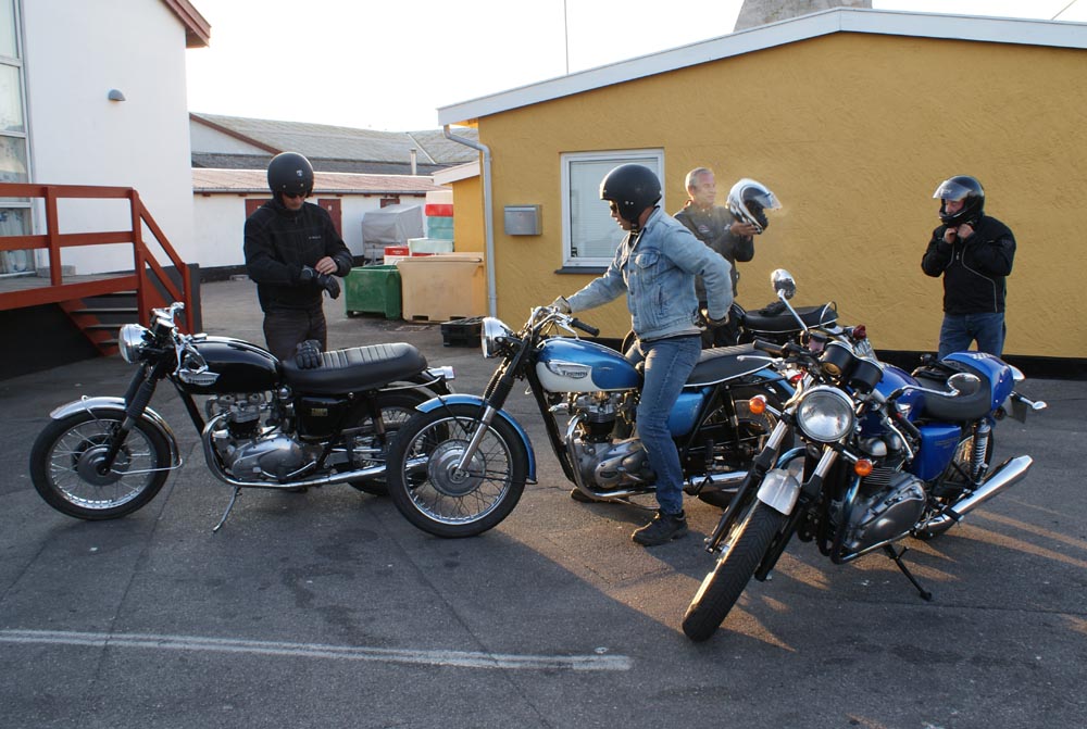 Ole på en sort Tiger 650 -69, Søren på en CBX550 -84, Karl på en blå Thruxton -06,