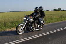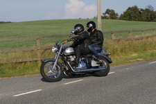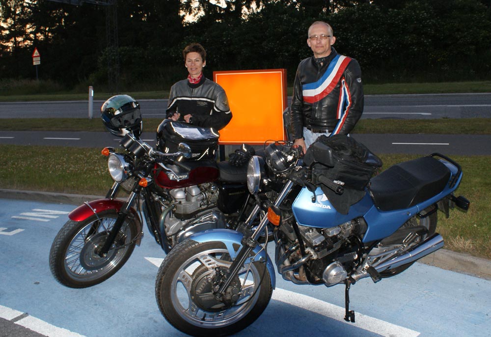 og mig og Ulla på en rød Bonneville -04. Jeg hade lånt en cykel da min egen var