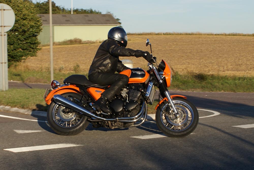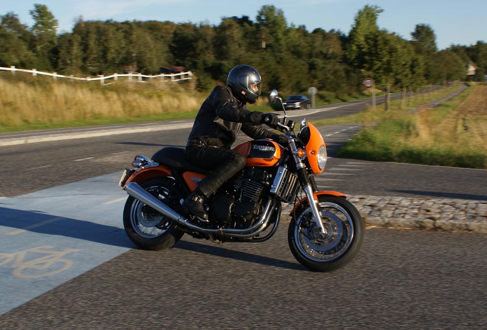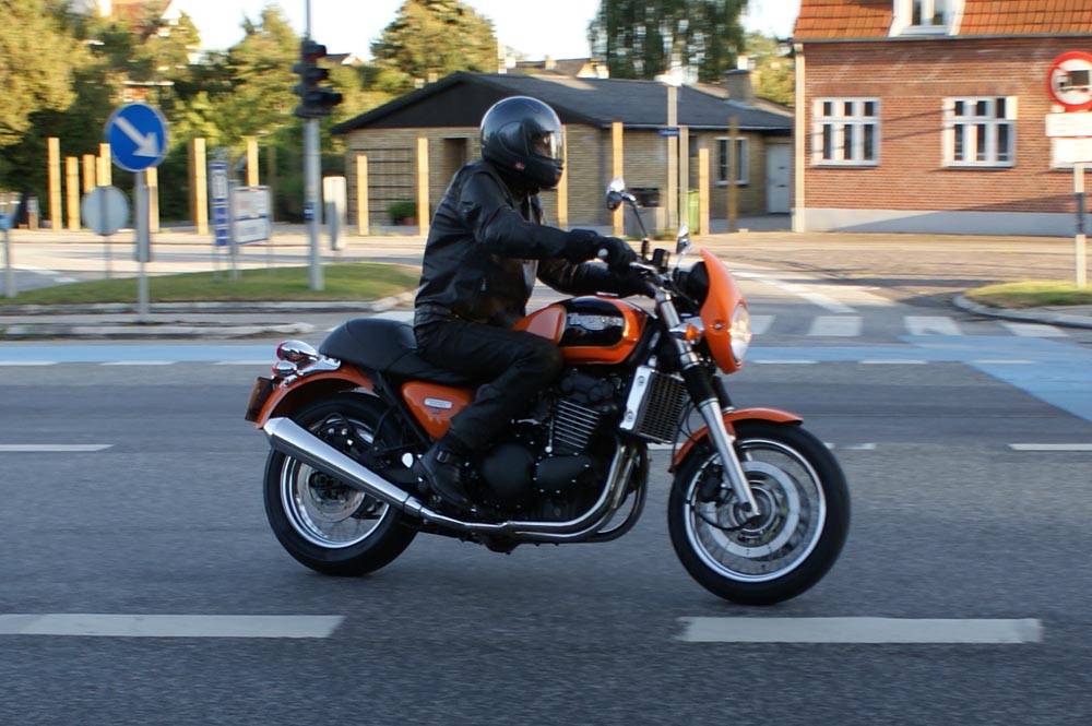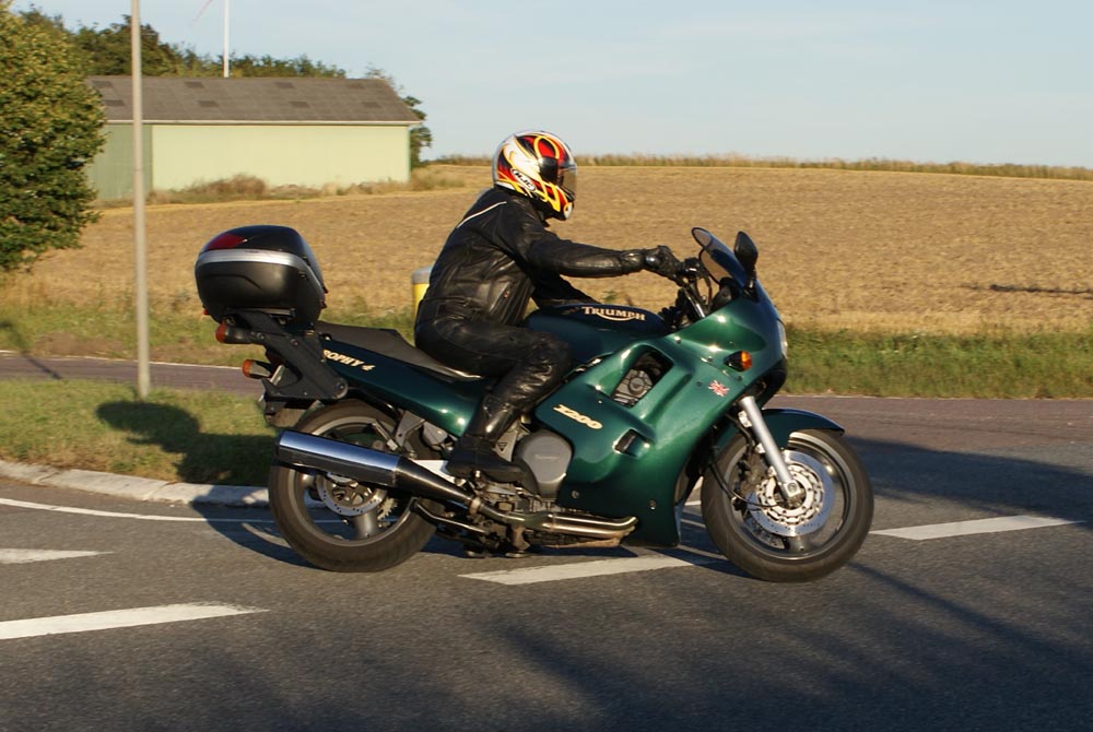 Poul på en mørkegrøn Trophy 1200 -95, Tom på en rød Triumph Legend -99
