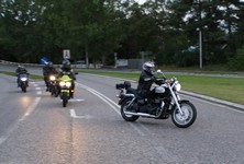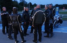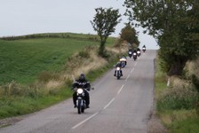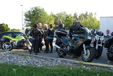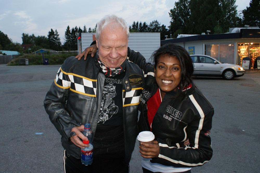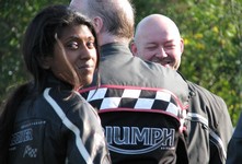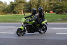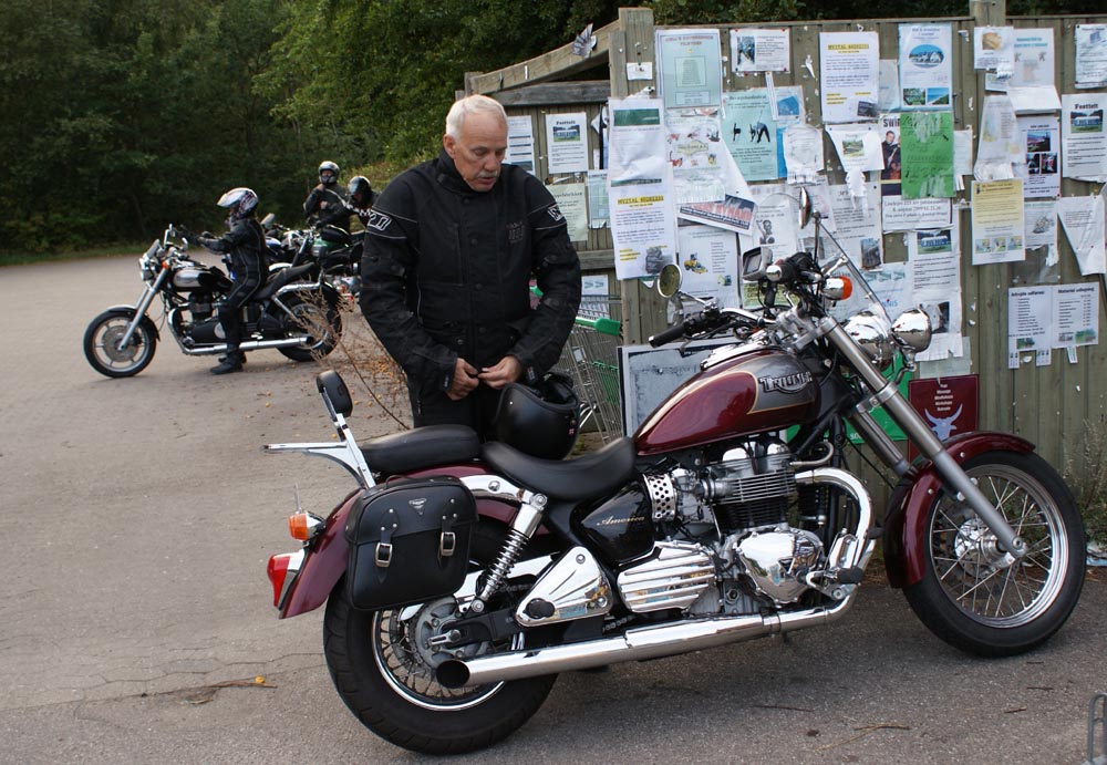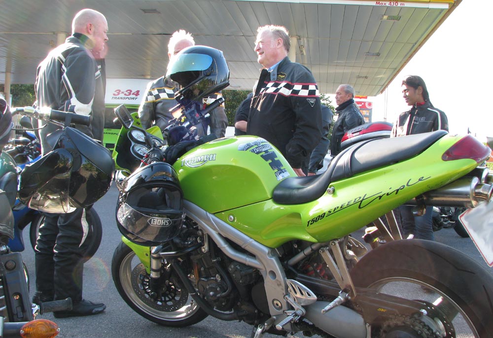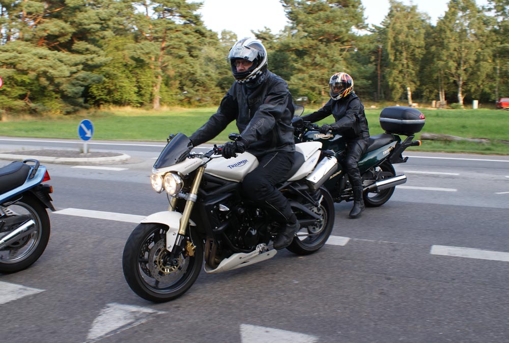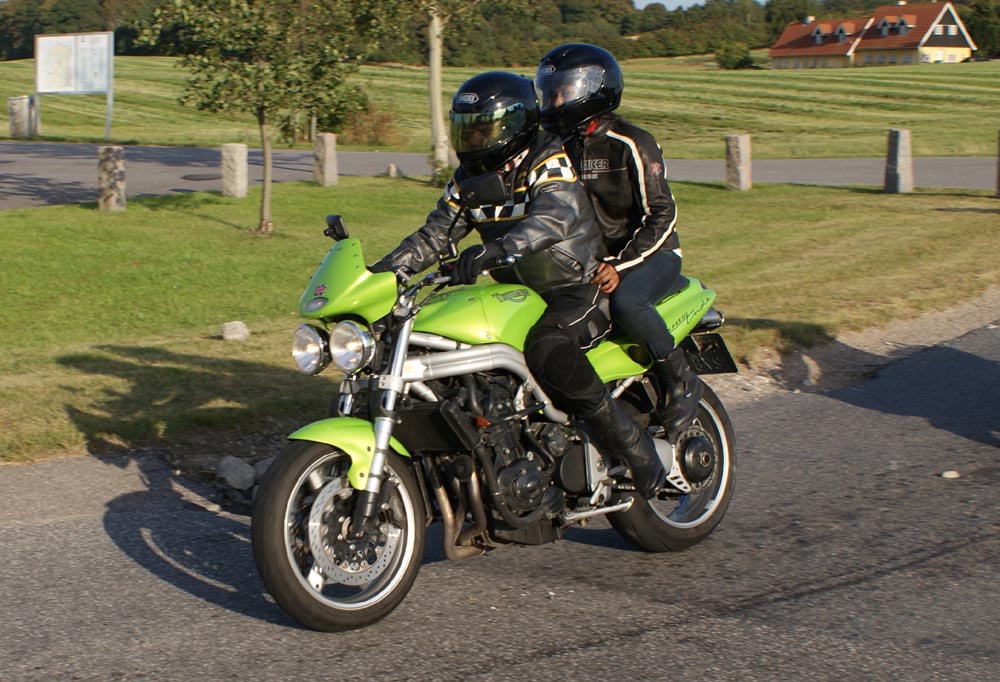 America med vindskærm og ekstra lysen, og John på sin grønne Speed Triple.