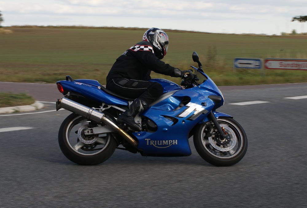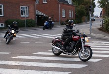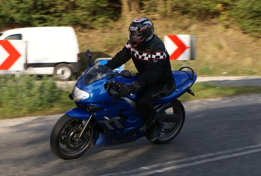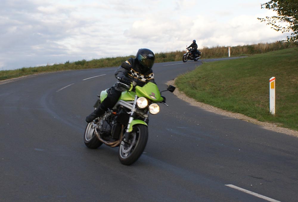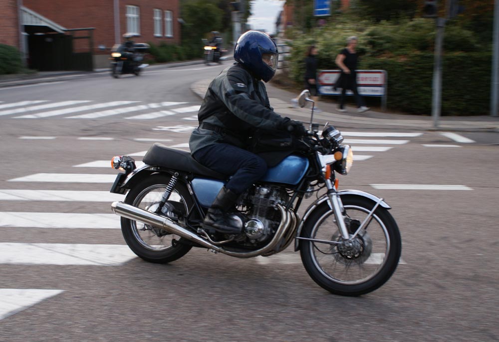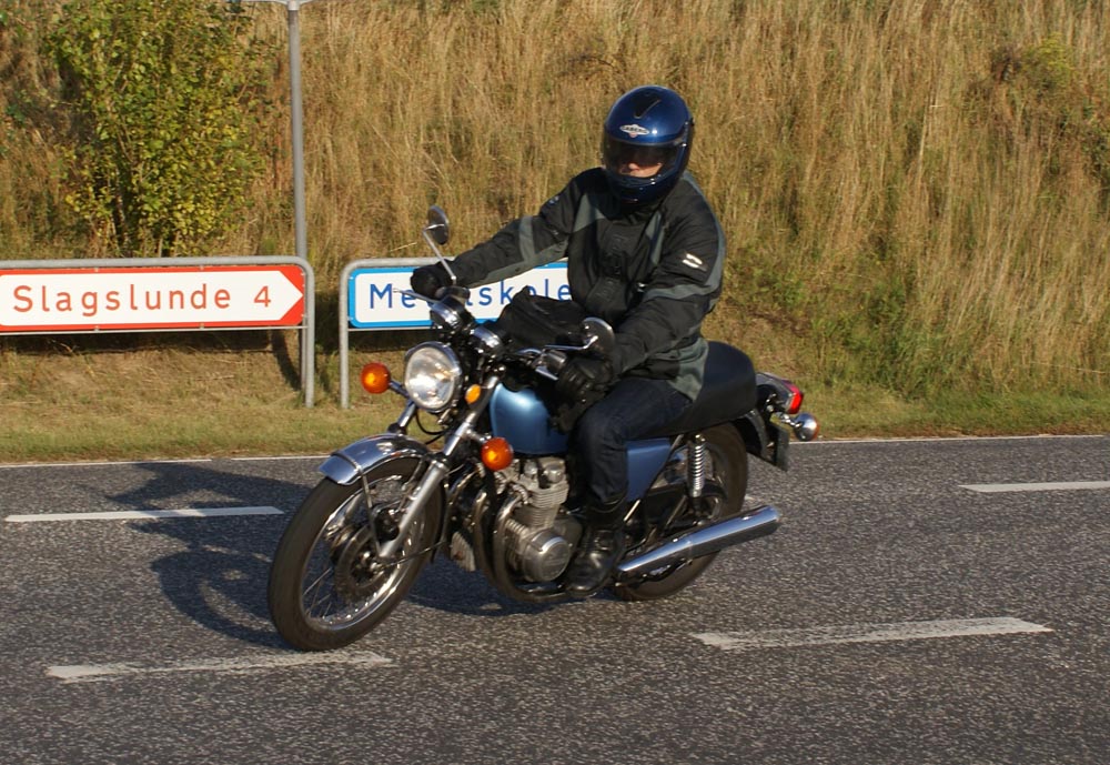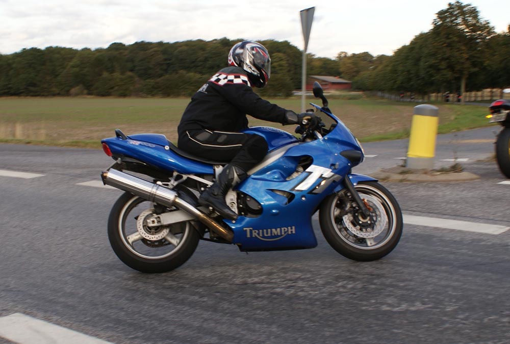 Speed Triple -01. I sidste sekund kommer Søren på en blå CB500 -77, ikke