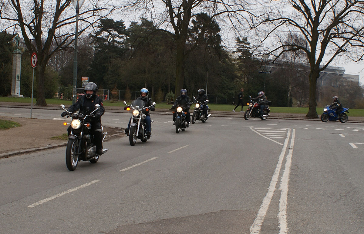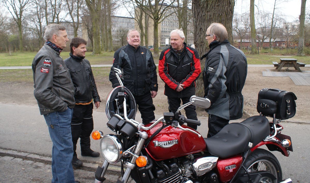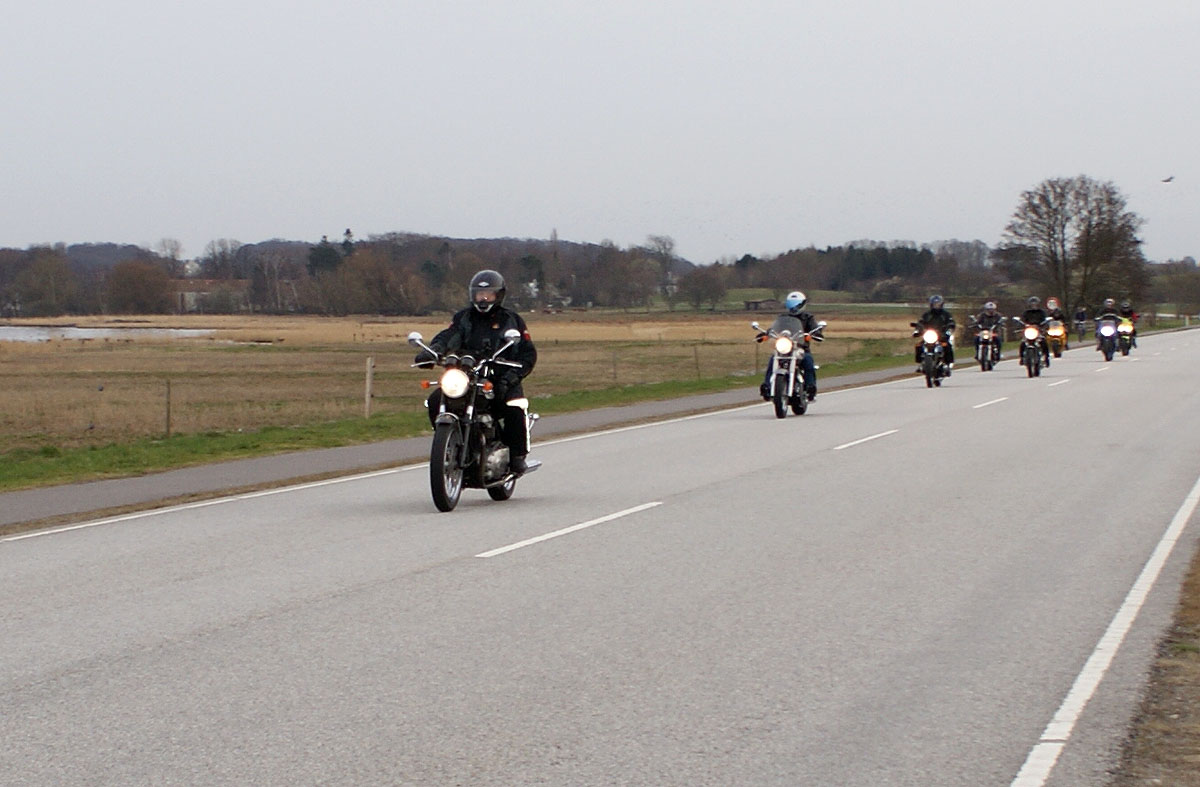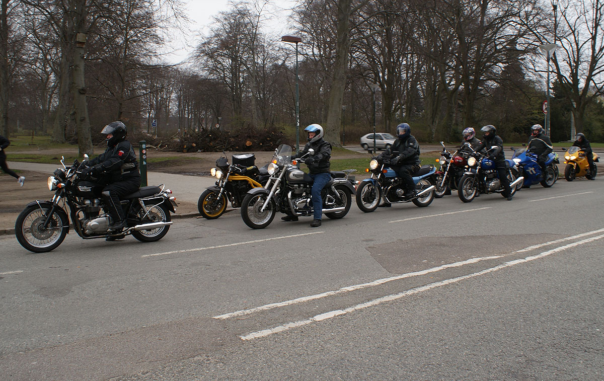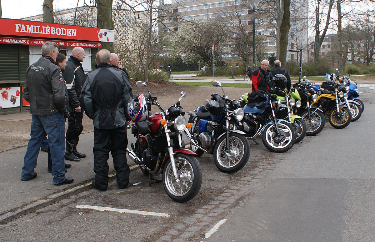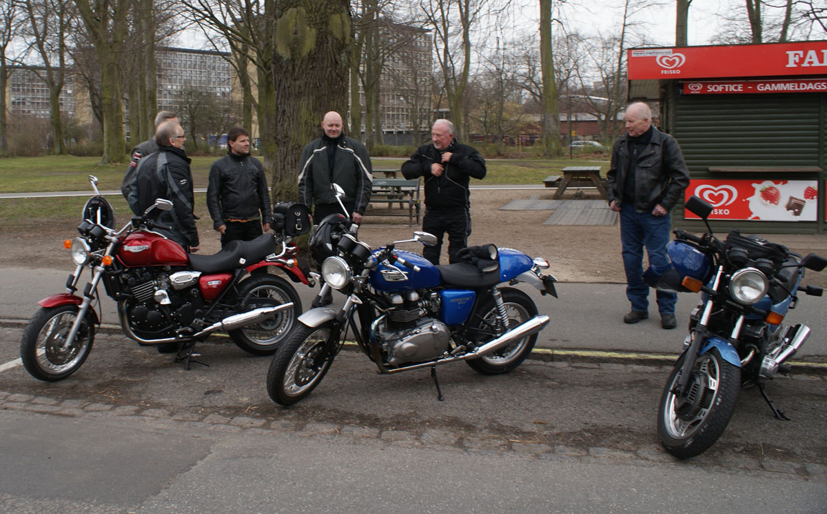 den sorte Bonneville -05, Søren på den blå CBX550 -84, Steen på den blå Thruxton -06,