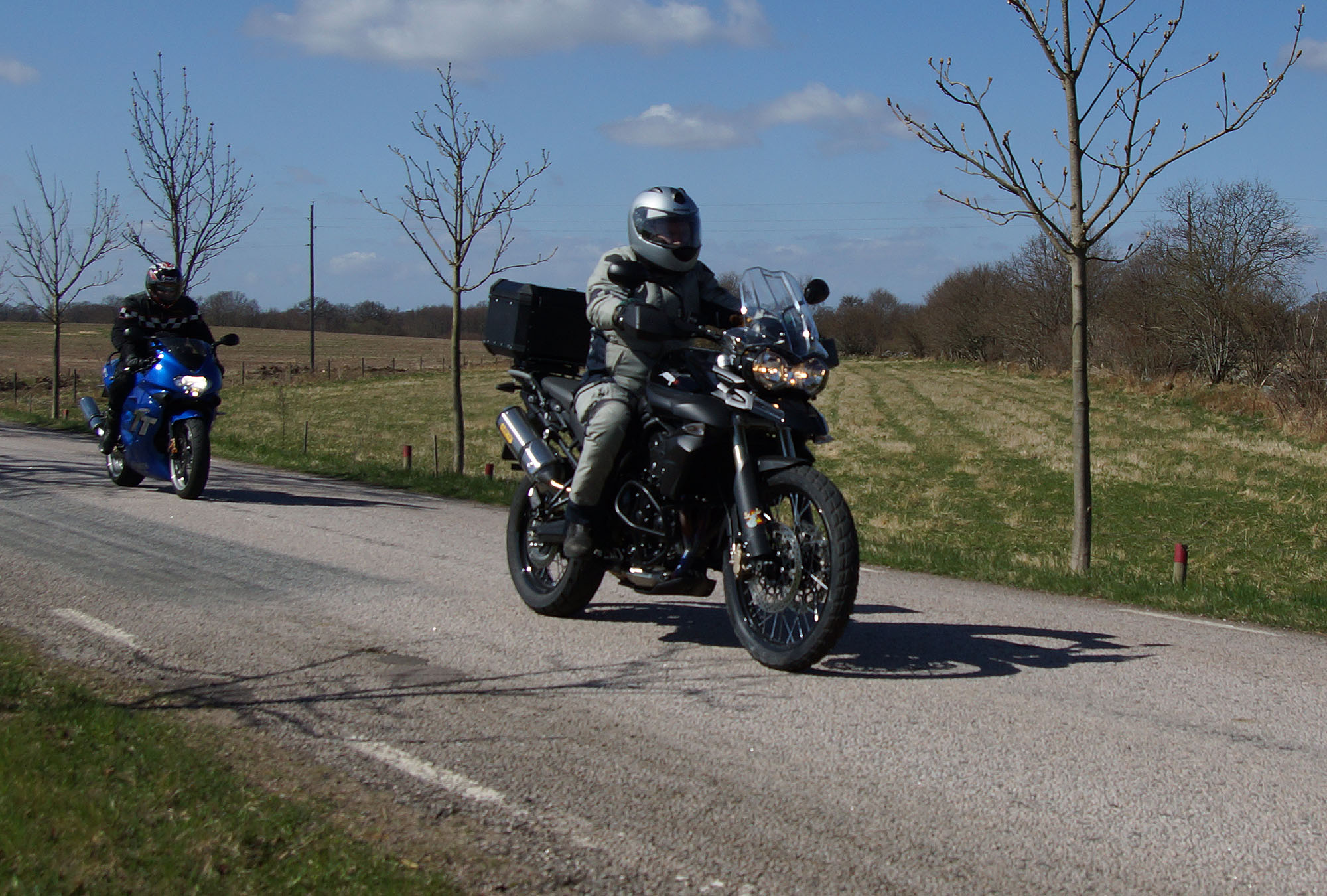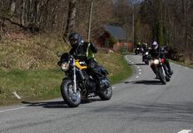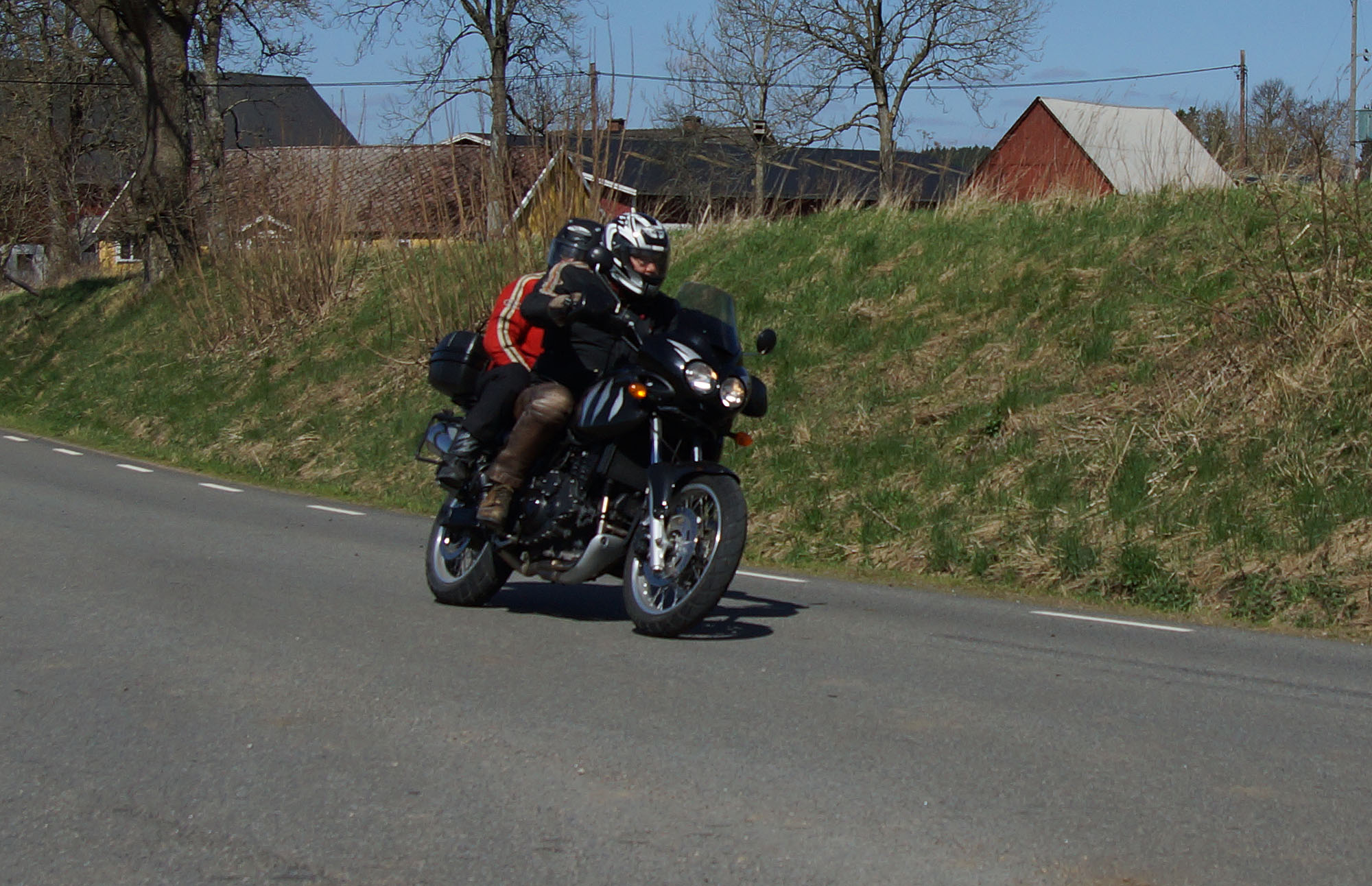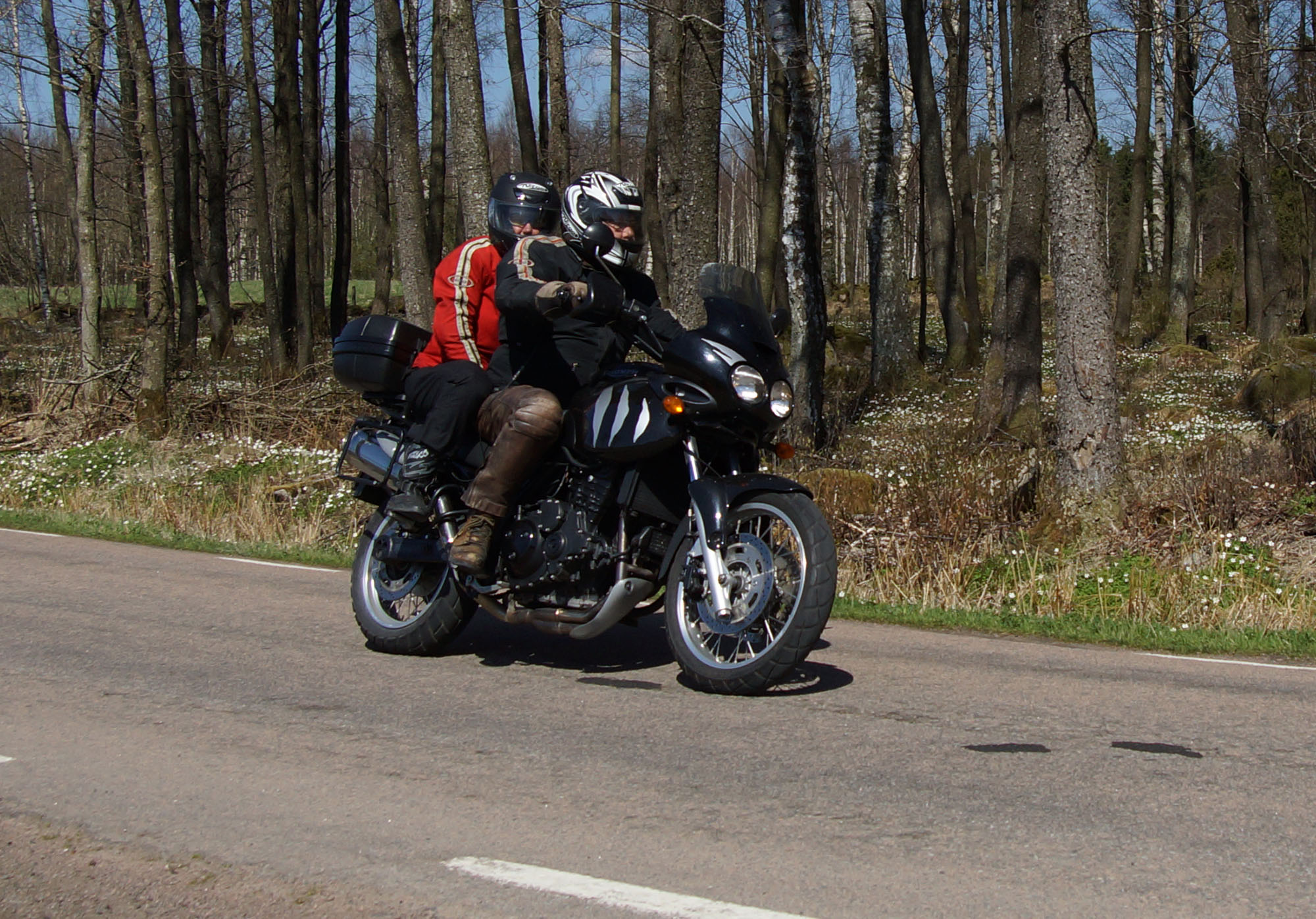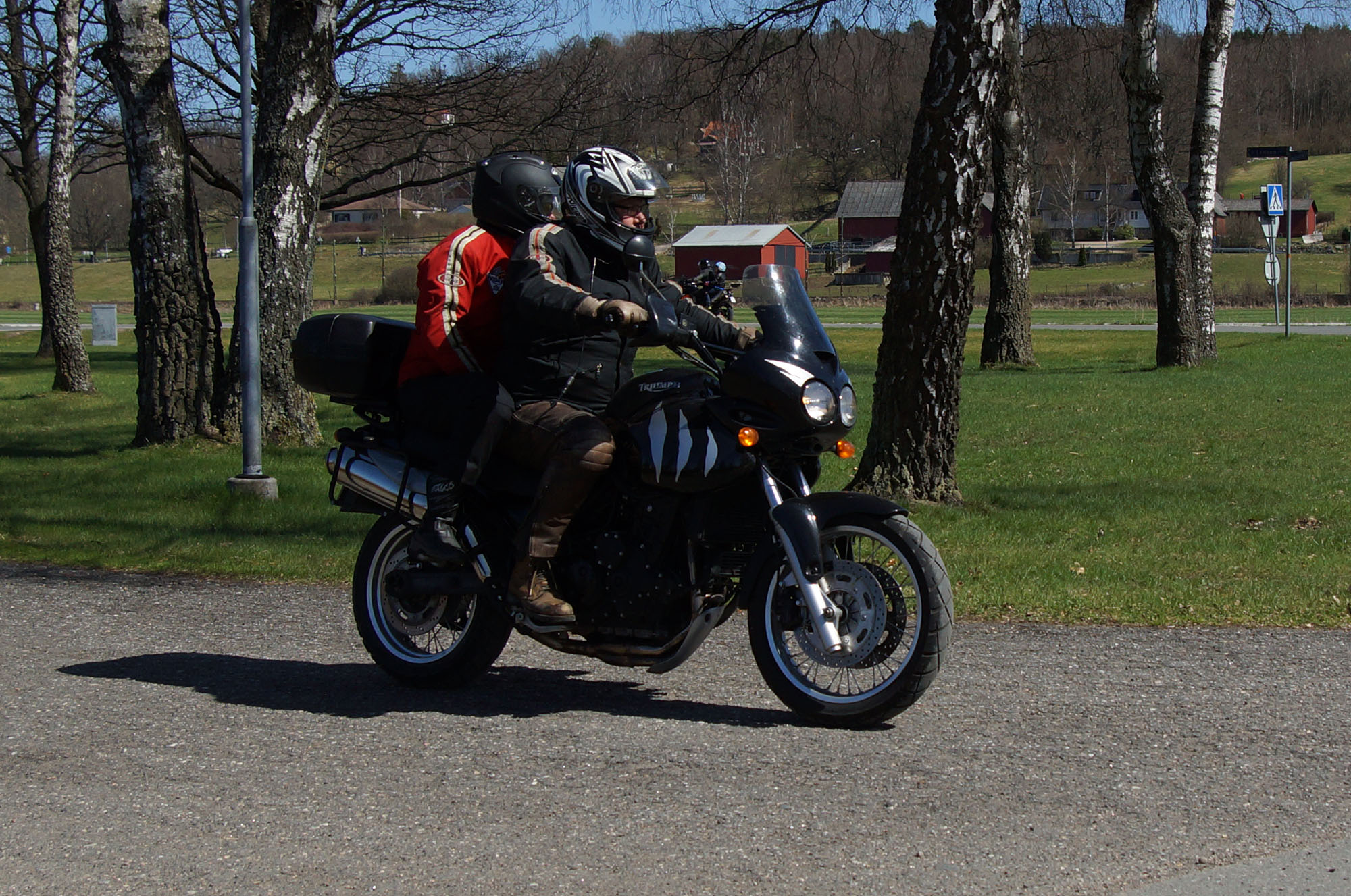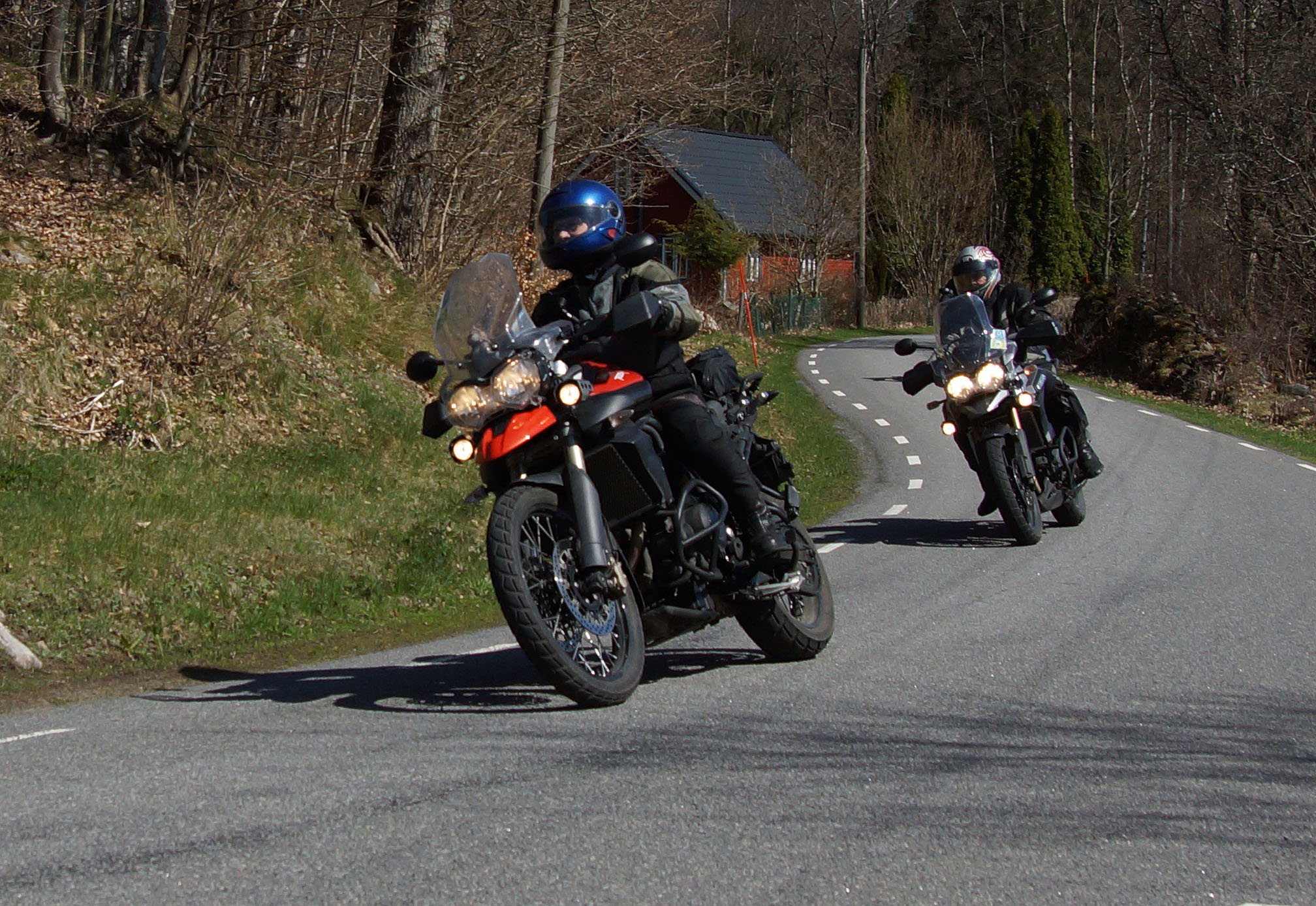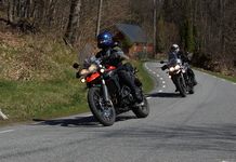 Mattias på en rød Speed Triple -04, Acke på en Tiger Explorer -12 og