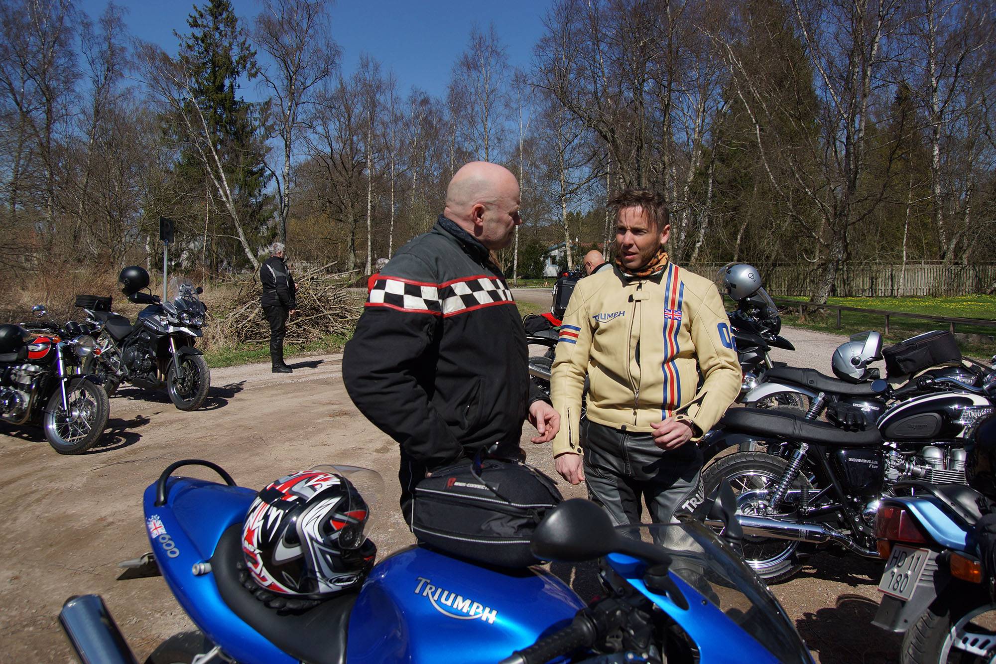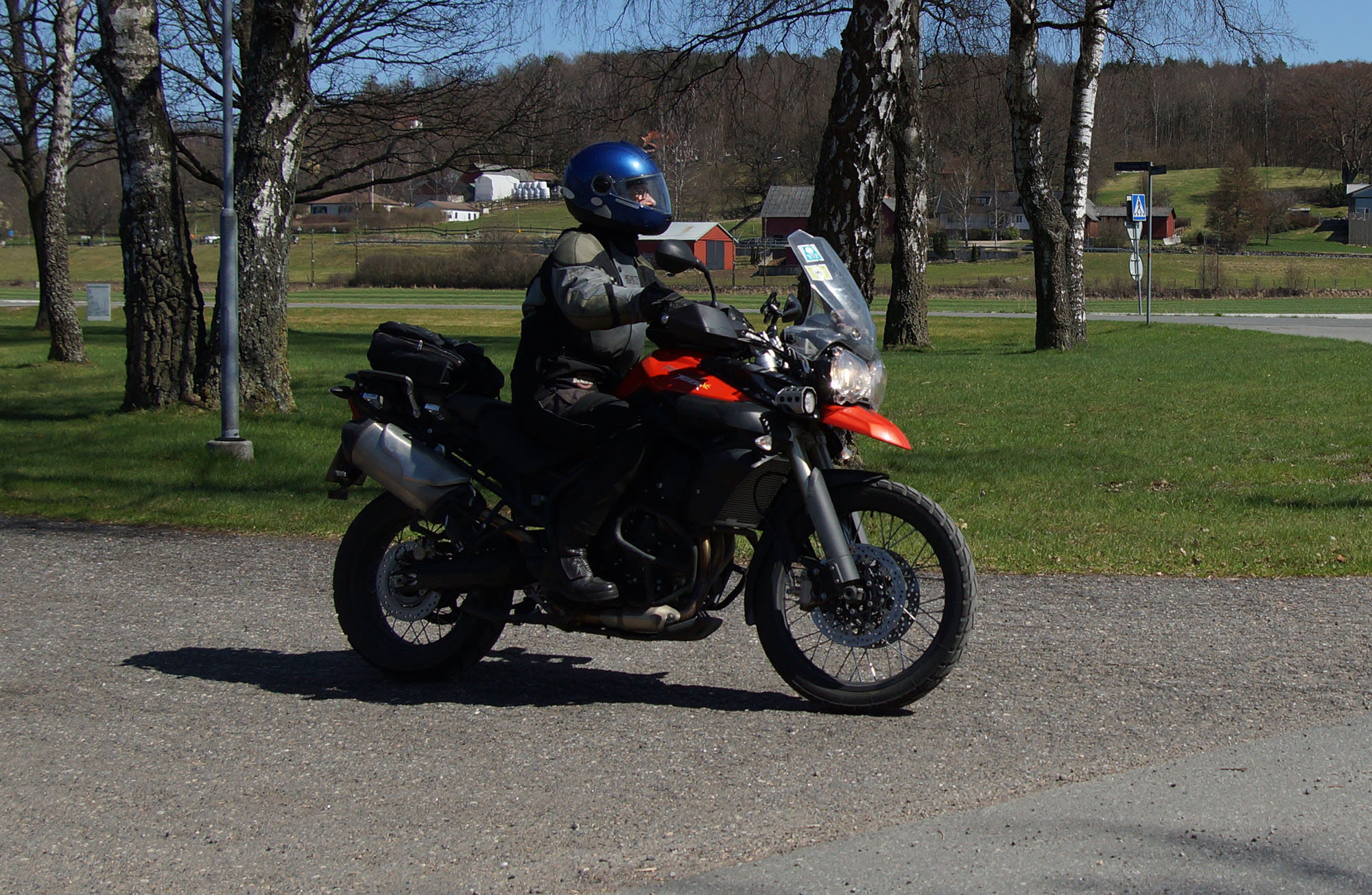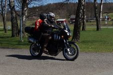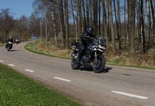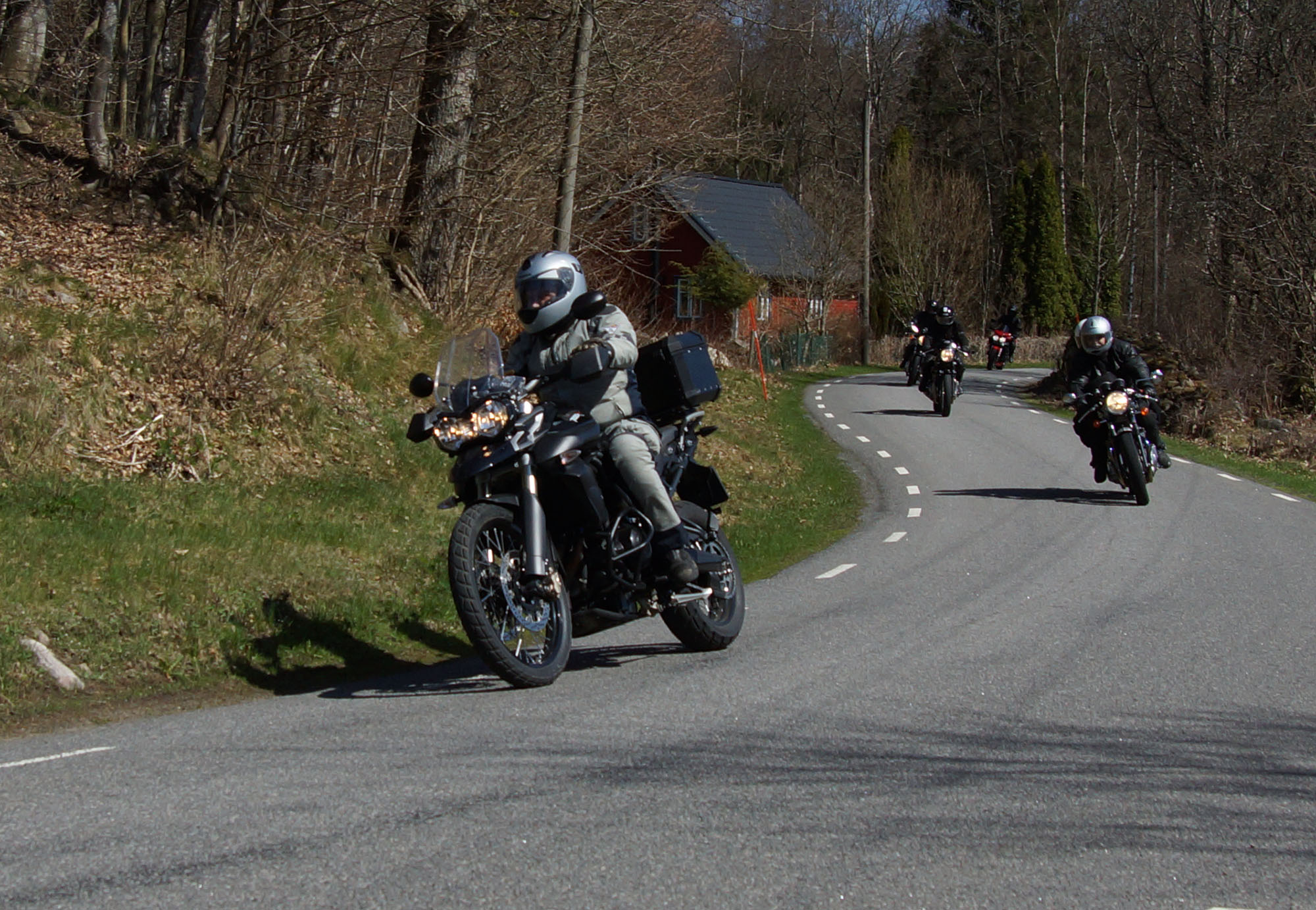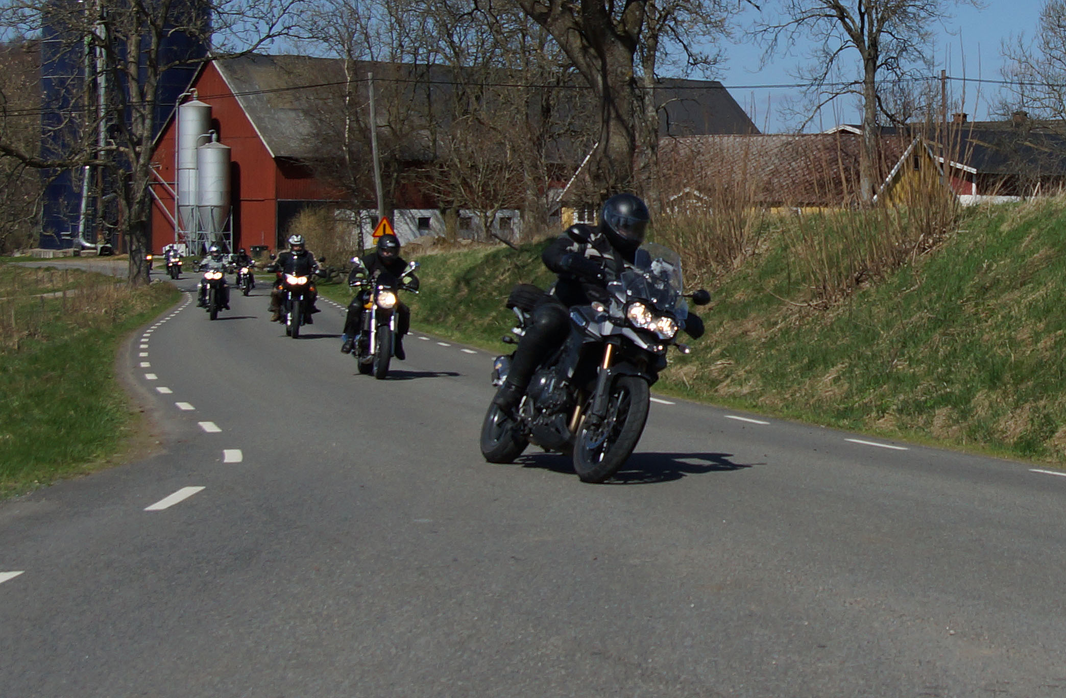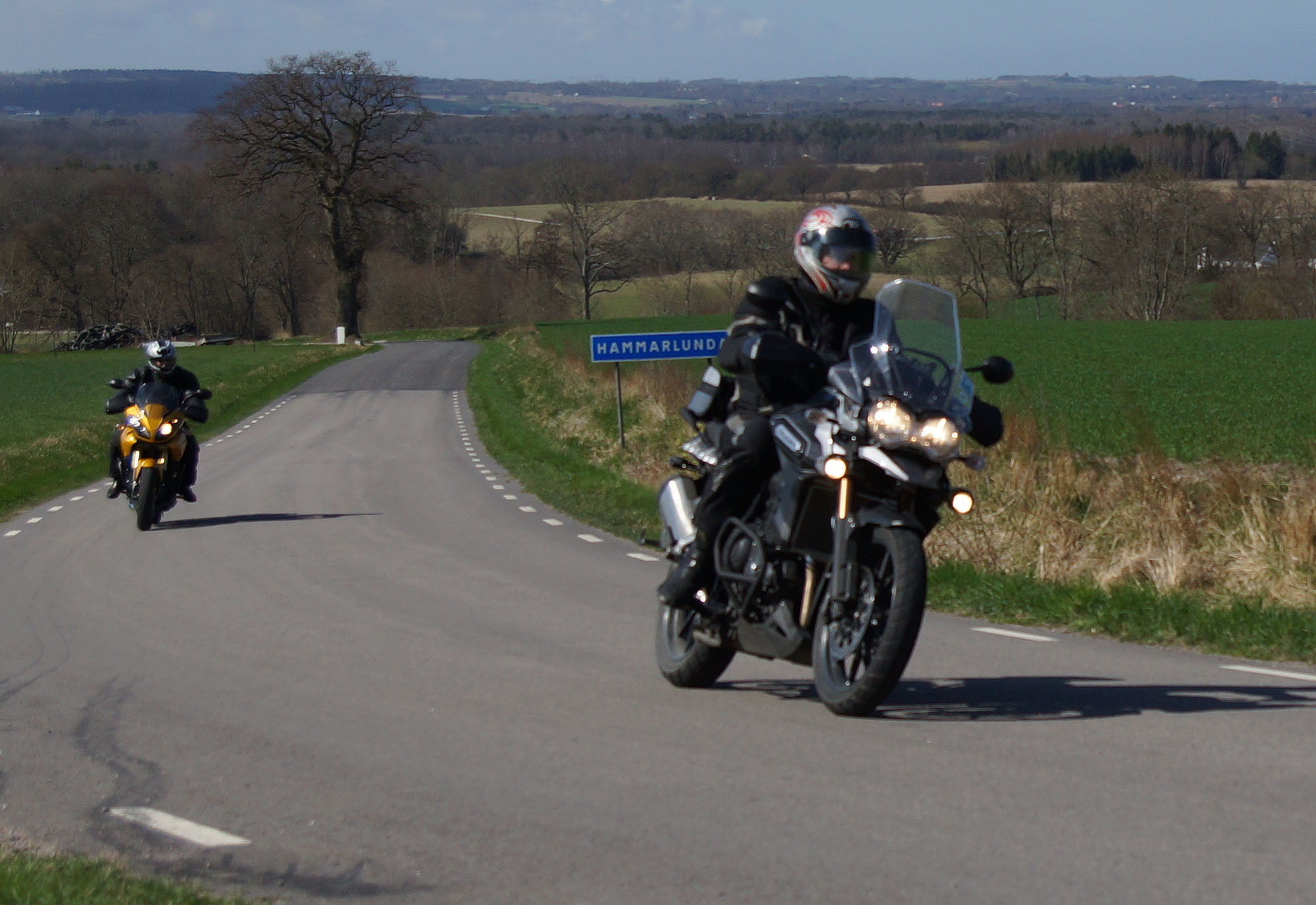 Mattias på en rød Speed Triple -04, Acke på en Tiger Explorer -12 og