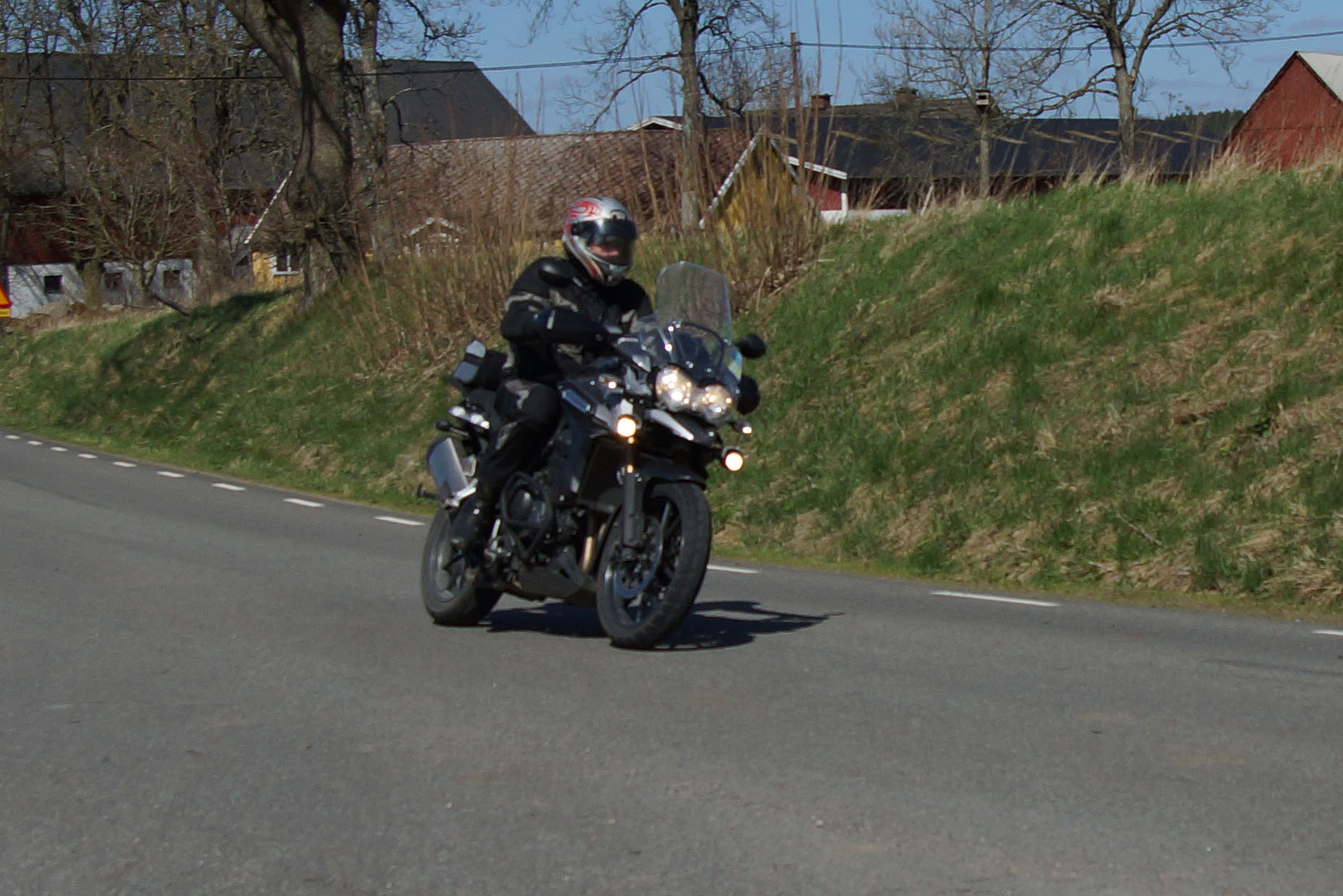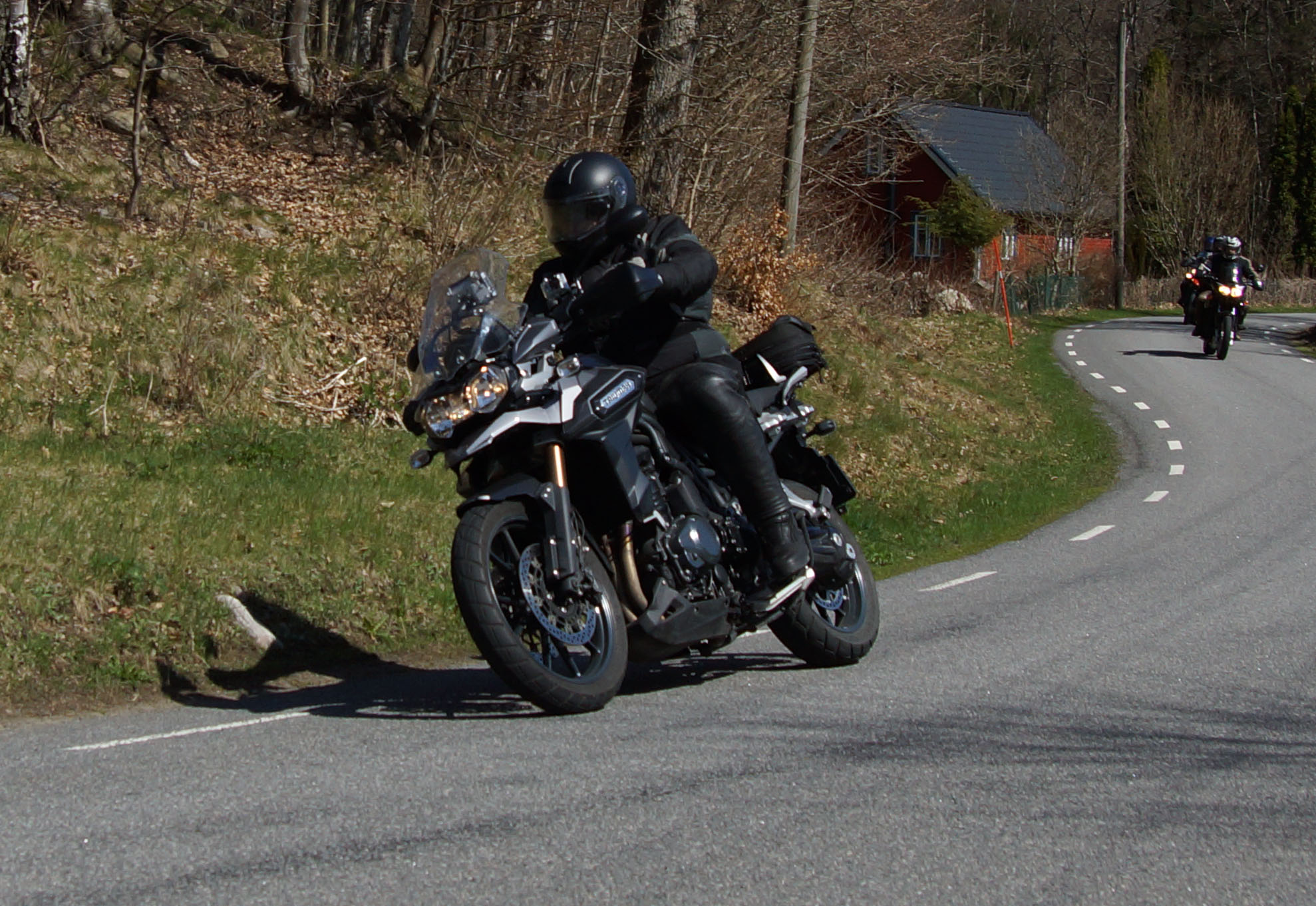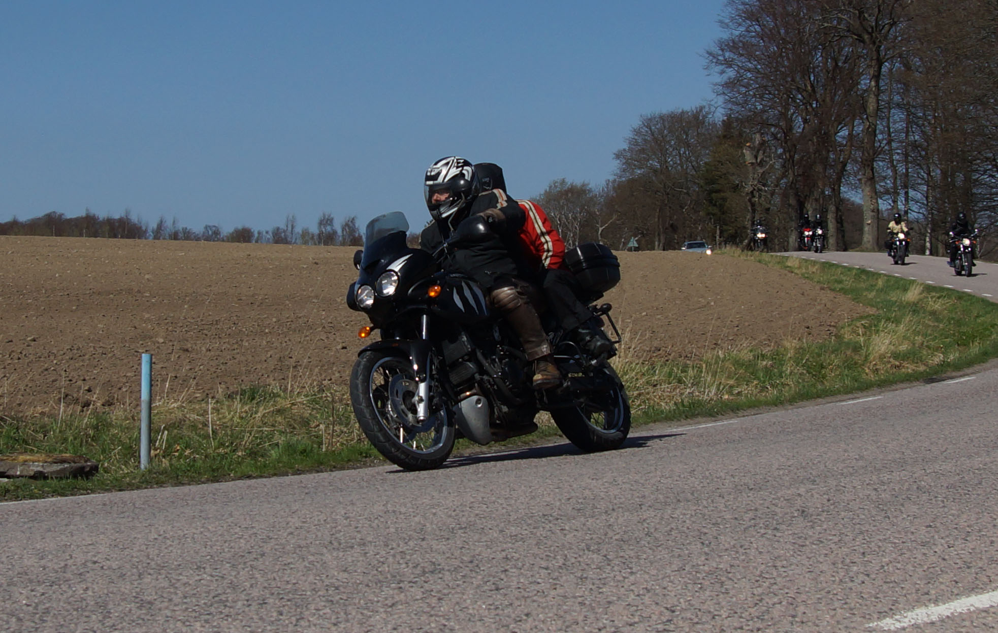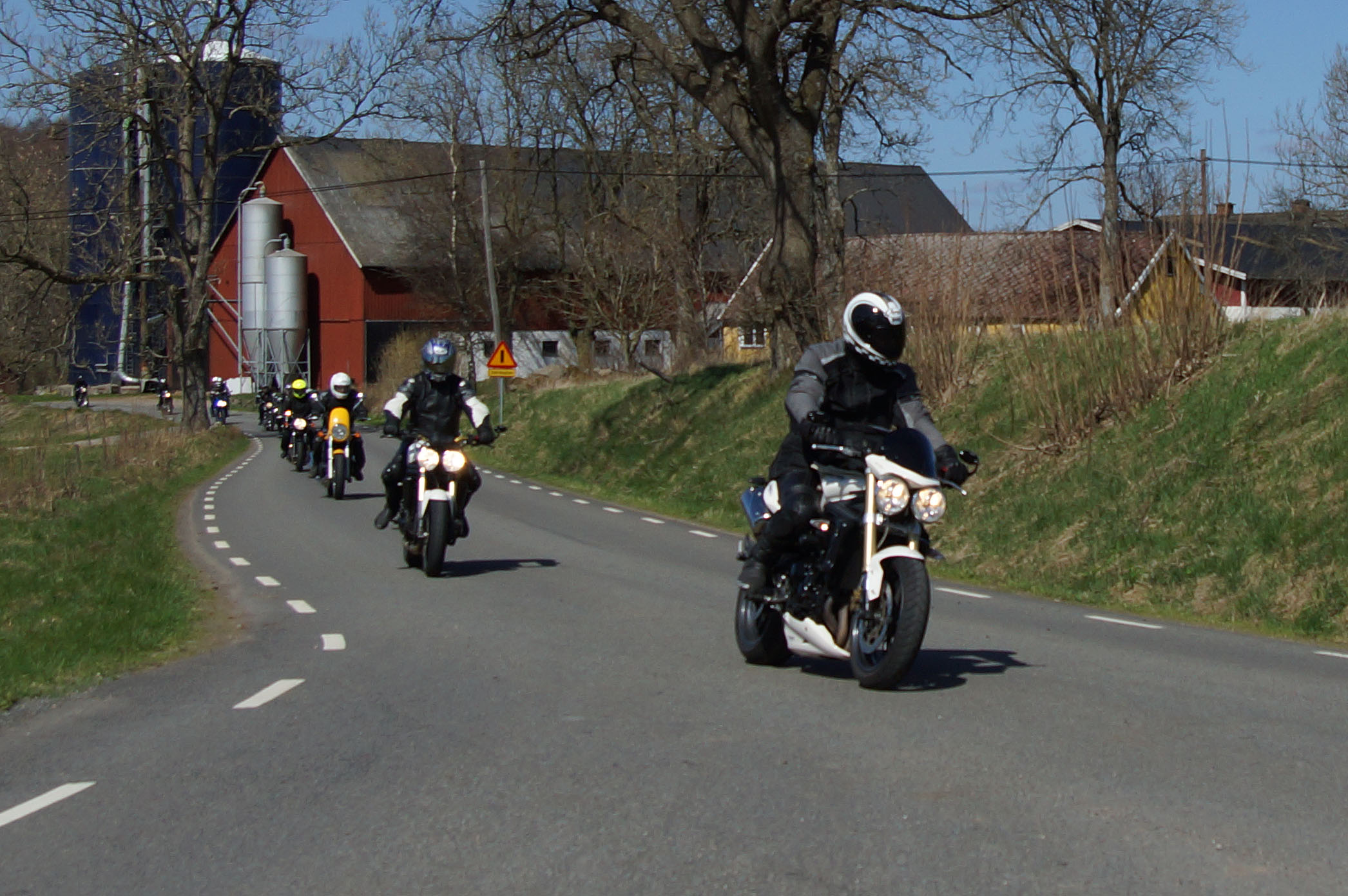 Mattias på en rød Speed Triple -04, Acke på en Tiger Explorer -12 og