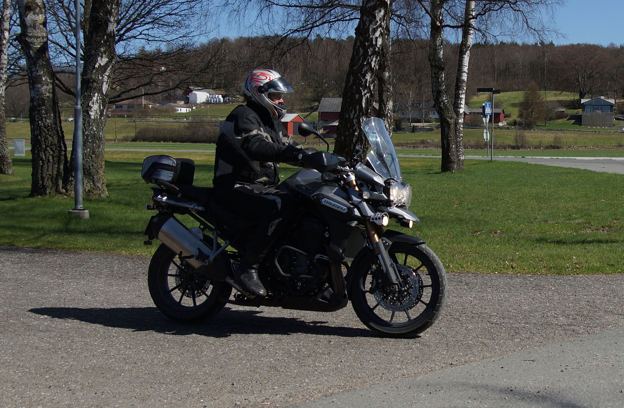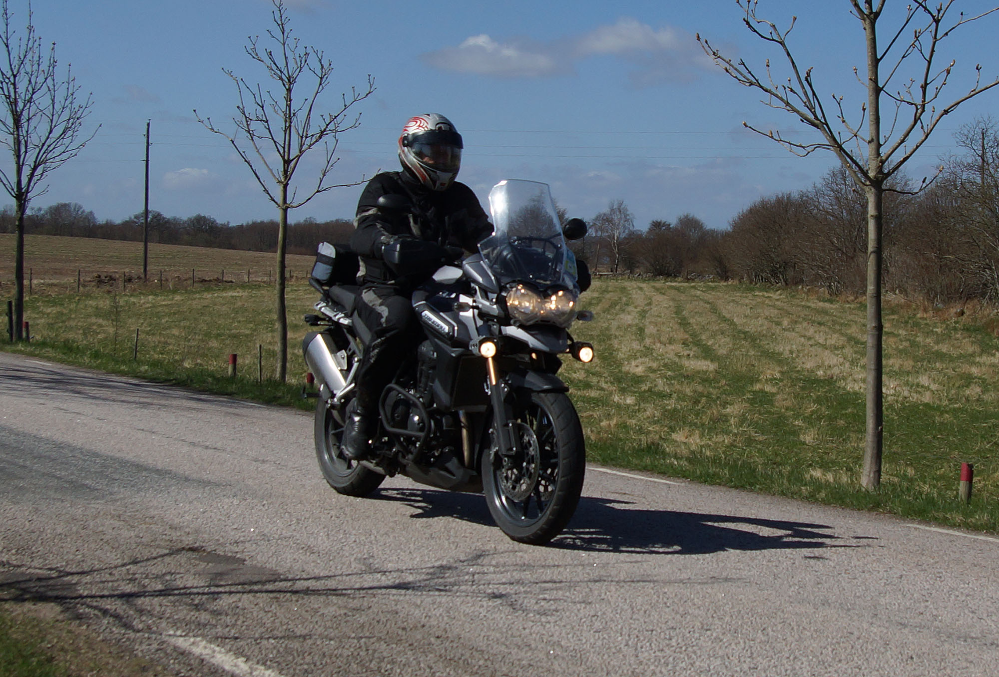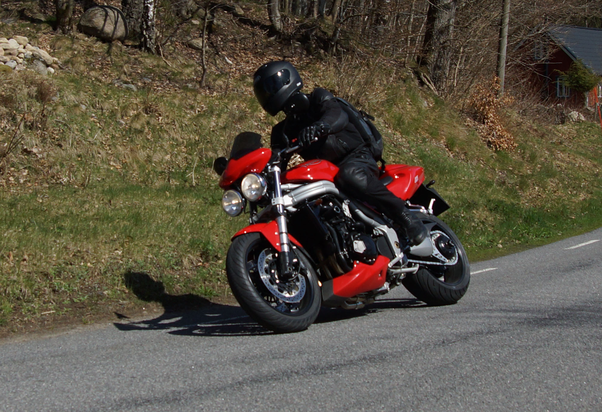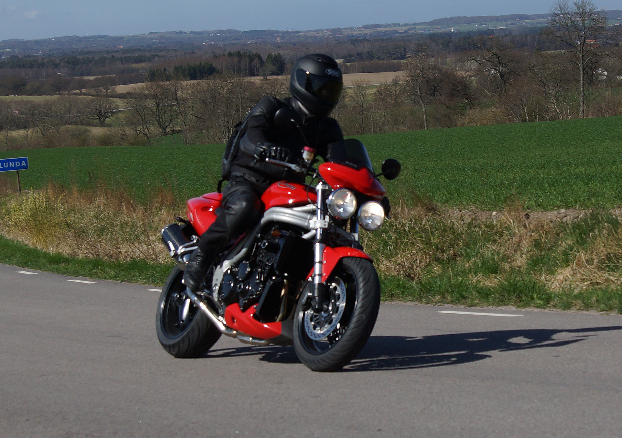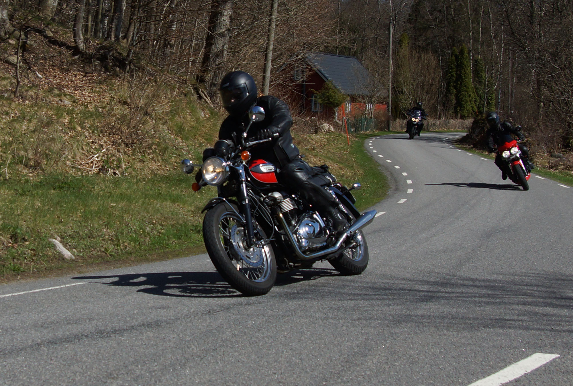 Mattias på en rød Speed Triple -04, Acke på en Tiger Explorer -12 og