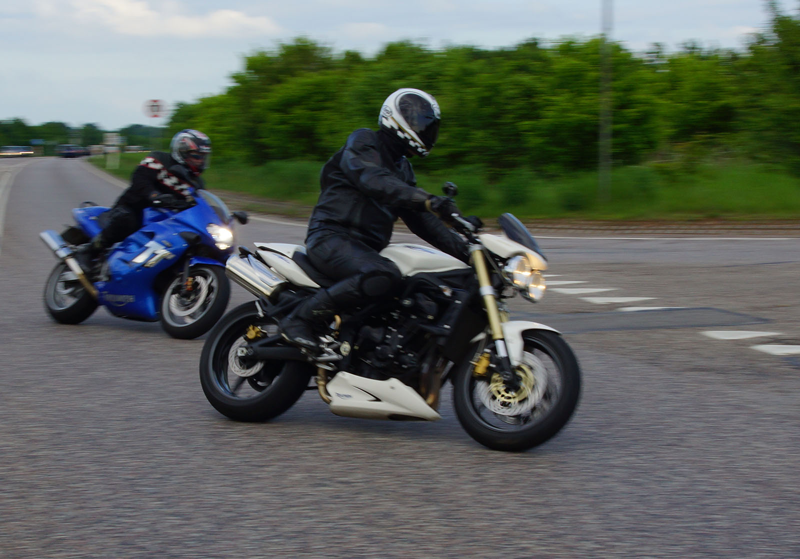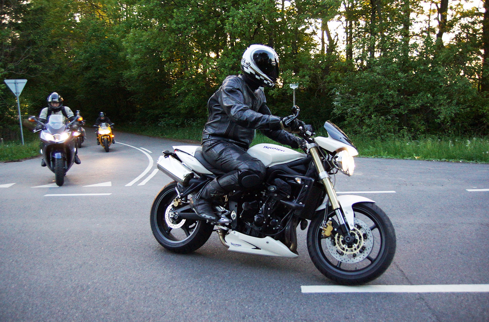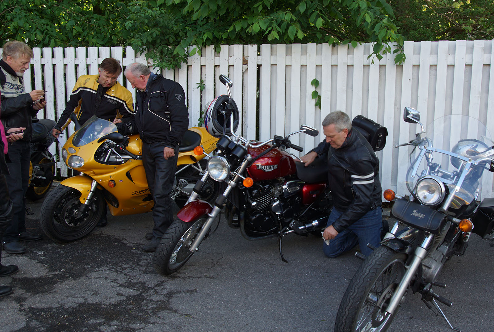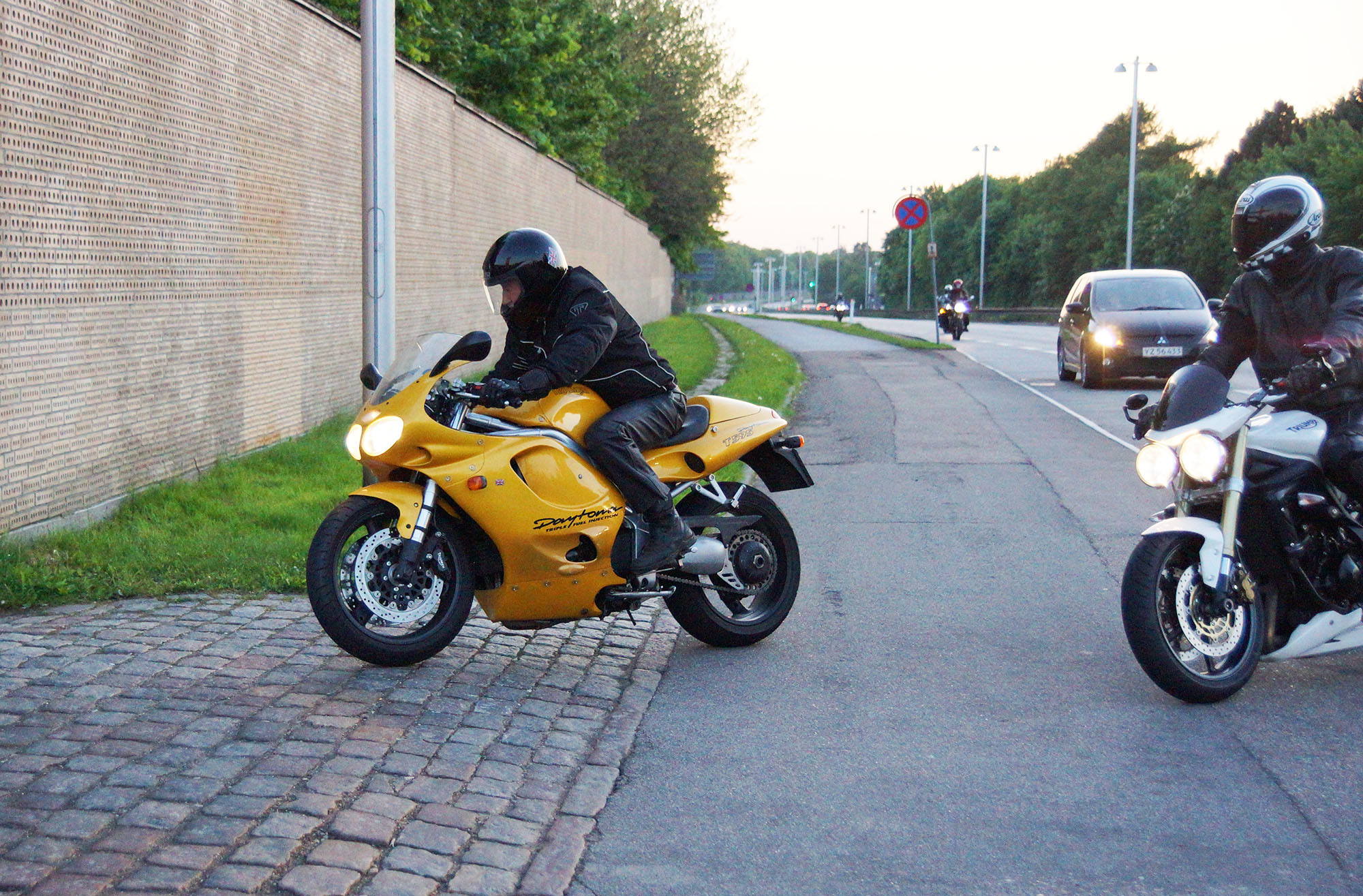 Richard på en rød-hvid Scrambler -07, Klaus på en hvid Street Triple -08,