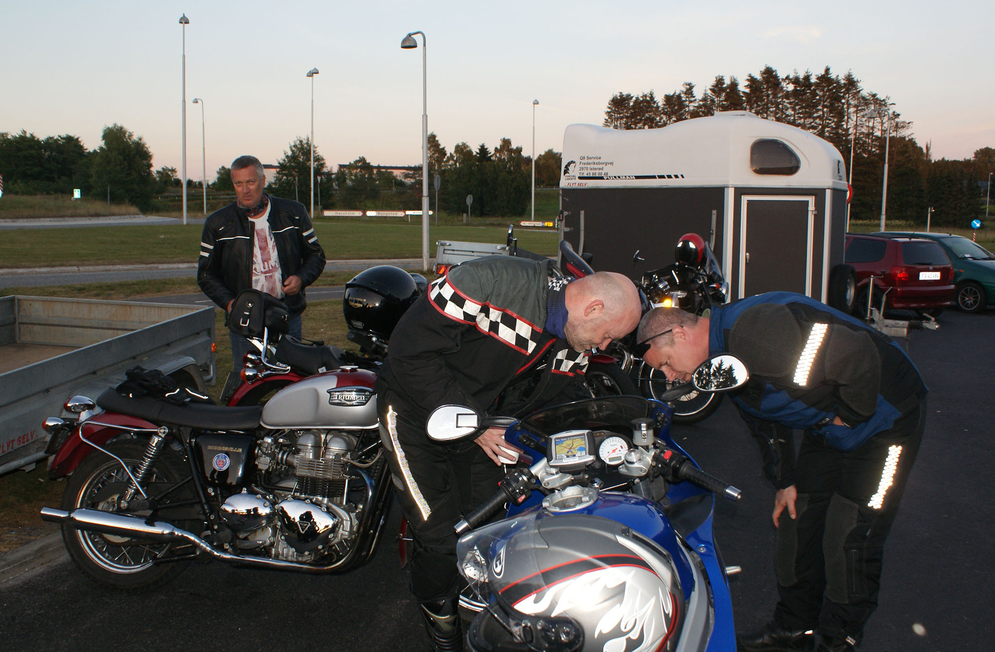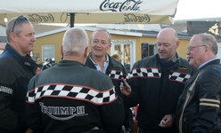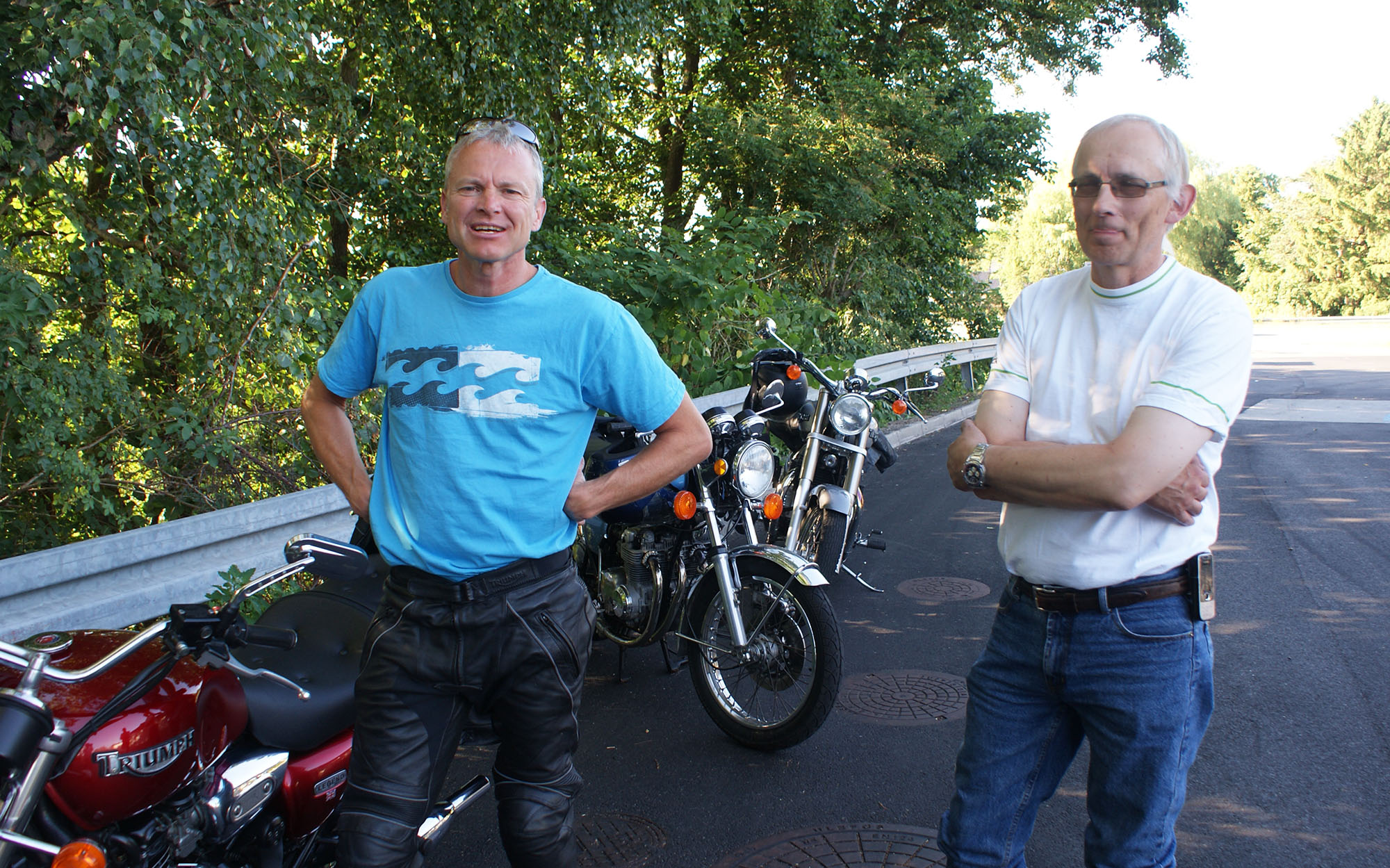 Tom på en rød Legend-00, Peter på en sølv America-06, Per på en orange/hvid Bonneville-06,