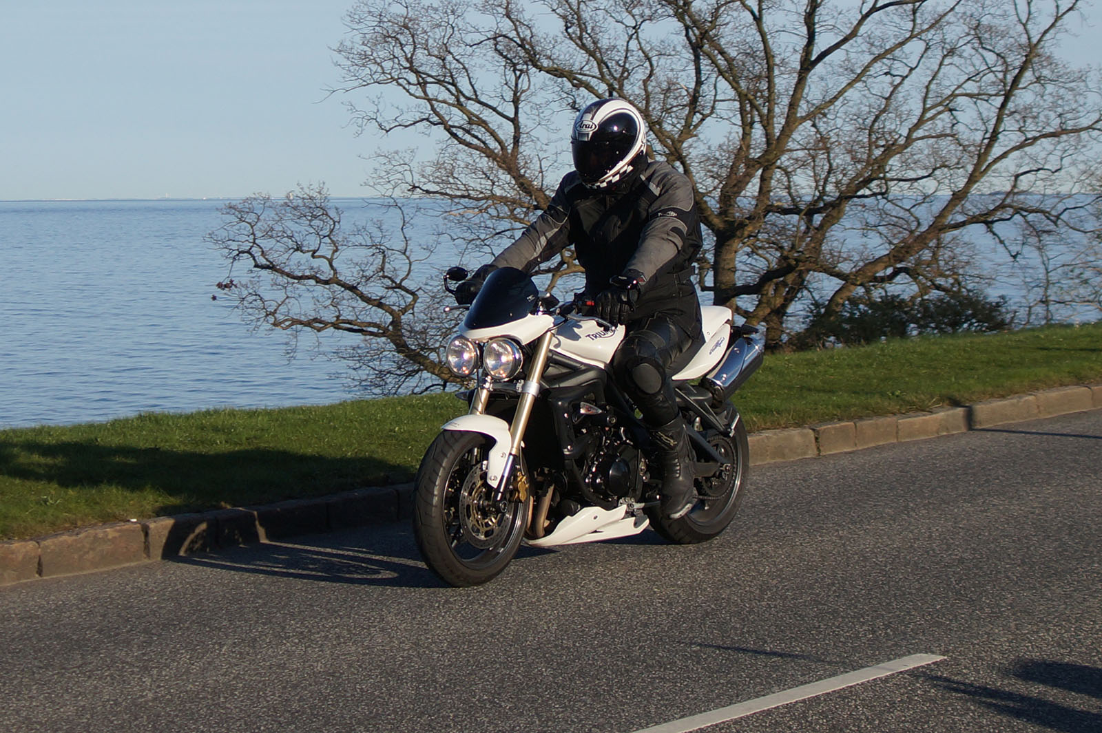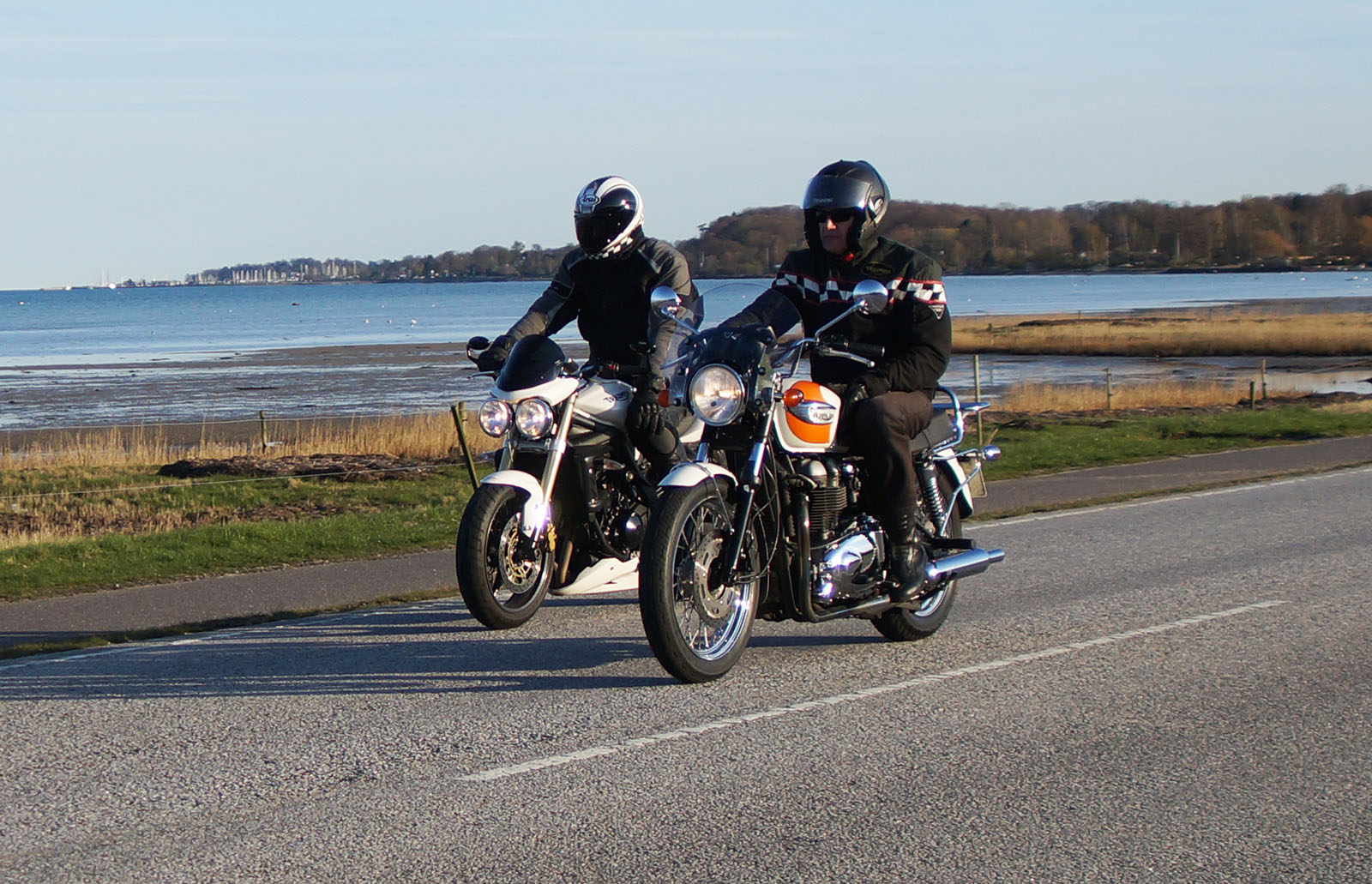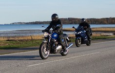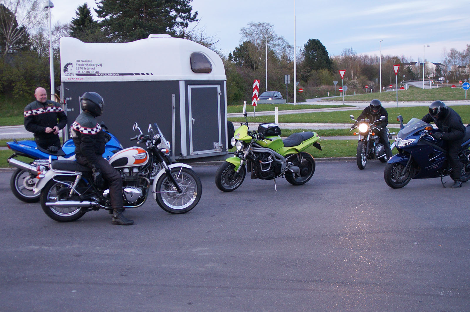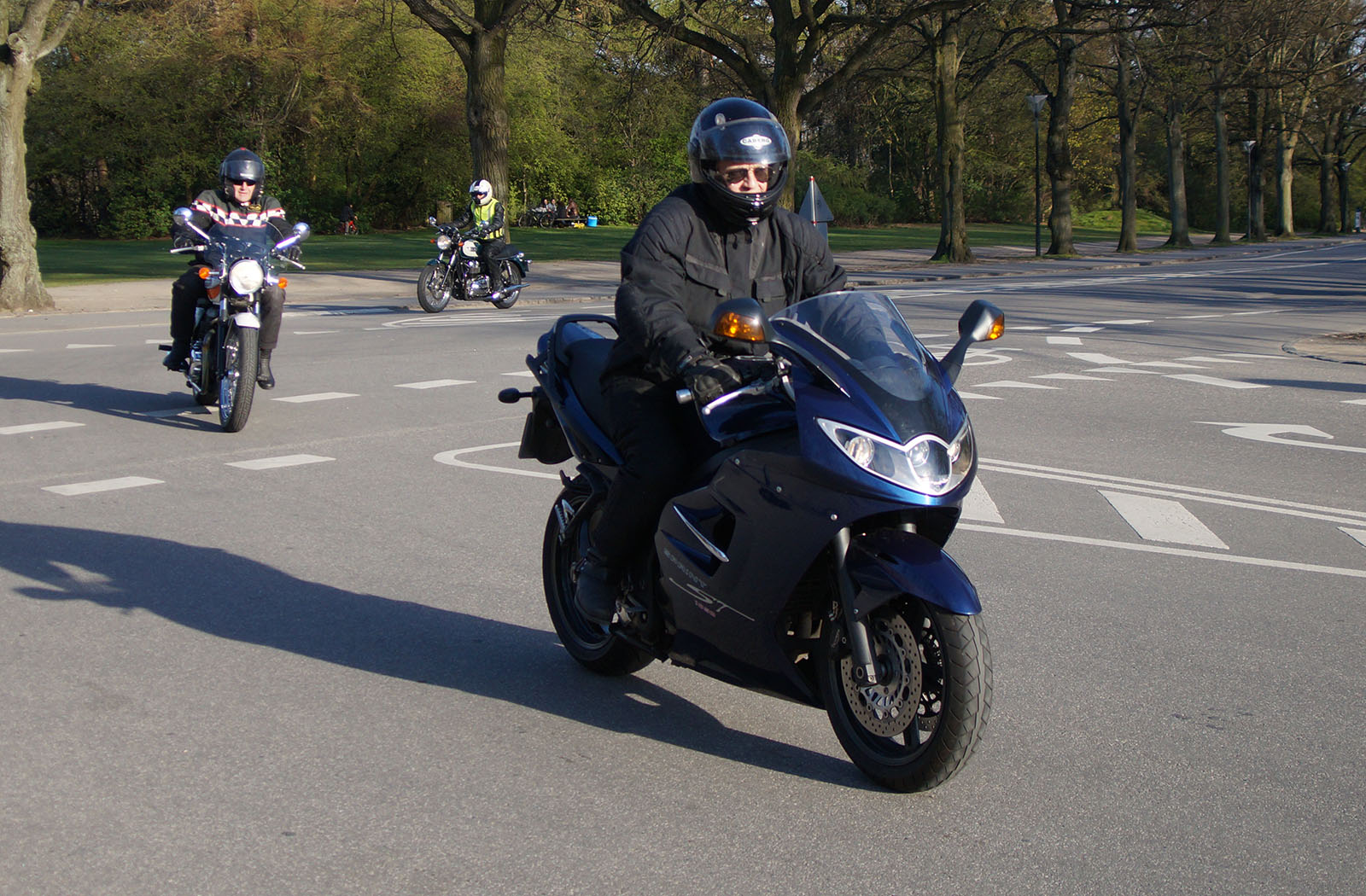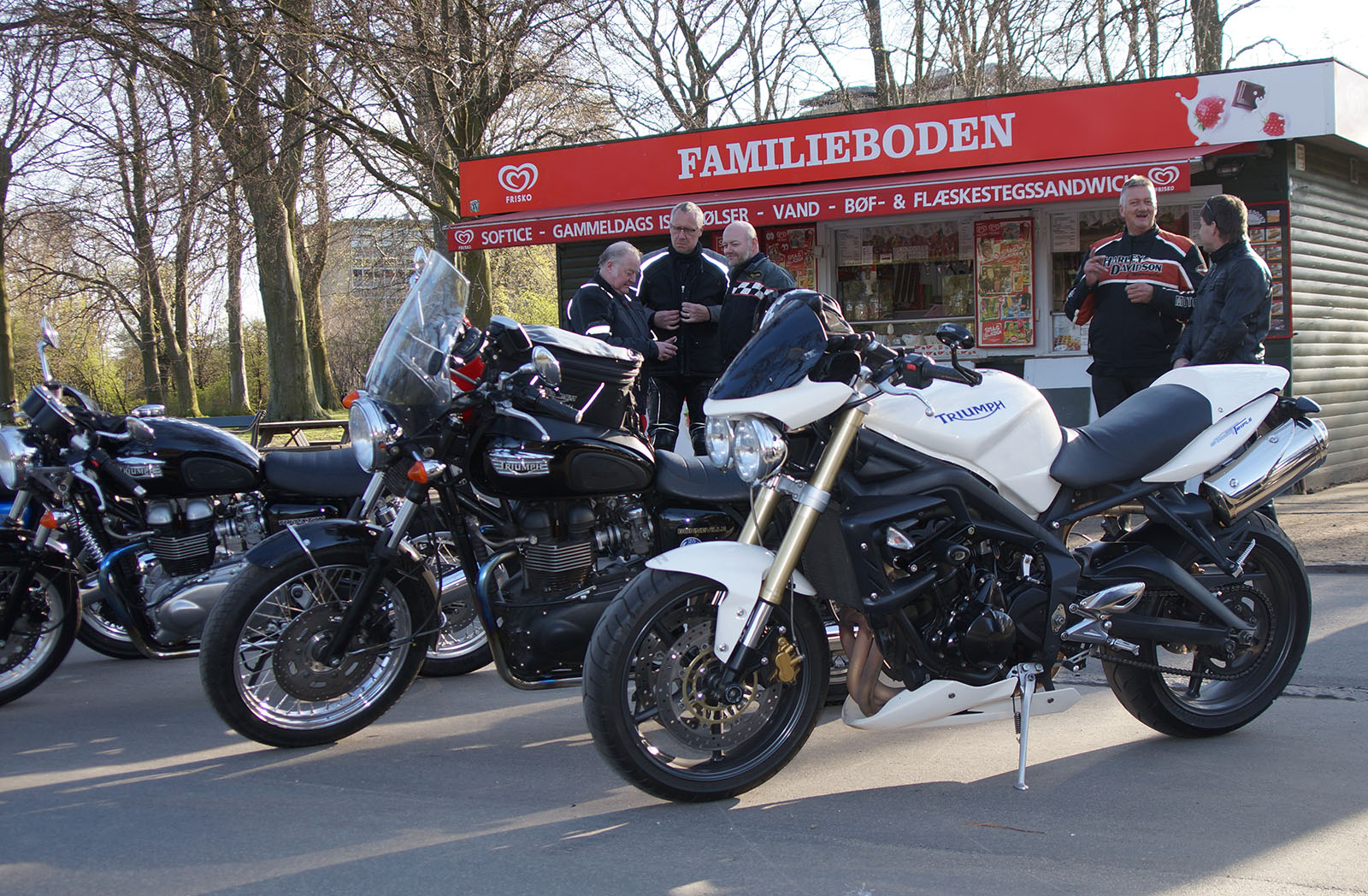 en sort Bonneville -08, Klaus på en hvid Street Triple -08, Jesper på en mørkeblå