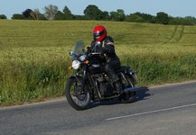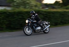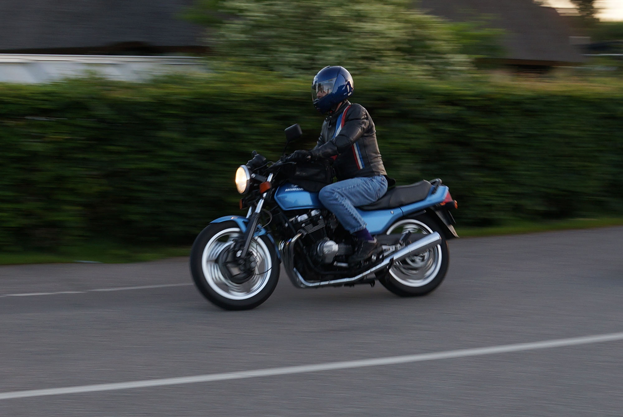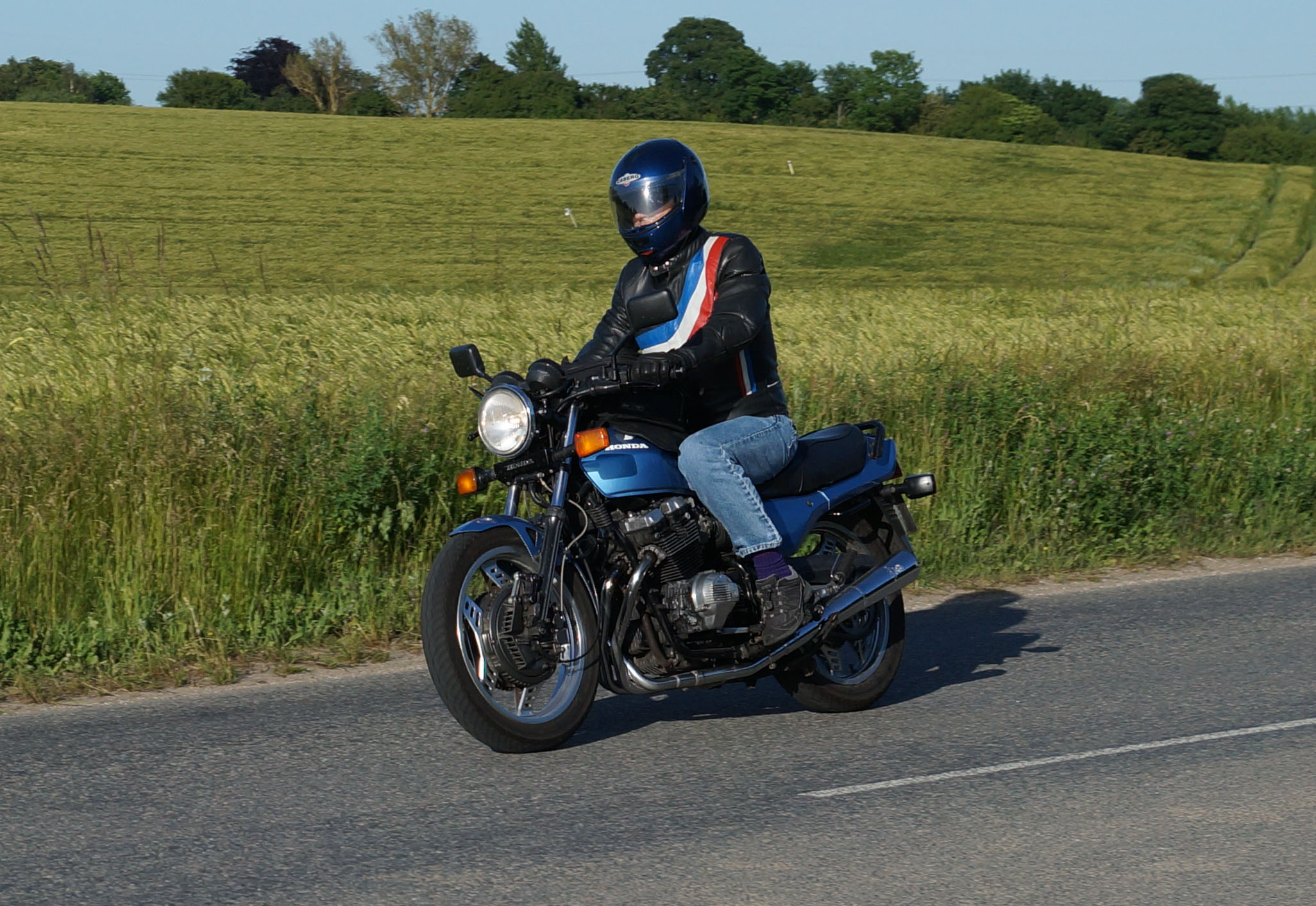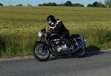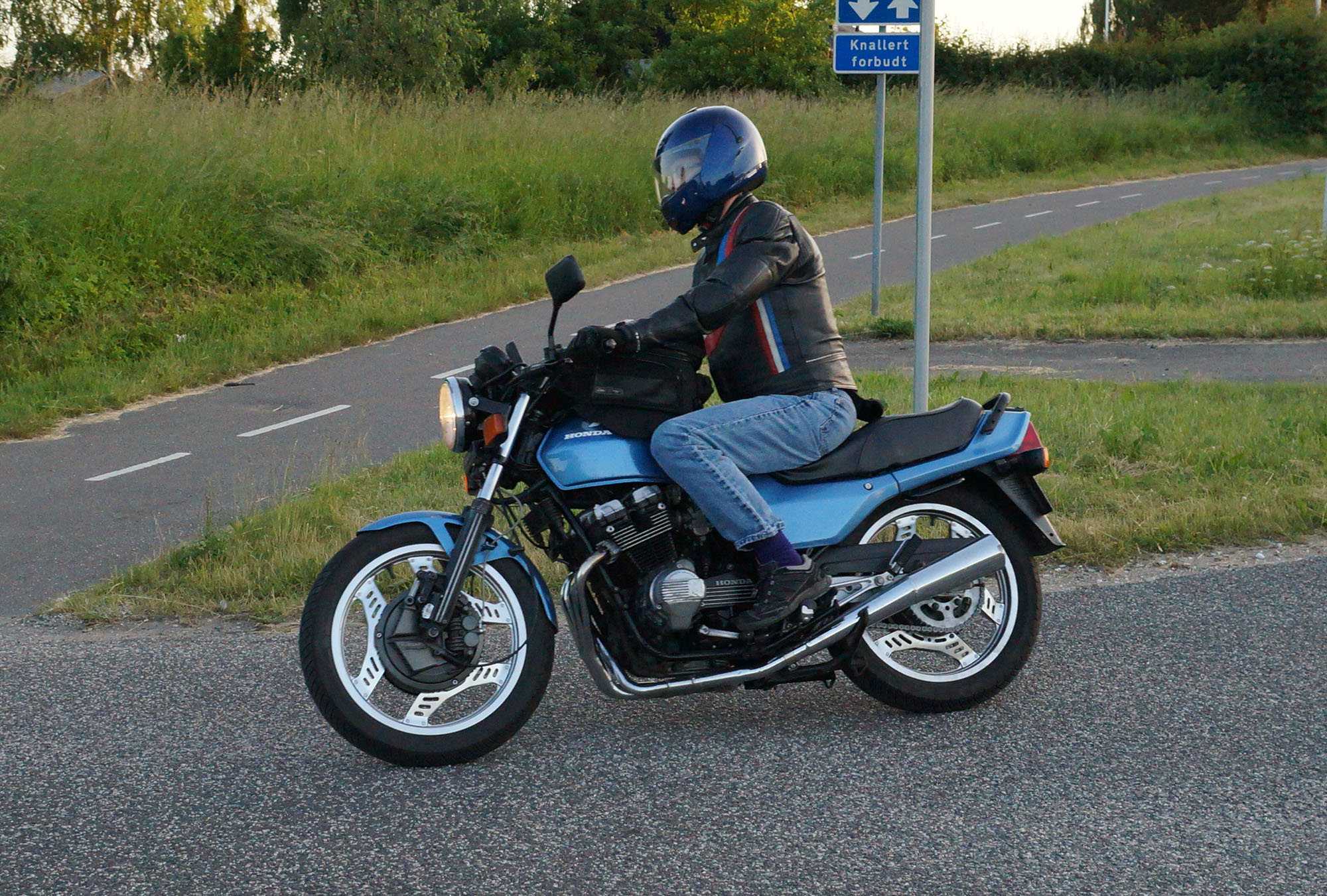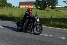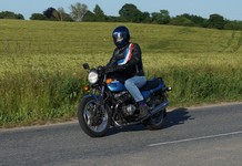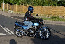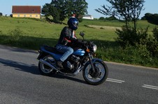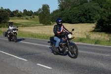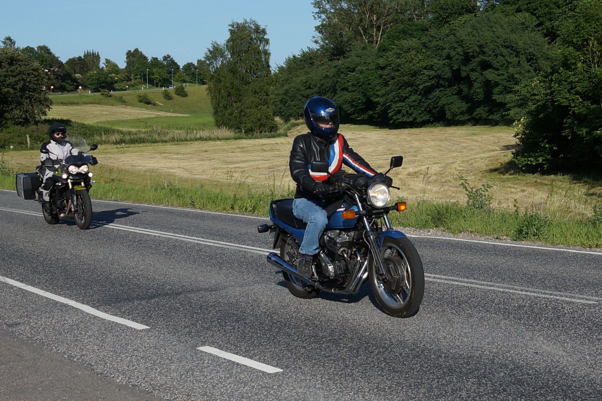Søren på sin egenrestaurerede lyseblå CBX 550 -84, Mogens på den sorte Bonneville -08,