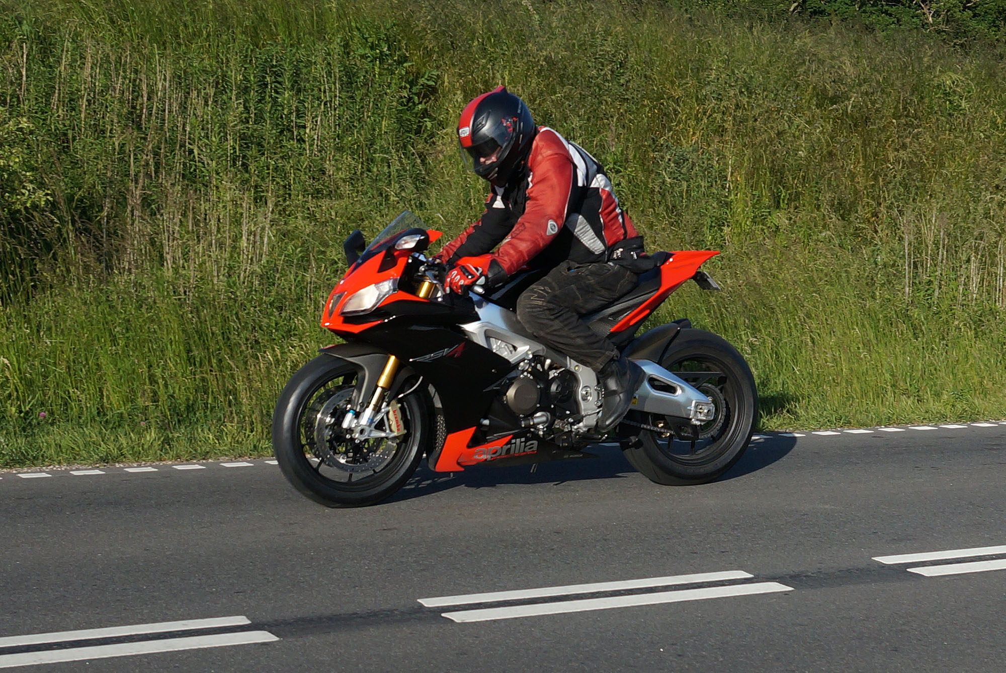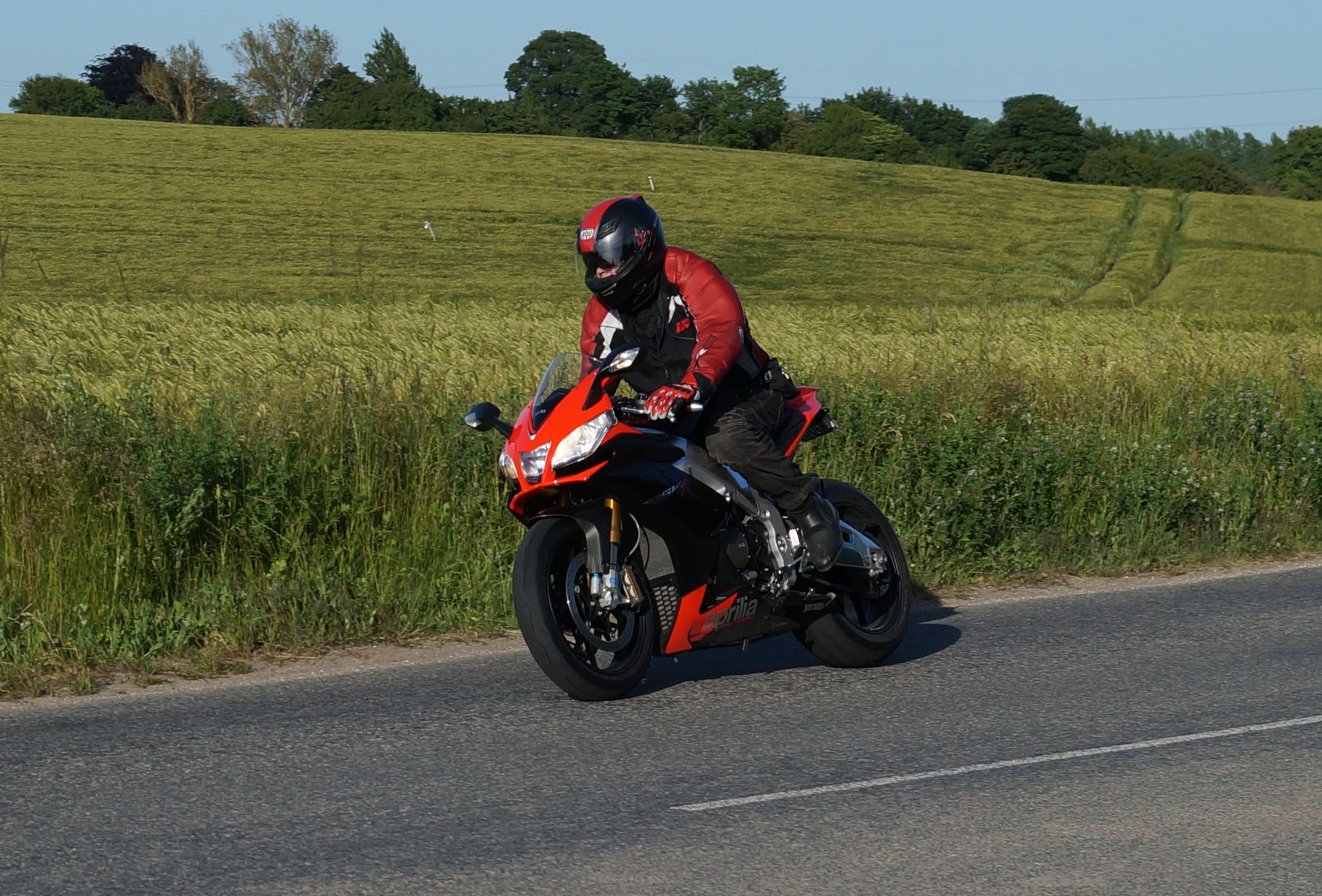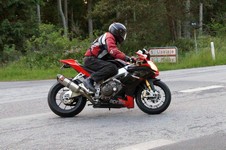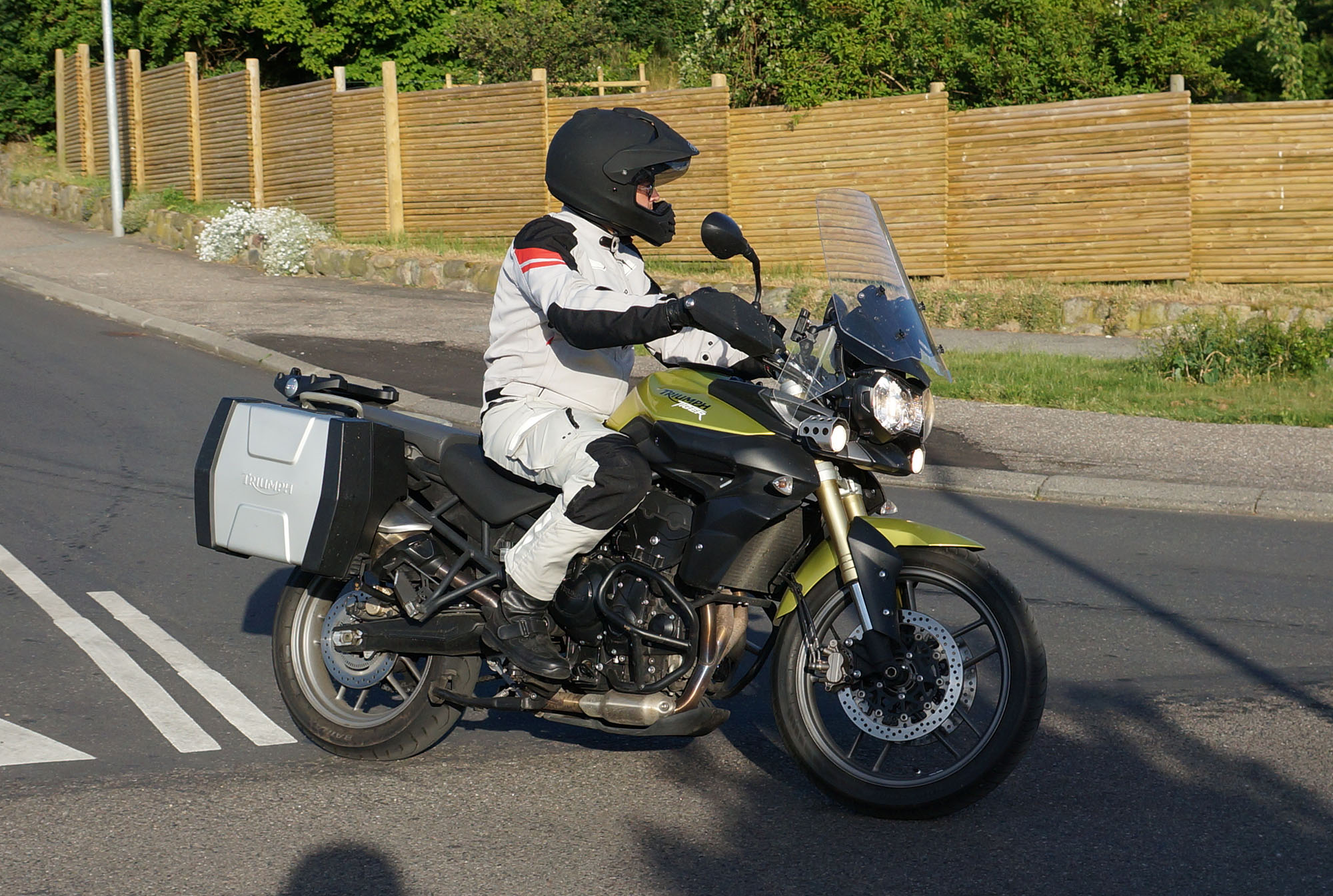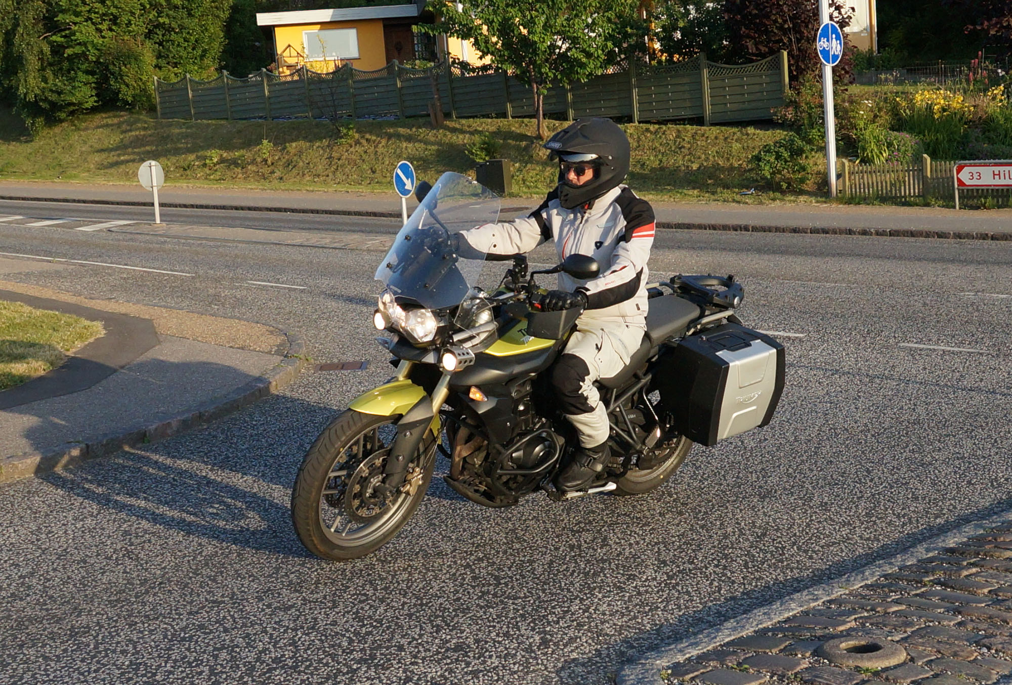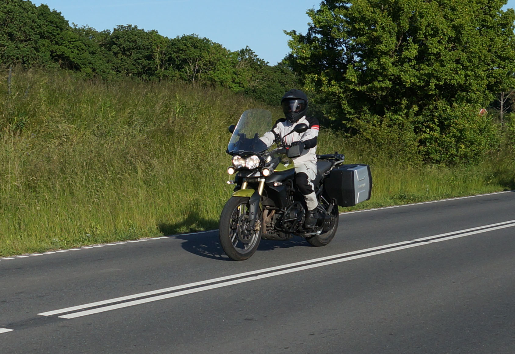 en grøn Tiger 800 -12, Dan på en Aprilia RSV4 -11, og mig selv på en lånt grøn