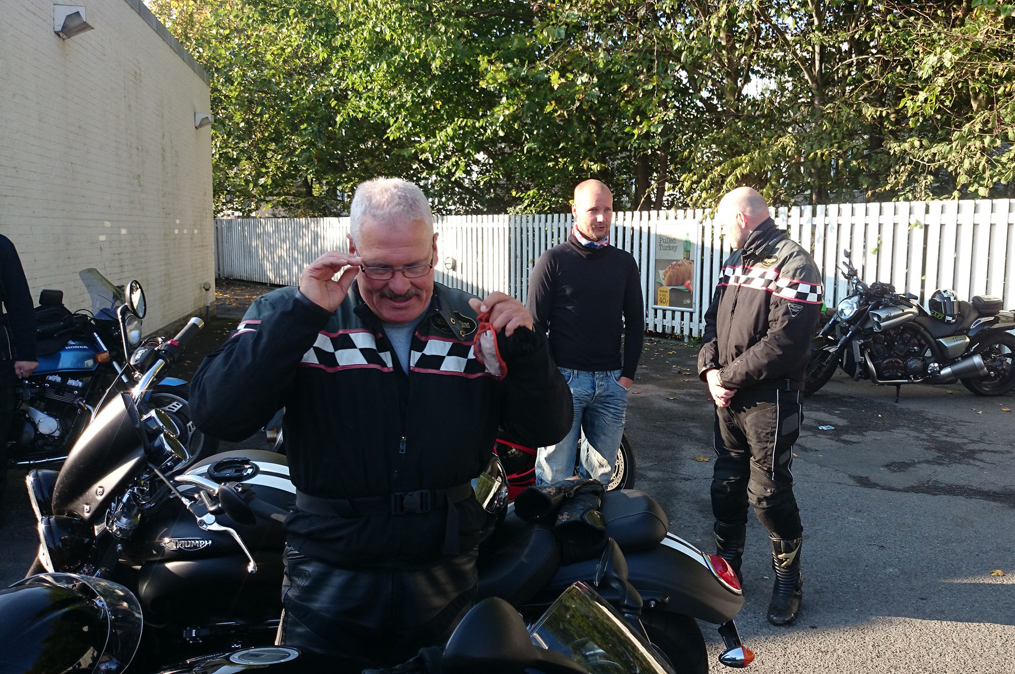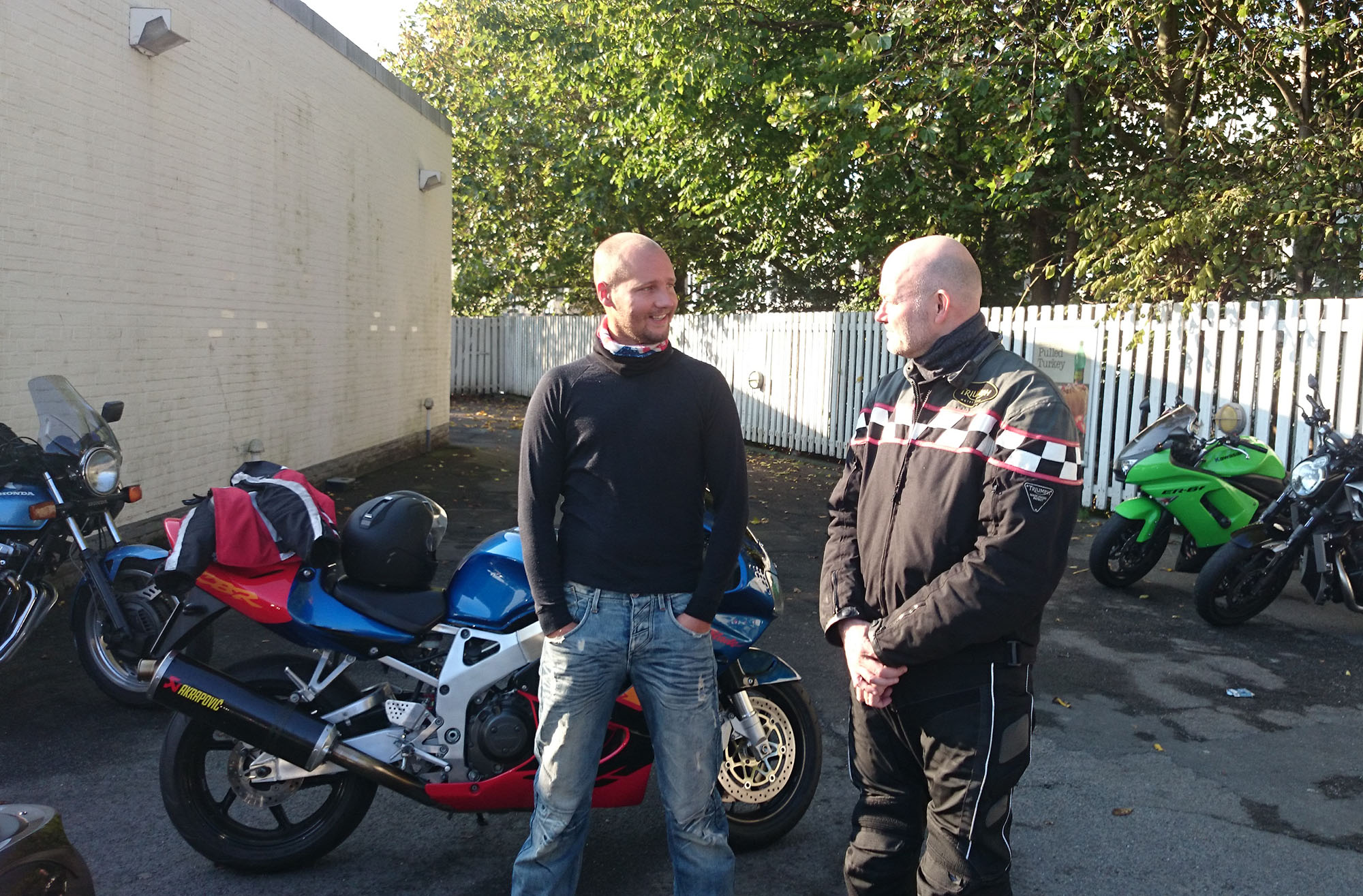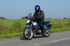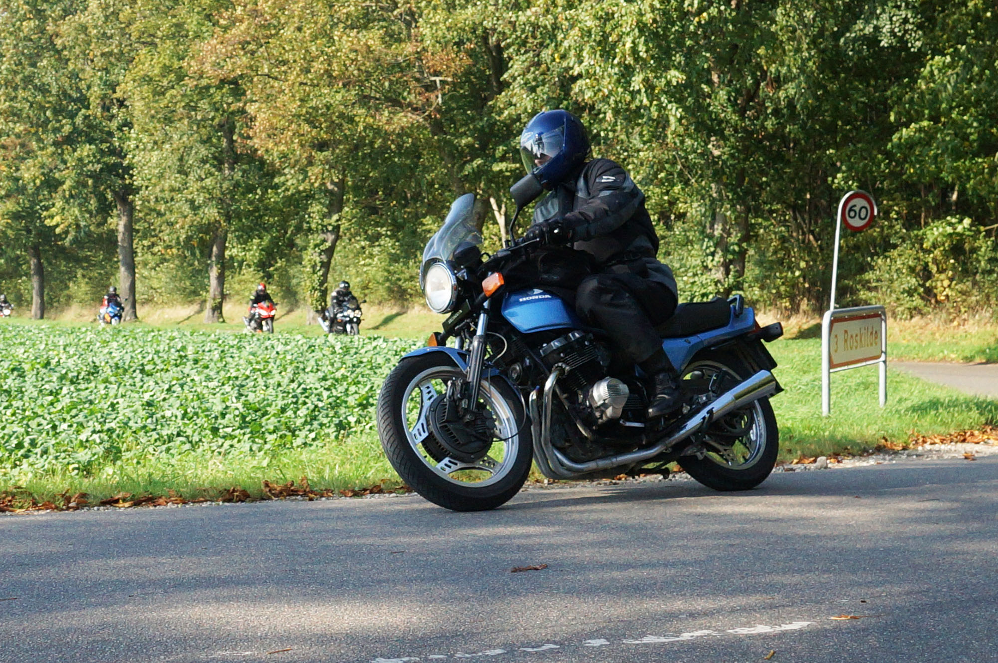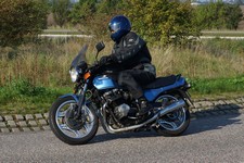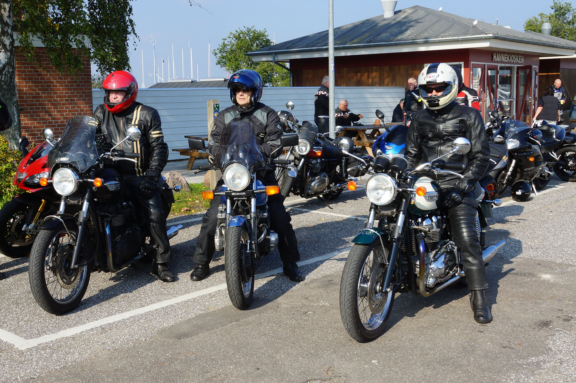 Bonneville -08, Søren på en blå CBX 550 -84, Steen på en grøn Bonneville -06,