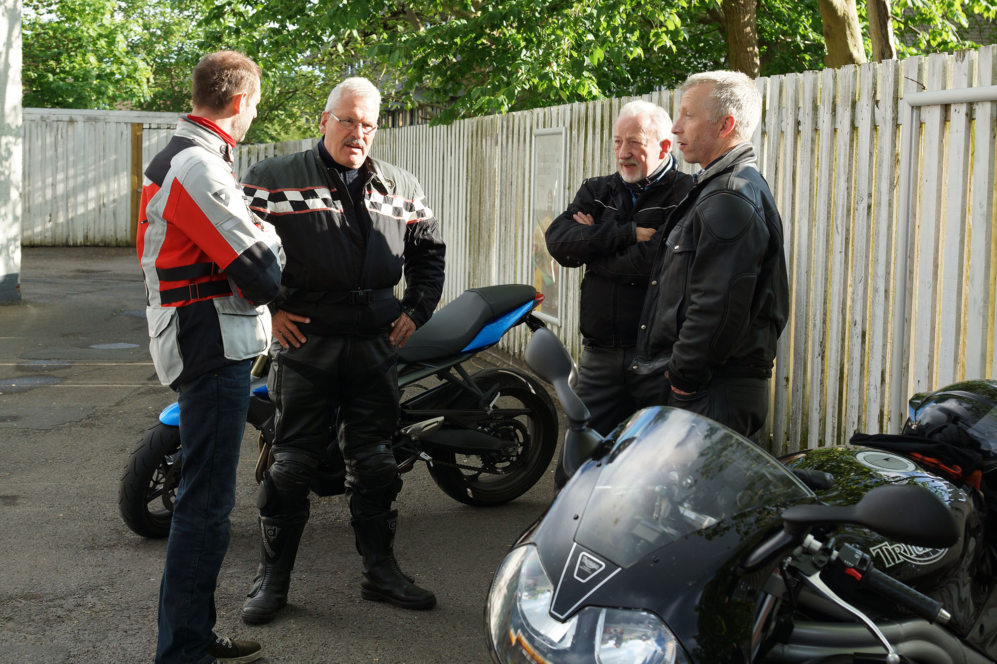 Daytona 955 -03, Karl på den sorte Thruxton -05, Hardy på den sorte Speedmaster -07,