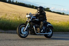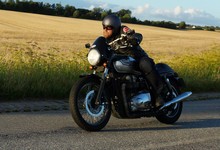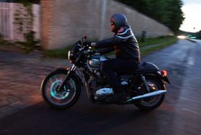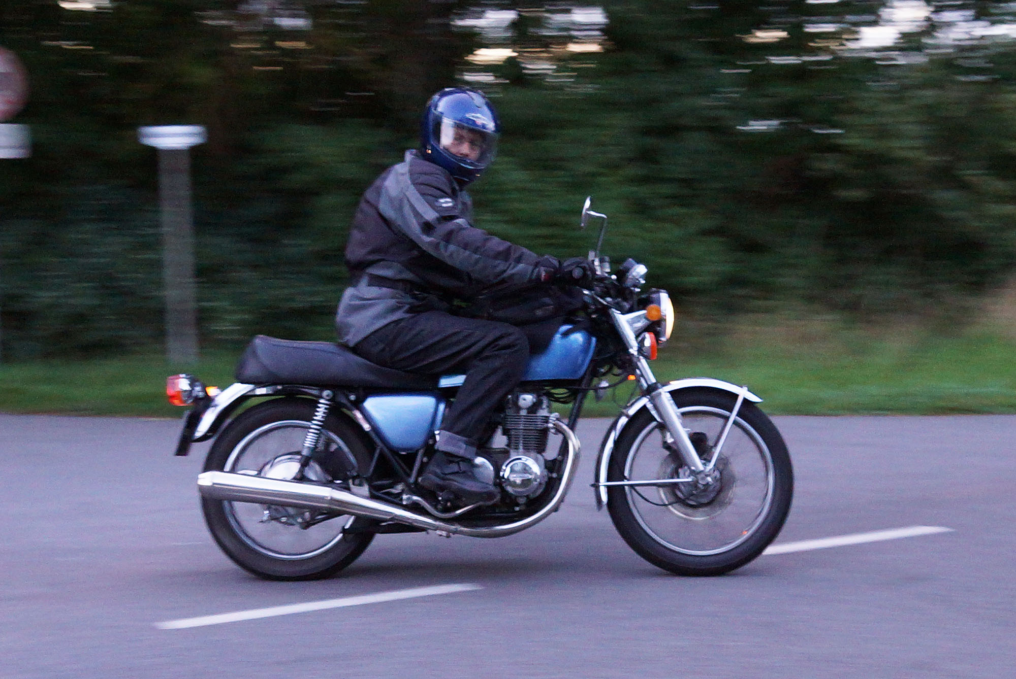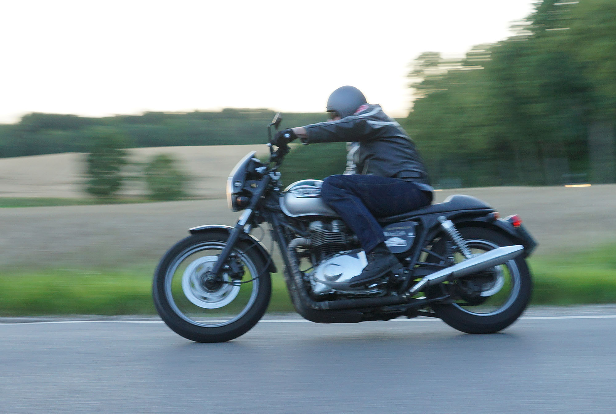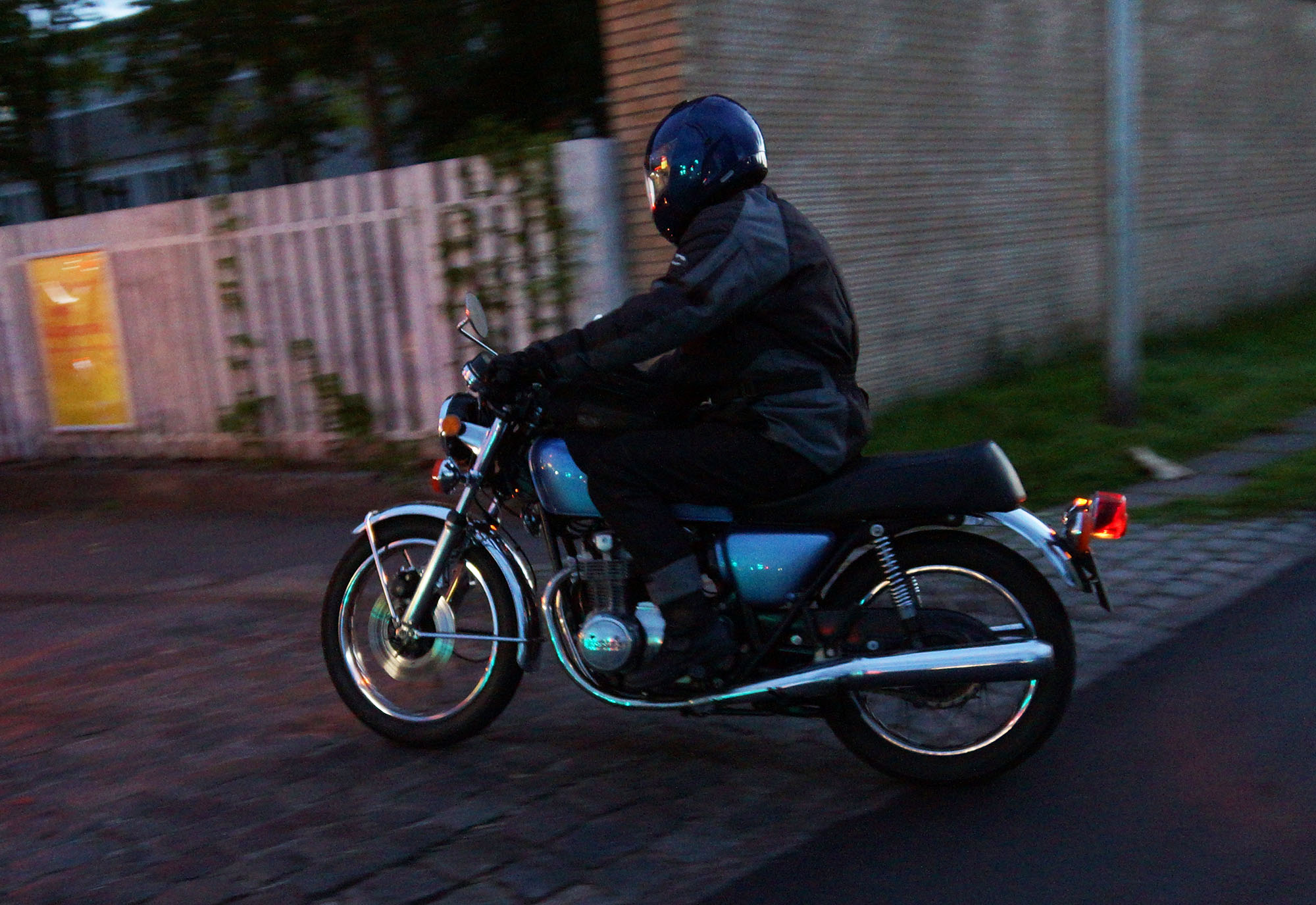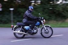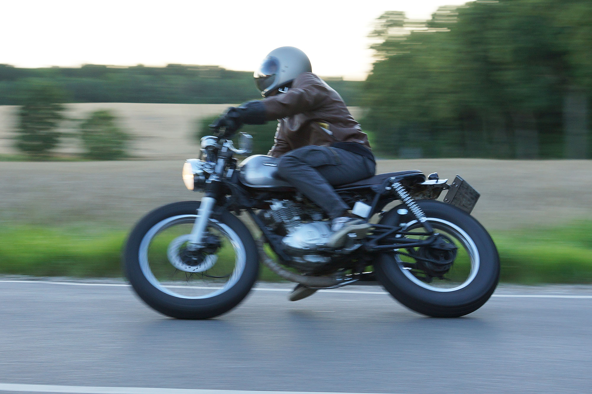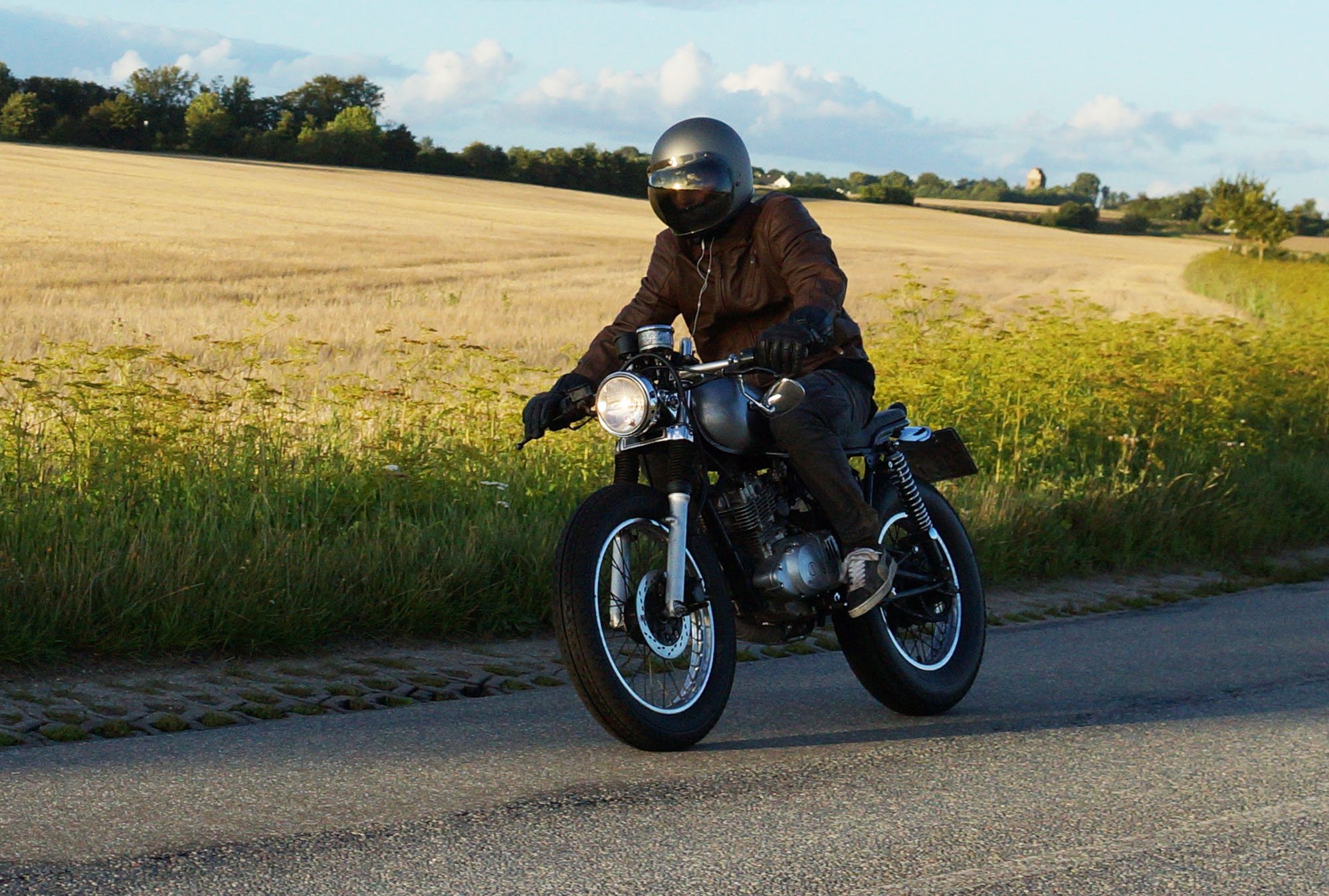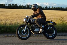 en ung gut på en 125cc ombygged til cafe racer der hægte på og kørte med