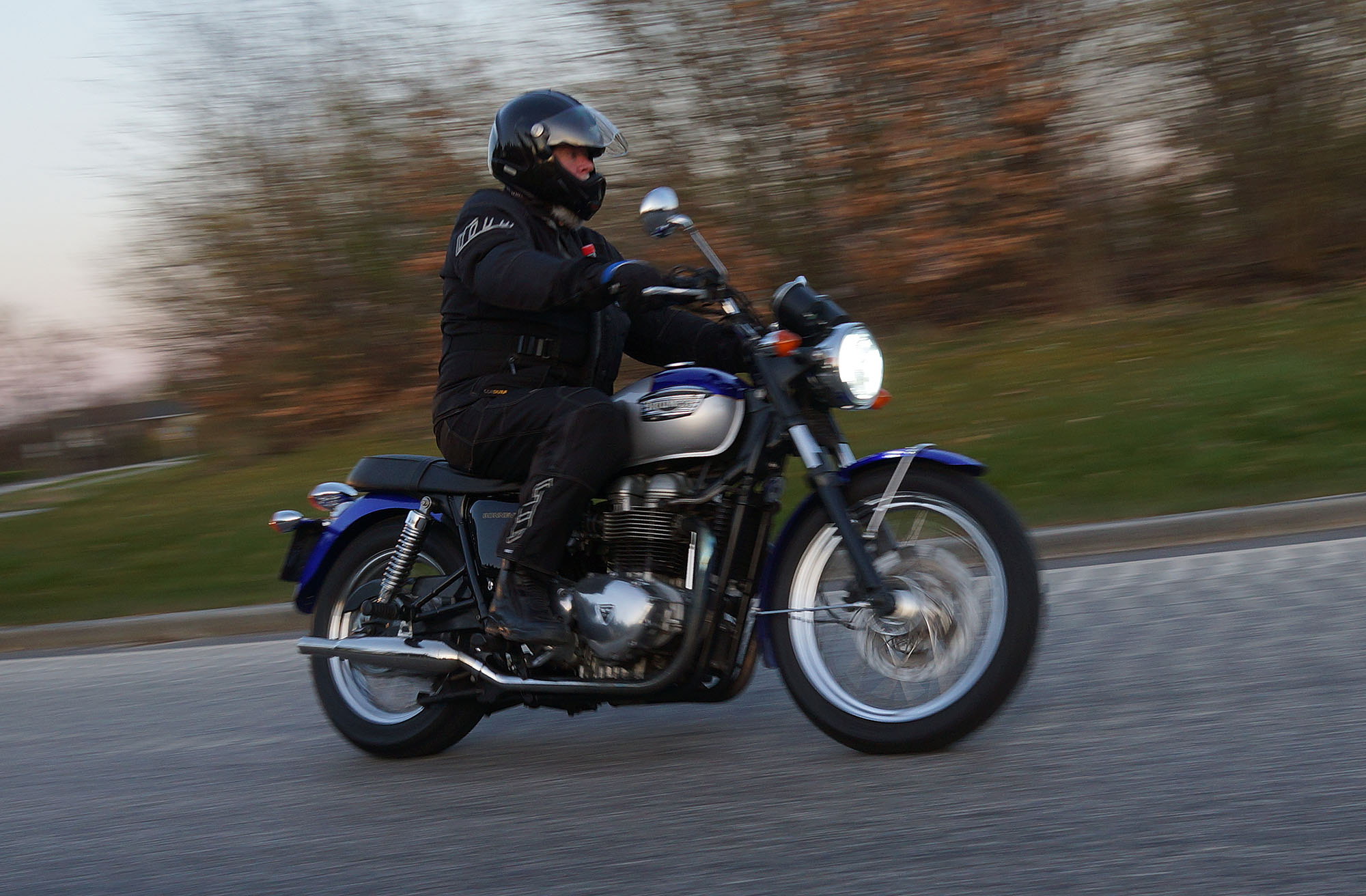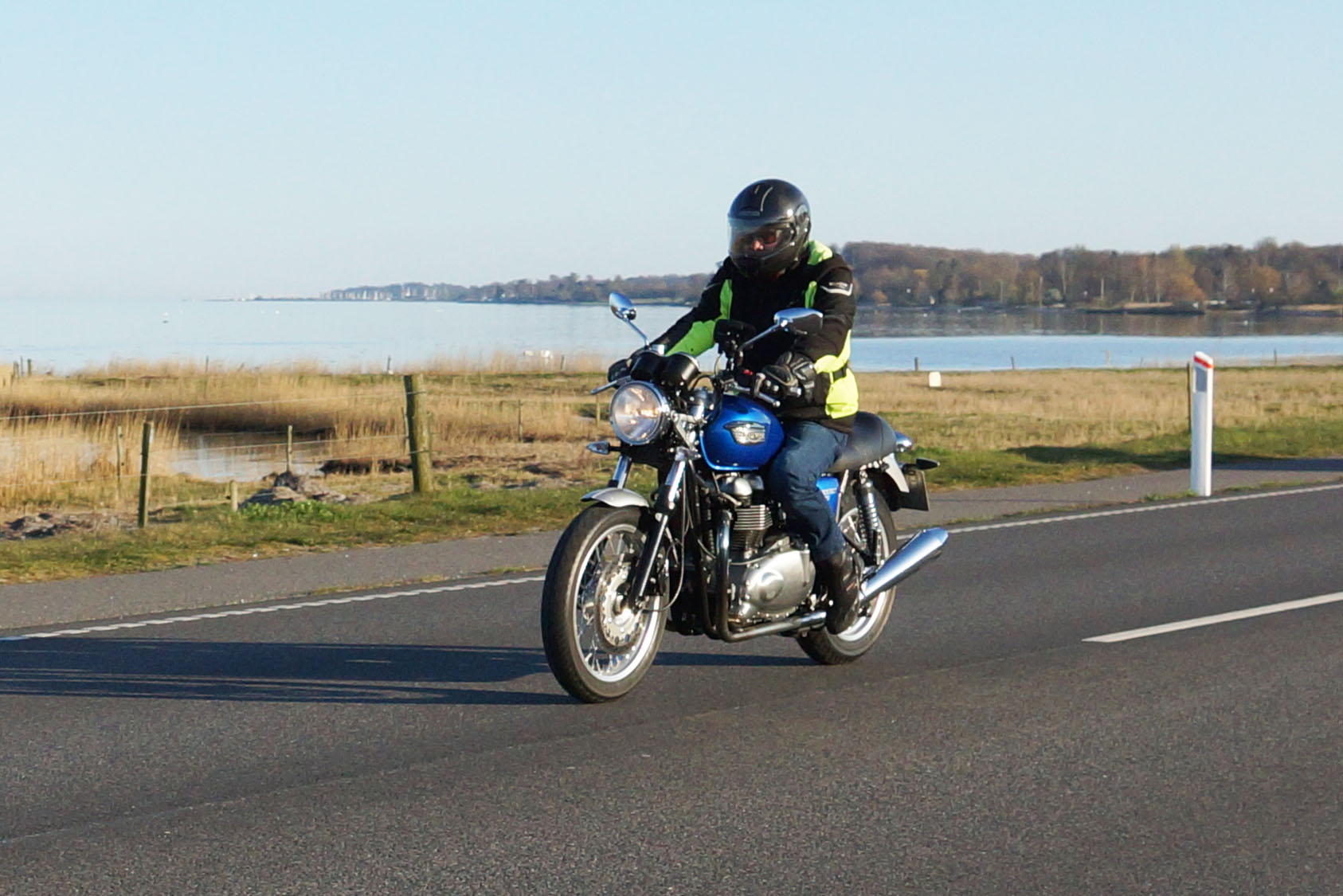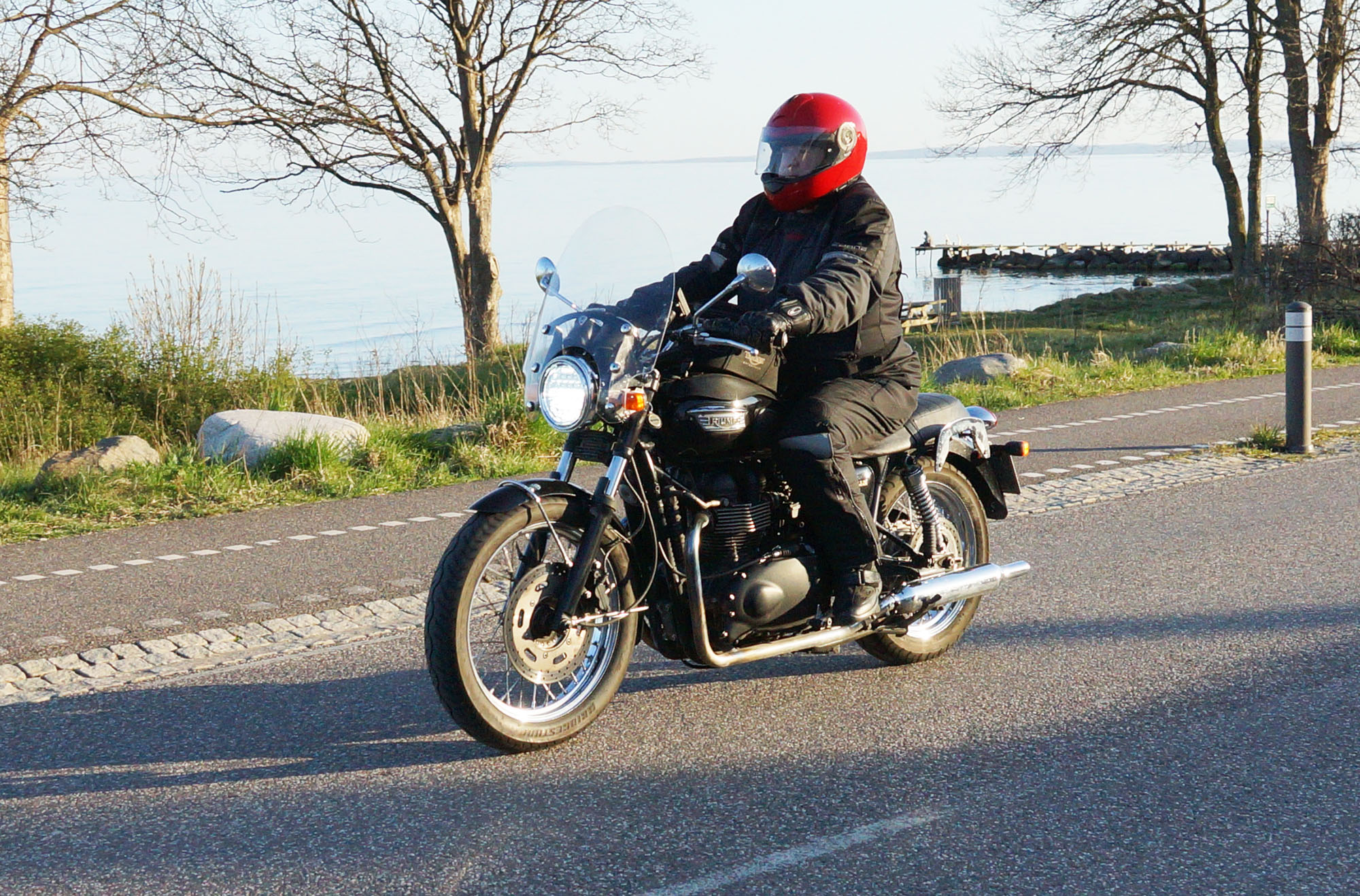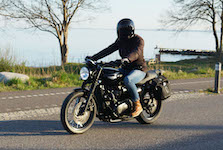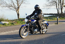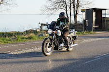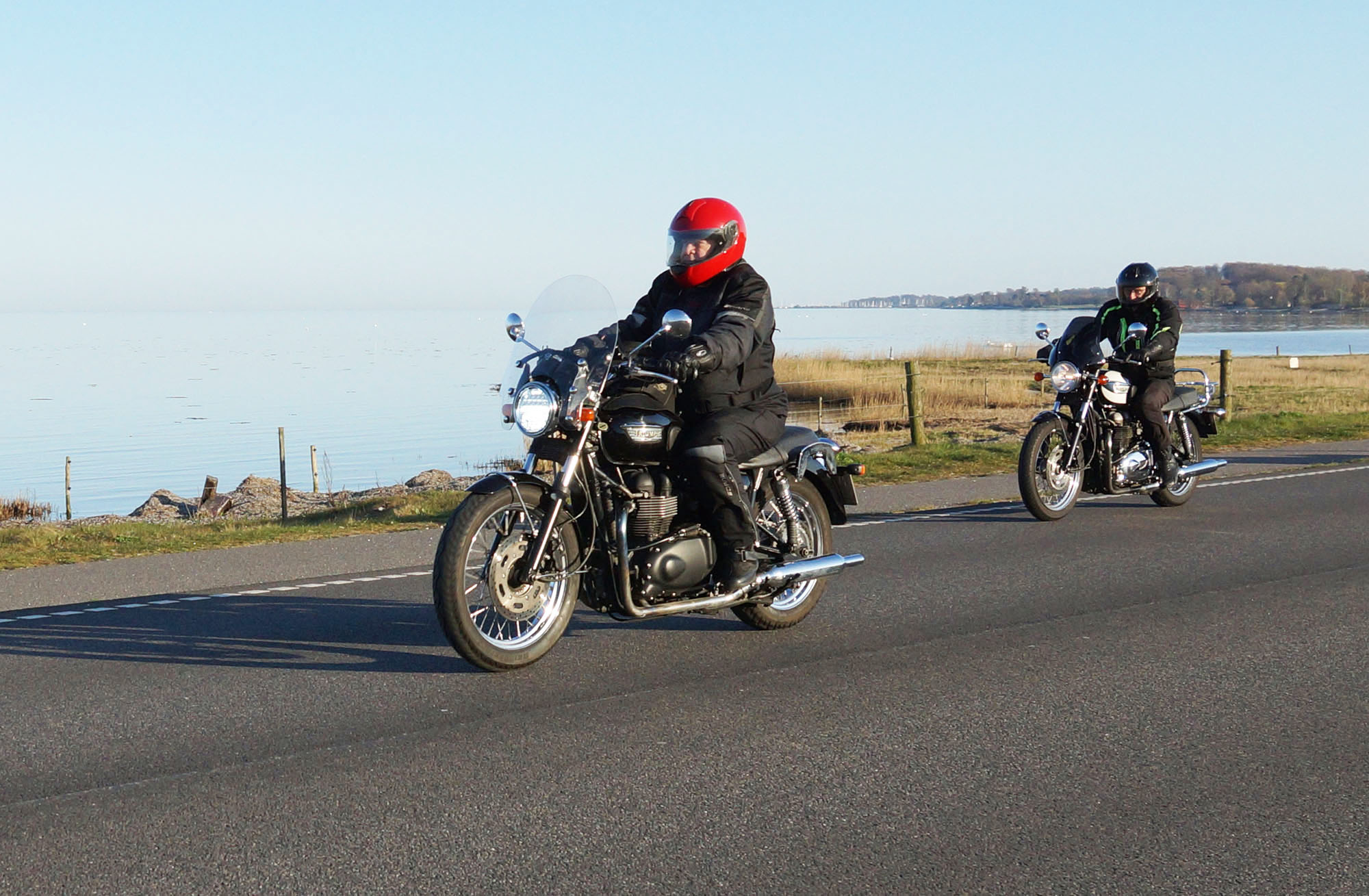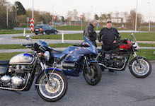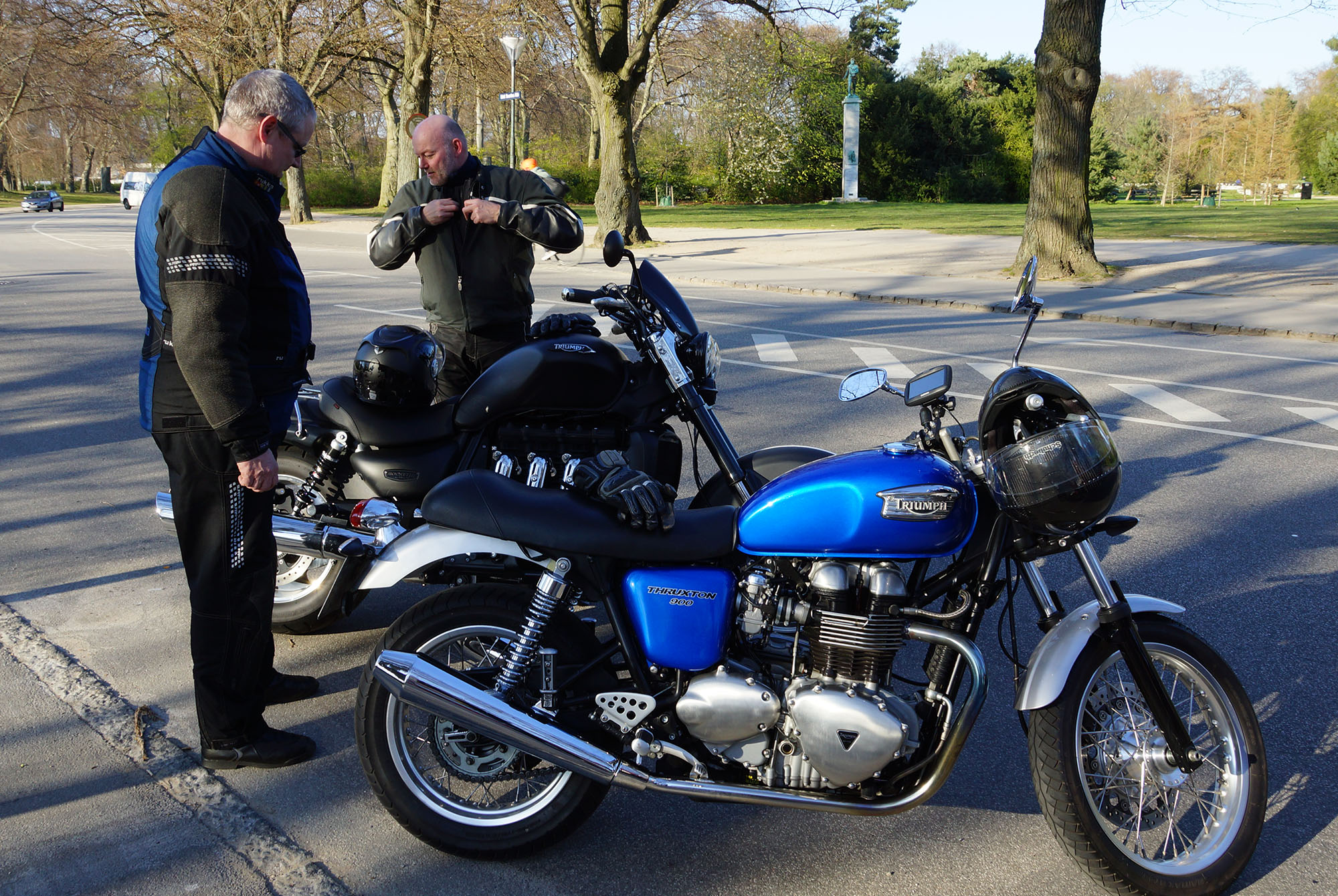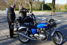 Niels-Jørgen på en sort-hvid Bonneville T100 -05, Henrik på en blå-hvid Bonneville T100 -02,