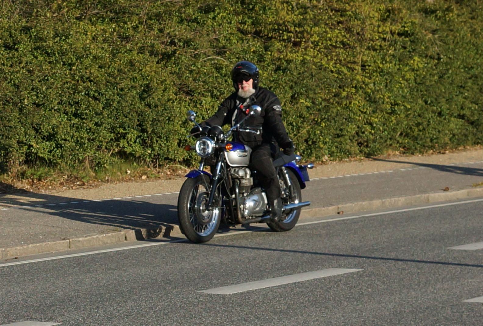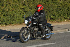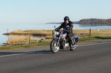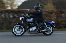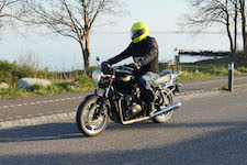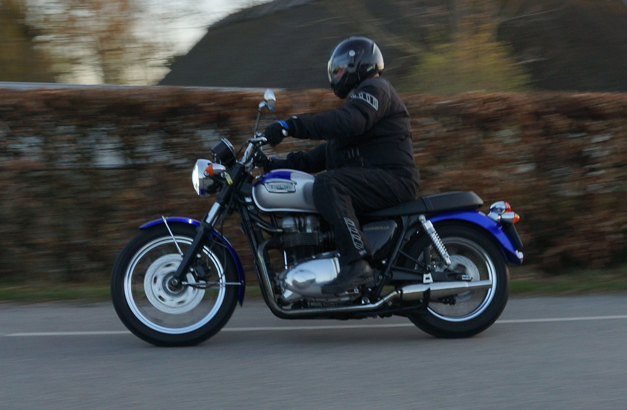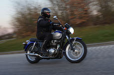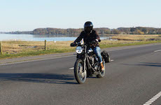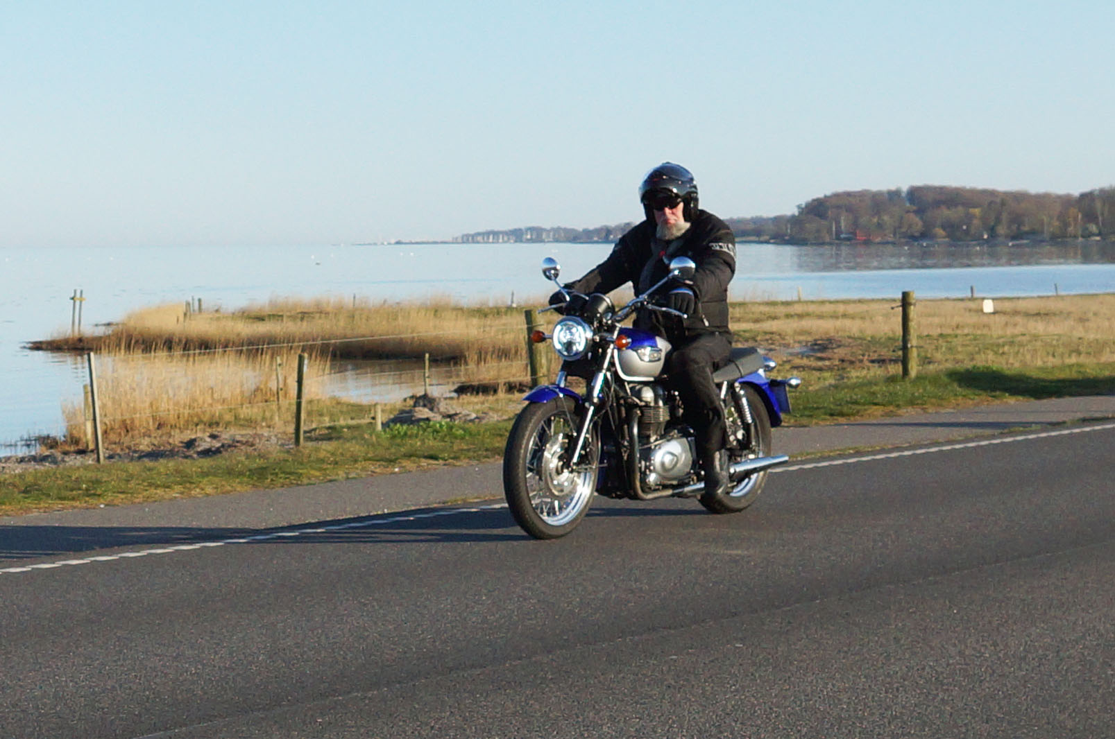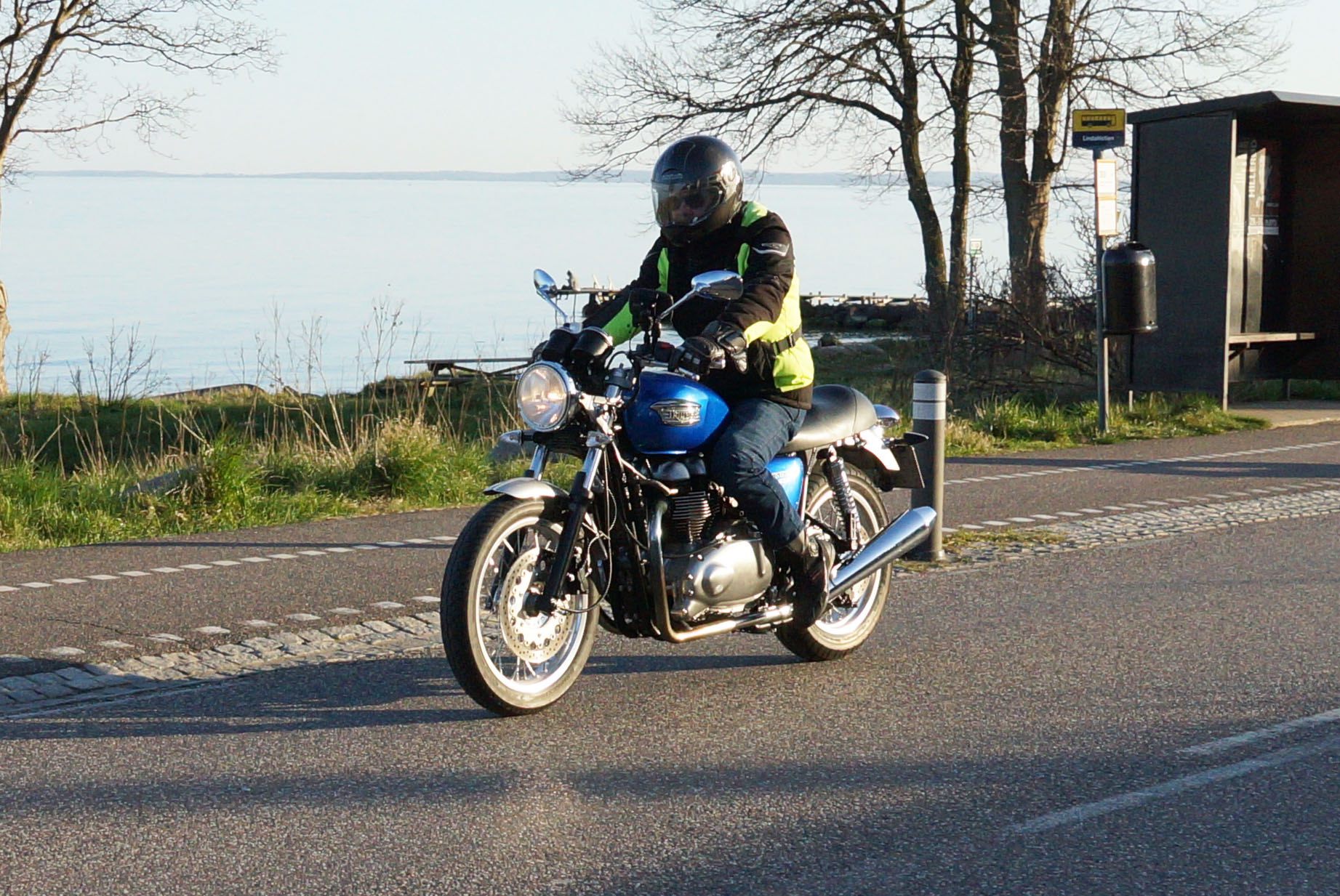 Niels-Jørgen på en sort-hvid Bonneville T100 -05, Henrik på en blå-hvid Bonneville T100 -02,